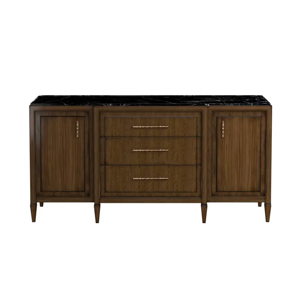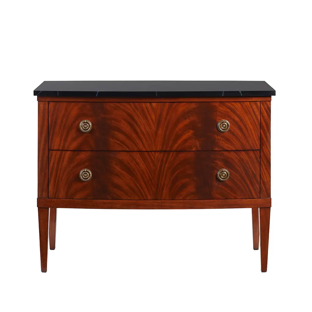 Our Manuel chest is a classic 19th century form rooted in the Empire period of the late 19th century. This versatile piece pairs a clean silhouette, with a subtle curved profile and a rich book matched mahogany veneer. The honed marble top along with brass ring door pulls make for the perfect finishing touches. Ships In 4-5 Weeks Brass hardware Honed Black Marble top Mahogany finish This image is for illustrative purposes only. The colors shown are accurate within the constraints of lighting, photography, and the color accuracy of your screen.