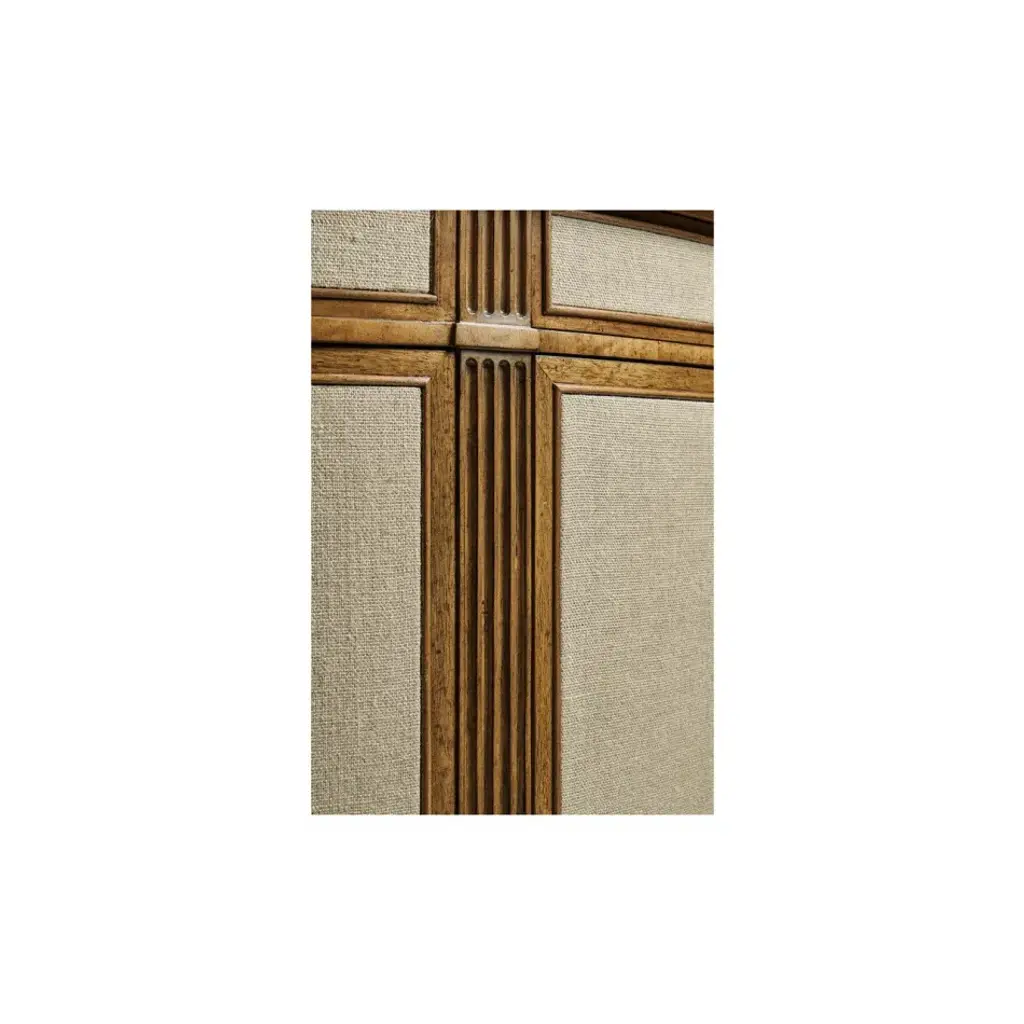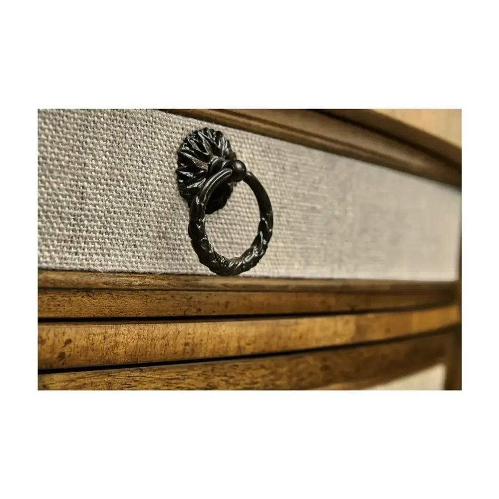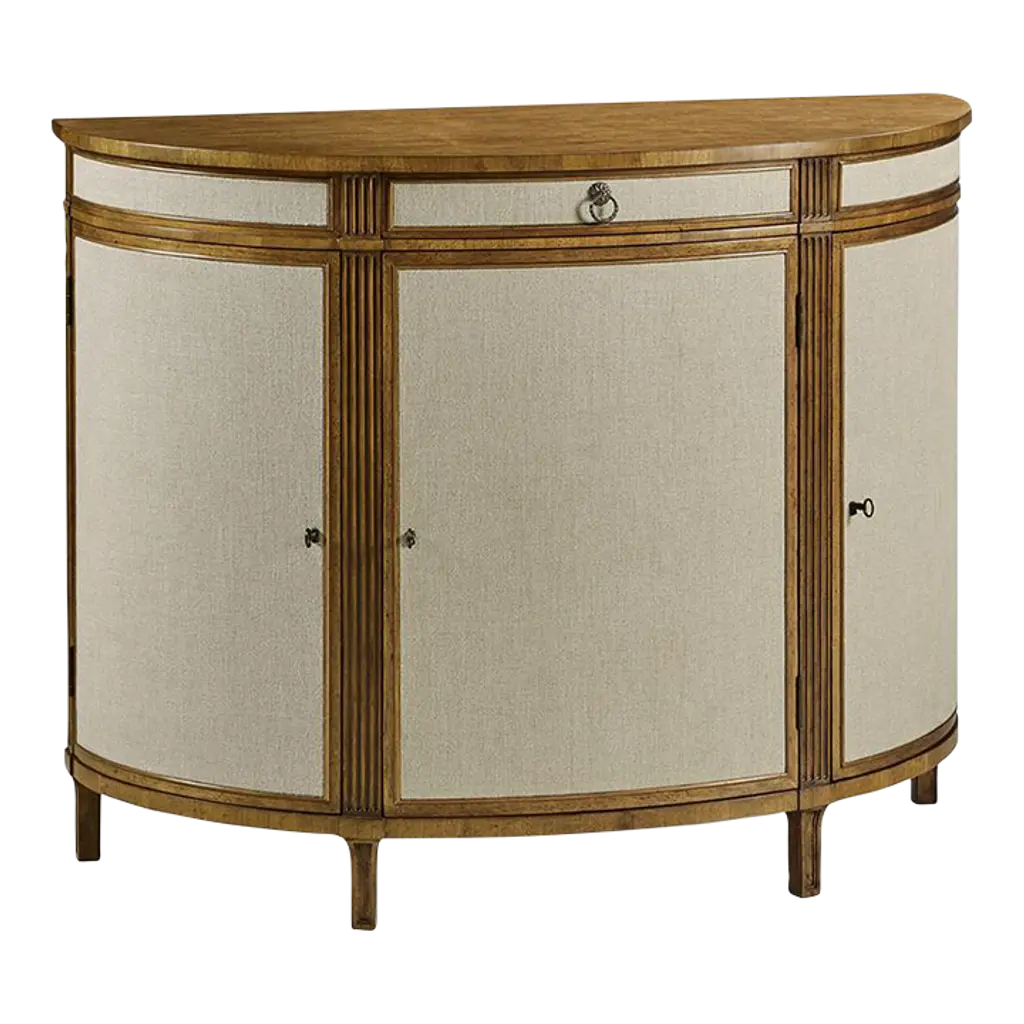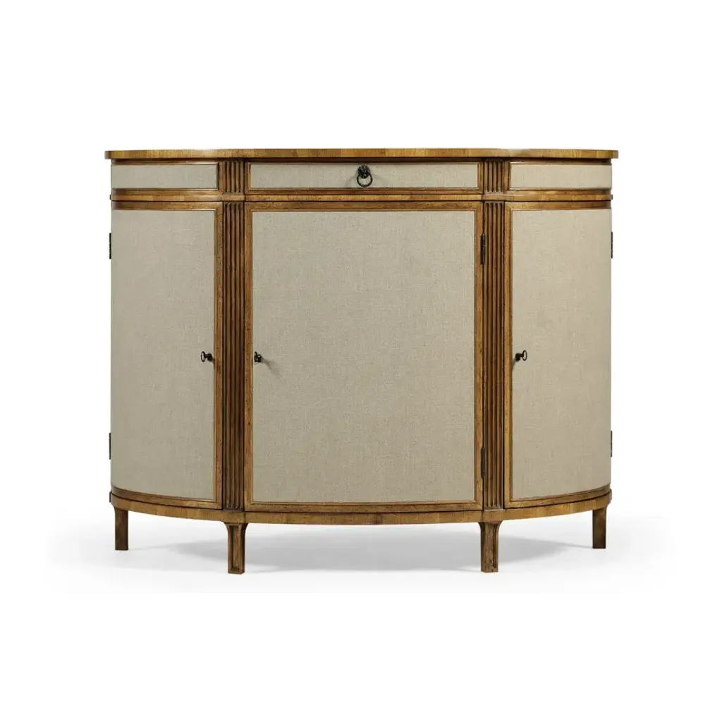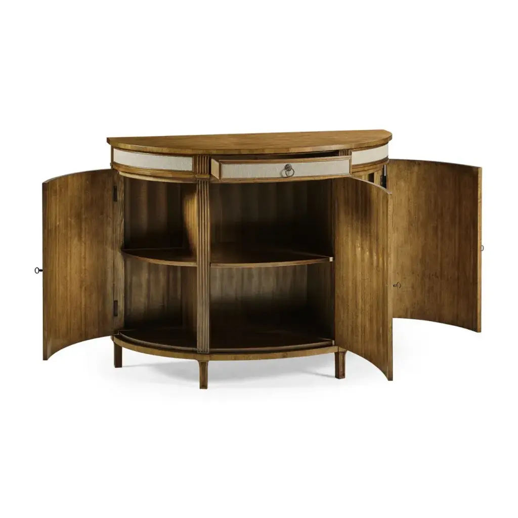 493076-FWA-GFA The Inductance Demi Lune from Jonathan Charles evokes the feeling of summers in the South of France and balmy rides in vintage convertibles. A solid case with Kravet Linen fabric cabinet doors and understated hardware is capped with a single drawer under a Grey Fruitwood top. Hovering a few inches above the floor on handsomely tapered feet with traditional accents, Inductance plays well with sophisticated spaces and vintage interiors.