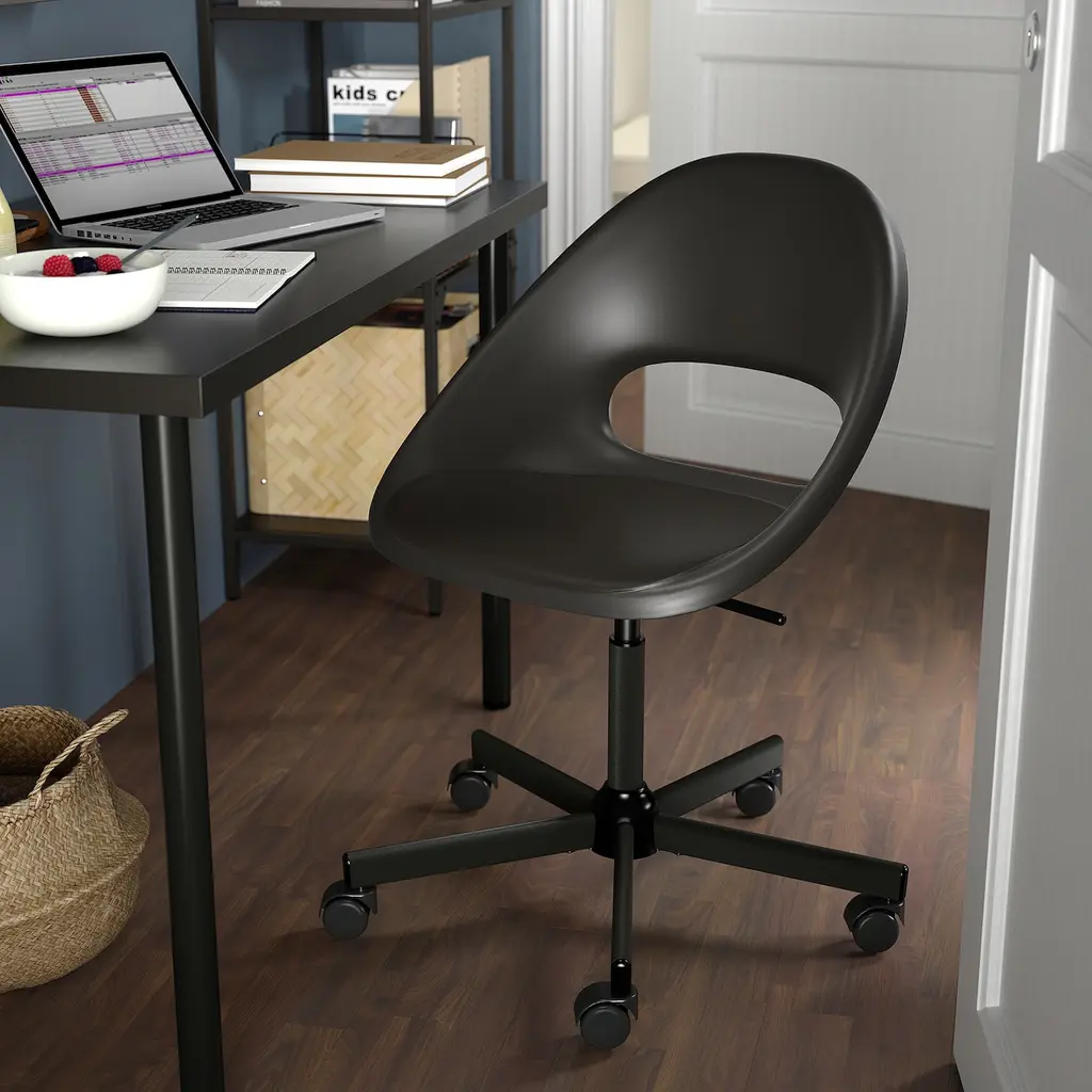 LAGKAPTEN/ELDBERGET / VITTSJÖ Desk and storage combination - and swivel chair black-brown/dark gray. A simple unit can be enough storage for a limited space or the foundation for a larger storage solution if your needs change. Adjustable feet; stands steady also on an uneven floor.