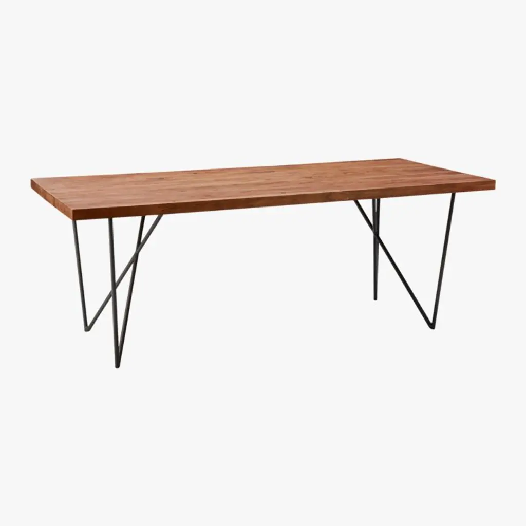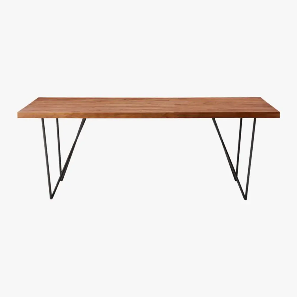 This upsized beauty is all about the rich grain of gorgeous acacia wood. Smooth wood planks sit on an architectural iron "W" base that's hand welded and powdercoated to match. Seats eight comfortably, ten if you must. Learn about Jonas Wahlström on our blog. CB2 exclusive.