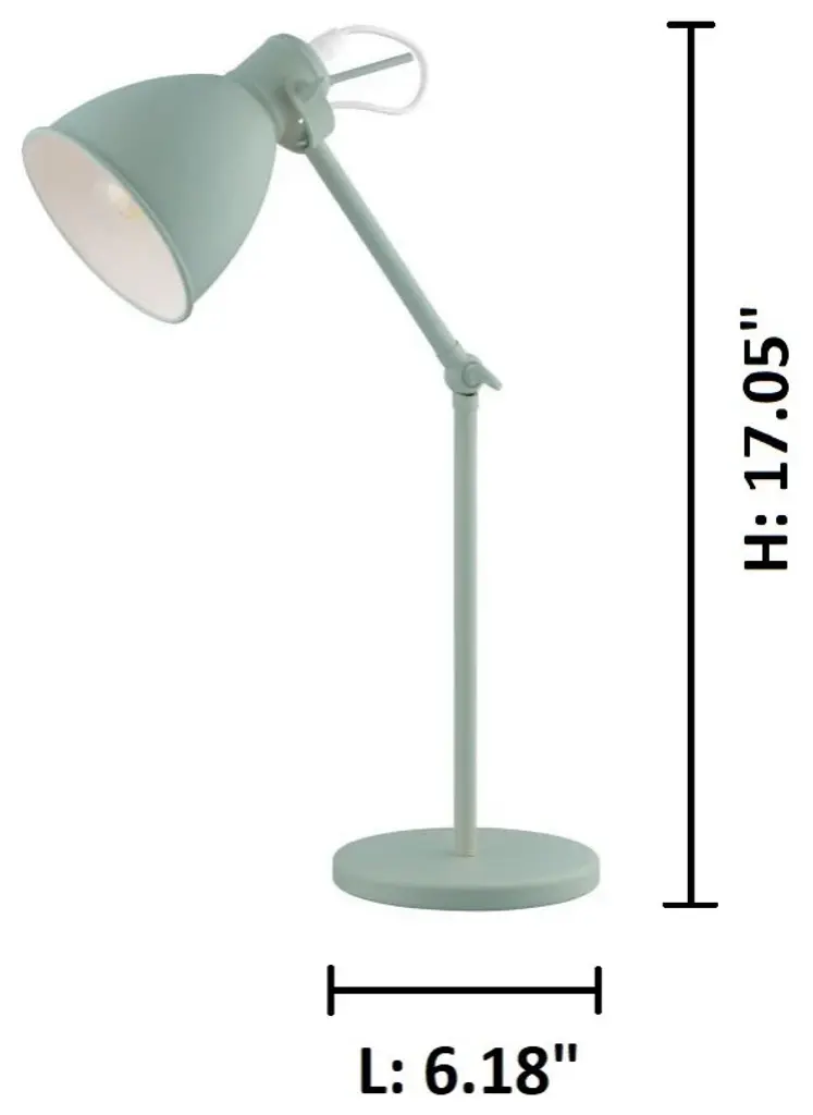 Bring a splash of color to your living space with the Priddy desk lamp by Eglo. Featuring a light green finish. With the adjustable head and arm you can direct the light just where you need it most. The Priddy desk lamp is ideal for a childrens room or college dorm roomBulb Type: A19Number of Bulbs : 1Bulbs Included: NoUL Listed: NoBulb Wattage: 40Hardwire or Plug: HardwiredBulb Type: A19Number of Bulbs : 1Bulbs Included: NoUL Listed: NoBulb Wattage: 40Hardwire or Plug: Hardwired