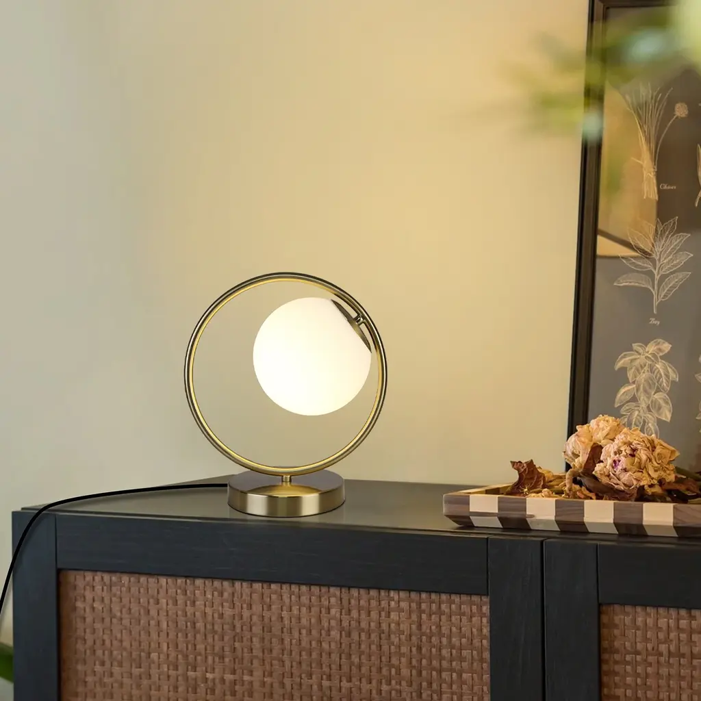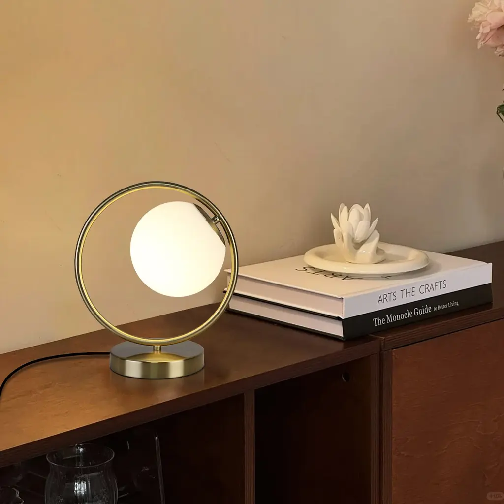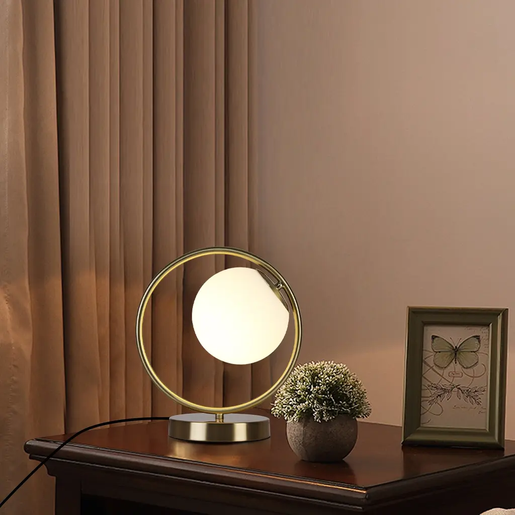 The table lamp for bedroom is a stylish and versatile addition to any décor. Effortlessly complementing diverse design choices, it harmonizes beautifully with modern, vintage, contemporary, and other styles. The bedroom lamps for nightstand standout feature is the frosted acrylic globe, Its lampshade is wrapped with a round metal frame, like a round full moon that sets it apart and sparks conversations. Moreover, its user-friendly design and adaptability make it a seamless fit for various settings, from living rooms to offices. Stylish and unique aesthetic lamp is a great gift choice for family, lover, friends, colleagues, business partners and children. Suitable for Valentines day decoration, birthdays, housewarming, Thanksgiving, Christmas and anniversaries. Add a touch of warmth, romantic and comfort to your home.Features