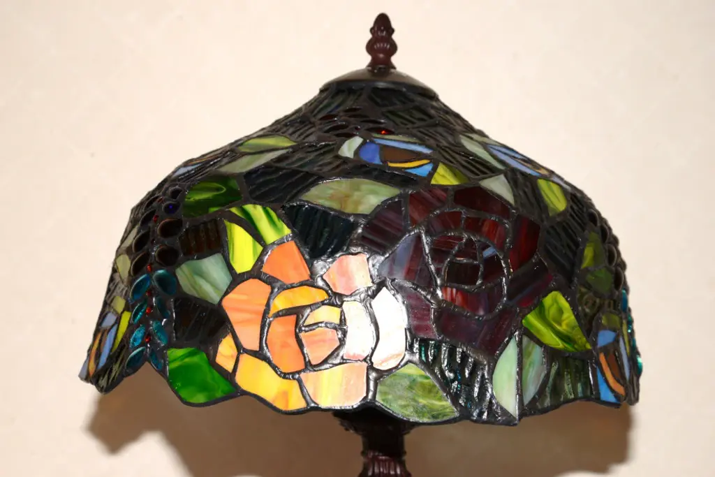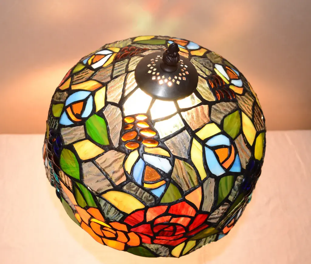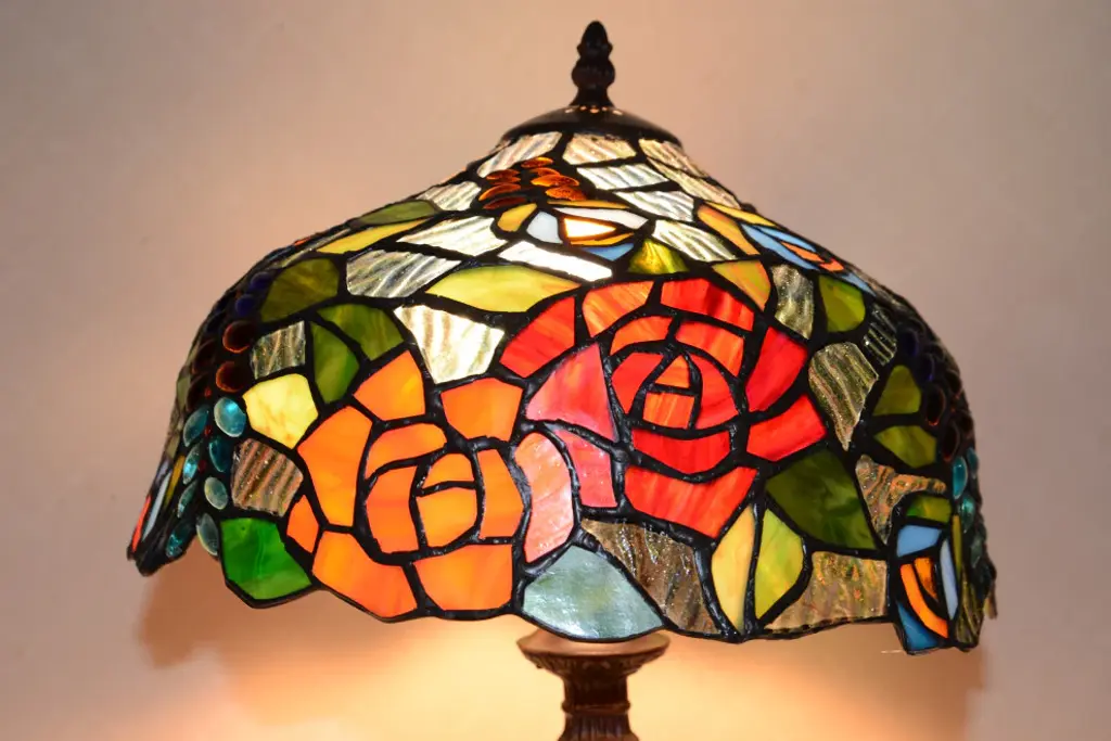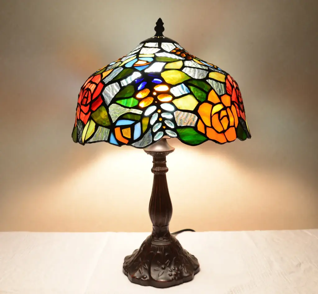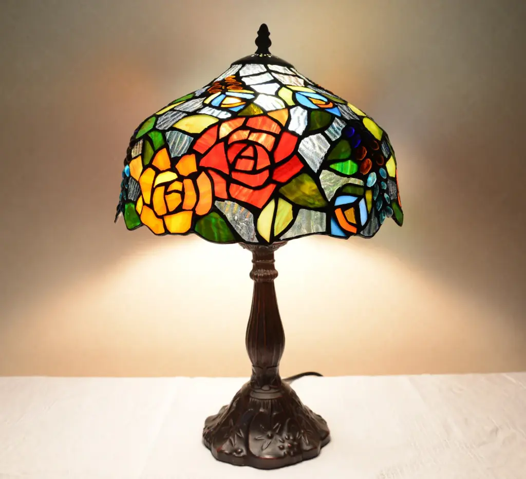 12" W Rose Flowers Stained Glass Handcrafted Table Desk Lamp, Zinc Base