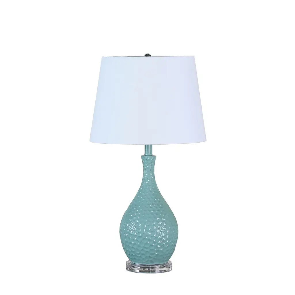 A bit of an upgrade to your traditional 14.17" table lamp! The ceramic tear drop shaped base has an evenly distributed thumbprint like texture throughout, and in the color of your choice. All options are paired with a complimenting white fabric shade to top off this ideal piece in your living room, dining room, bedroom or even kids' room!