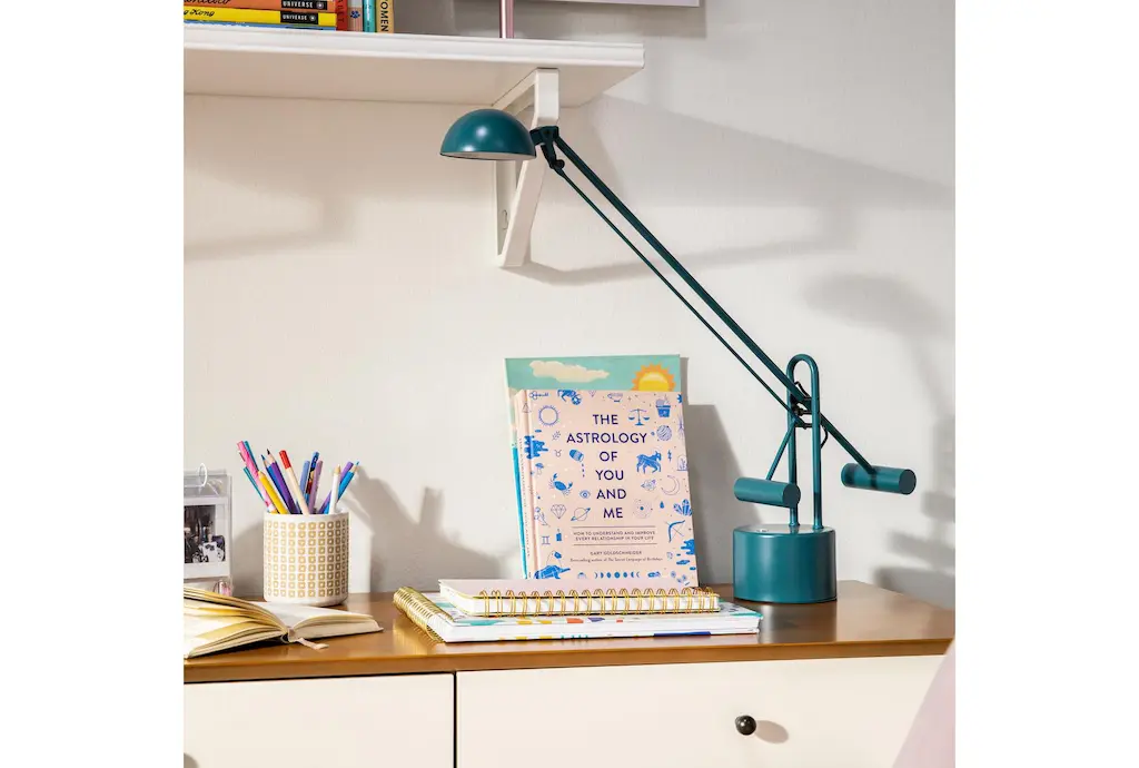 Illuminate your workspace with the 28 Inch Pacific Blue Metal Cantilever LED Desk Task Lamp with Memory Dimmer. This modern lamp, crafted from durable metal, features a sleek blue finish that adds a touch of contemporary style to any setting. Its adjustable cantilever design and integrated LED lights provide optimal lighting for any task, while the memory dimmer function allows you to customize the brightness to your preference.