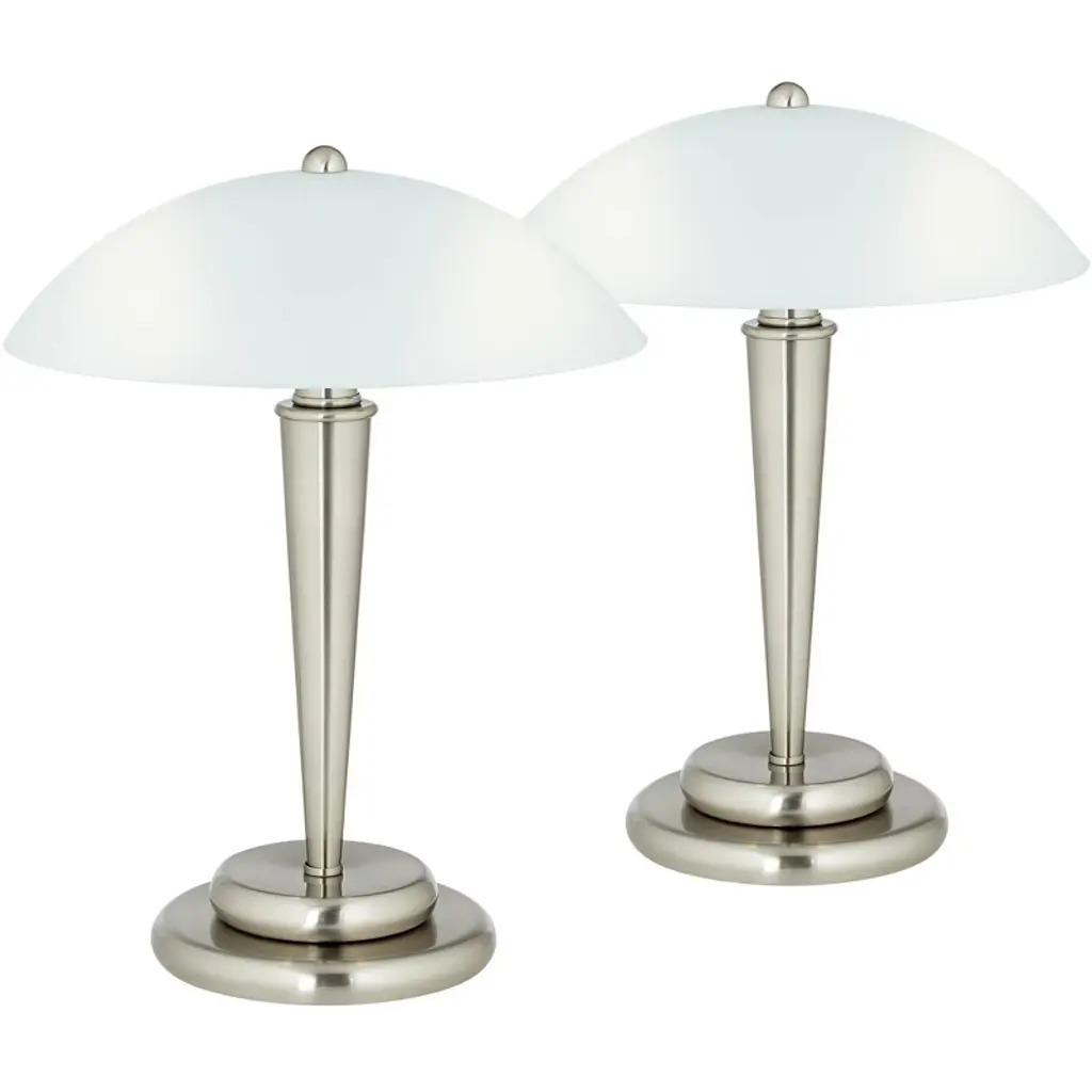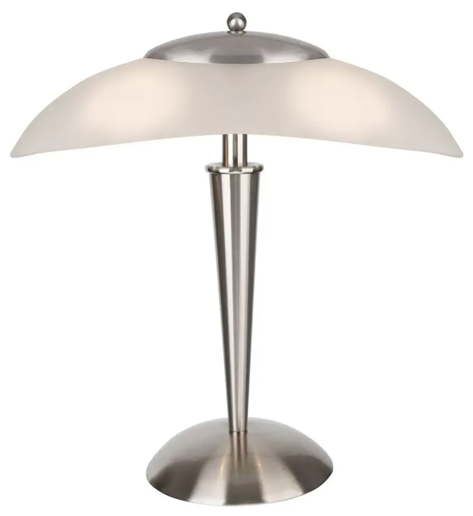Aspen Creative is dedicated to offering a wide assortment of attractive and well-priced portable lamps, kitchen pendants, vanity wall fixtures, outdoor lighting fixtures, lamp shades, and lamp accessories. We have in-house designers that follow current trends and develop cool new products to meet those trends. Product Detail• Satin Nickel Finish with Glass Shade• 16 1/2" wide x 17 3/4" high• On/Off touch sensor on metal surface, Uses 2 E12 base light bulb, 40 watt max, Light bulb not included• UL listed for indoor, dry location.