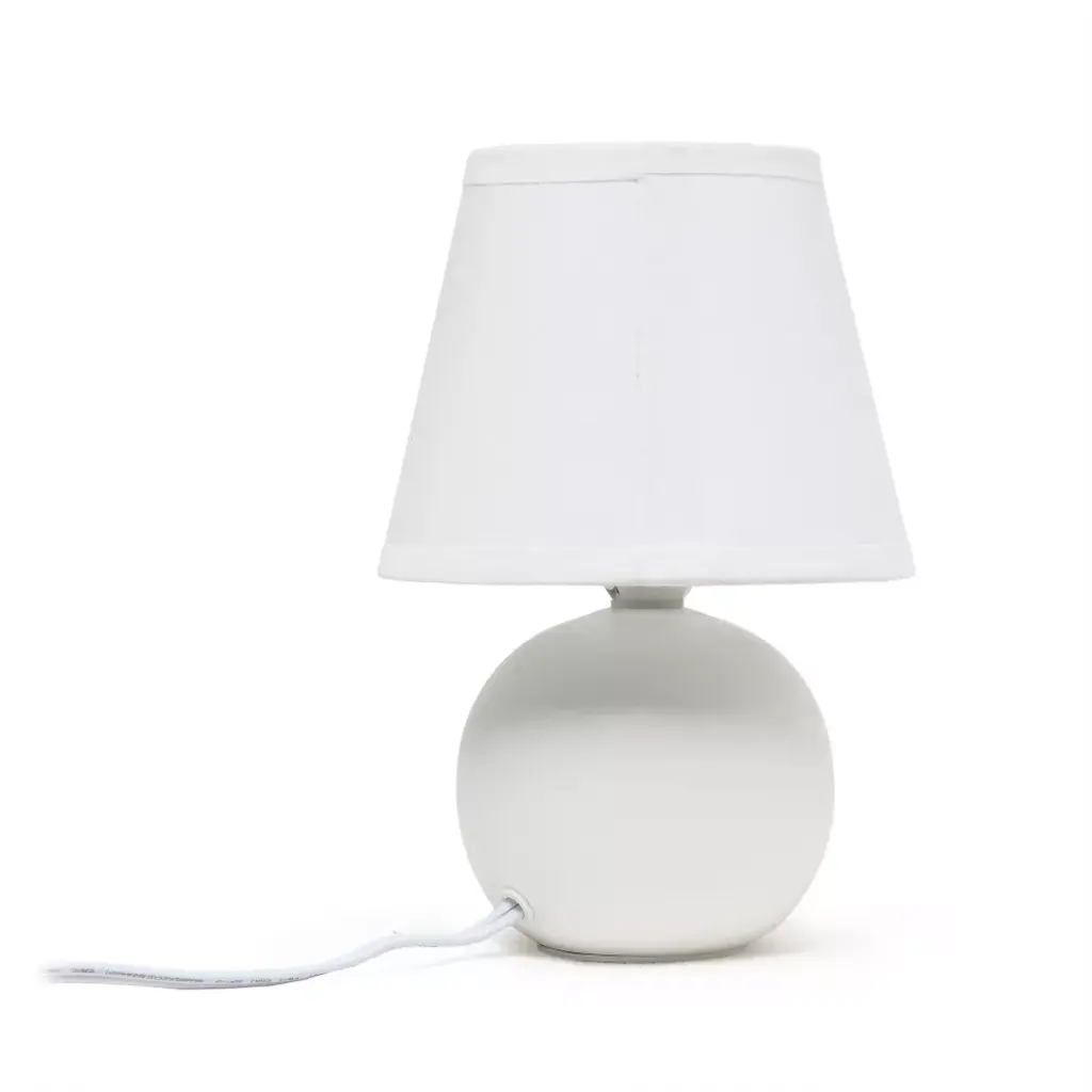 A petite 8.66" table lamp made primarily of ceramic with its base in the shape of a round orb sits beneath a matching colored tapered fabric shade for an overall effortlessly styled lamp suited for both your decor and lighting needs. A number of color options are available in this style, to compliment your decor just right.