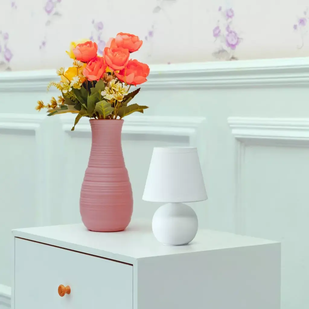 A petite 8.66" table lamp made primarily of ceramic with its base in the shape of a round orb sits beneath a matching colored tapered fabric shade for an overall effortlessly styled lamp suited for both your decor and lighting needs. A number of color options are available in this style, to compliment your decor just right.
