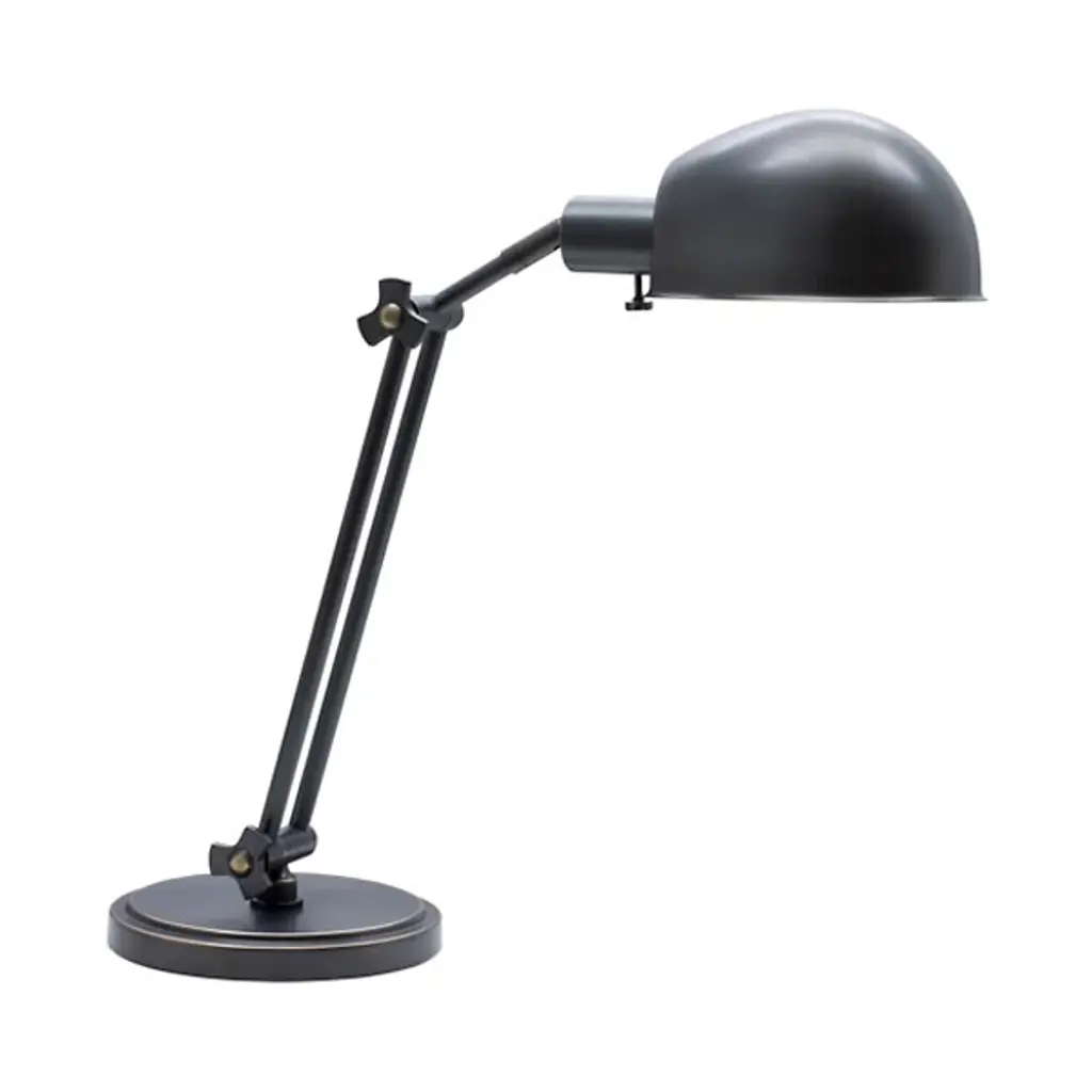 Light up your workspace in style with this Desk Lamp. Industrial detailing on the shade cup and joints elevate this classic task silhouette. A dark bronze finish provides a beautiful contrast to a warm antique brass finished metal shade. With three adjustable joints, it is easy to direct the light exactly where it is needed. Features: Antique Bronze with Brass Accents Finish Adjustable at 3 points Requires 40-Watt Standard Bulb or LED equivalent (not included) 60-inch Cord On/Off Rotary Switch ETL Listed Title 20 Compliant: No E26 Medium Base Some Assembly Required 1-Year Limited Manufacturer Warranty Measurements: Width: 6-inch Height: 18.5-inch Extension/Depth: 10-inch Weight: 5.52lbs Shade Dimensions: 6" Dia. X 4.75"H Base Measurements 3'' H x 7'' W x 7'' D