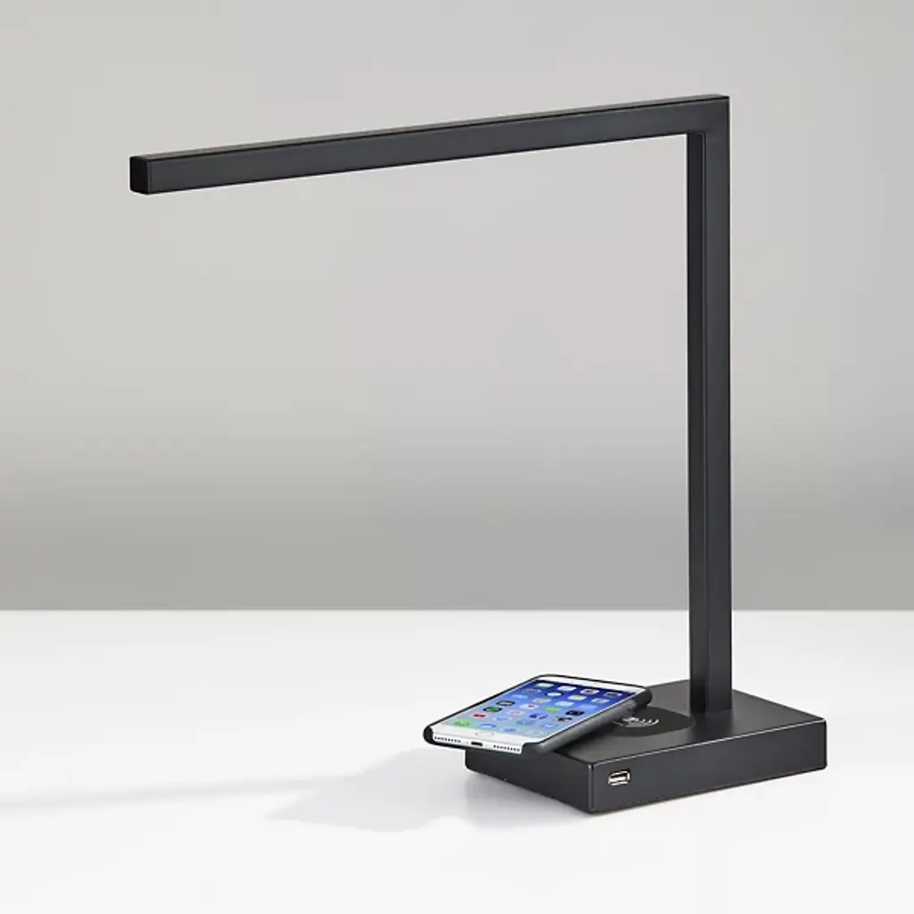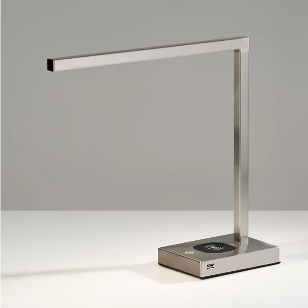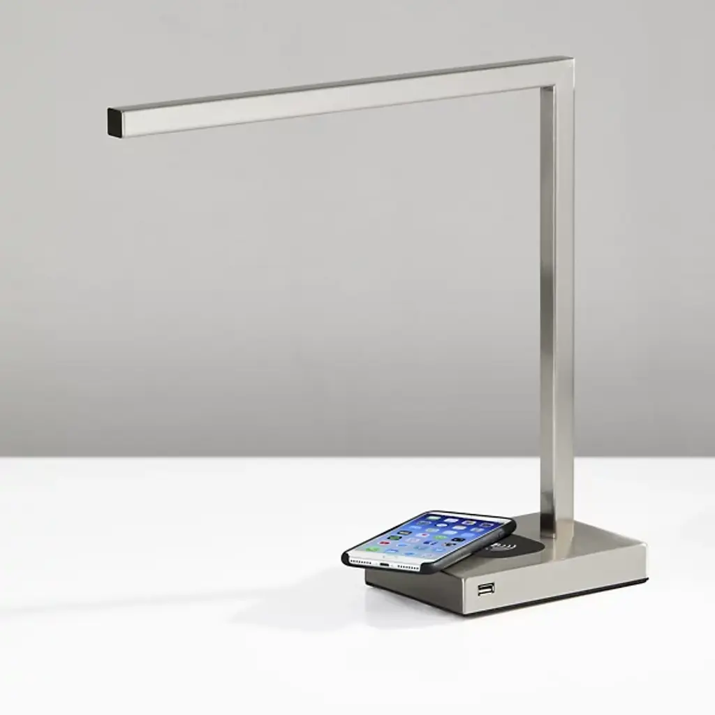 A sleek modern piece, the Aidan Charge LED Desk Lamp from Adesso uses smooth metal and sharp angles to create a minimalist beauty in the space. The rectangular base upholds a slim body that turns at a ninety-degree angle. An integrated LED provides a bright and focused glow, while the base contains the added function of doubling as a wireless charging pad. An additional USB port is included on the side for charging of a second device.
