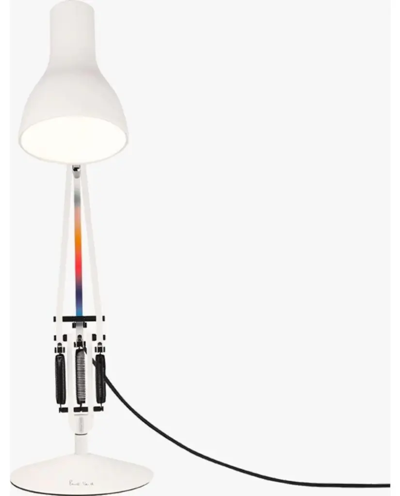 Renowned for his mastery of colour Editions Five and Six are the first to bear the Paul Smith Artist Stripe and offer a sophisticated pared back finish. These are the only lamps in Anglepoise''s eight-year relationship with Paul Smith that feature the iconic coloured stripes. Elegant fun and just a little bit eccentric: the Anglepoise + Paul Smith Edition 56 is here. For the first time Paul Smith''s Artist Stripe meets Sir Kenneth Grange''s Type 75 design to dramatic effect. With a full black colour drench - save for stripe - the Edition 5 is a new creative approach for our collaboration. The new Edition Six in white designed to accompany the all black Edition Five adds the Paul Smith Artist Stripe to Sir Kenneth Grange''s classic Type 75 silhouette. With its milk white finish and pastel graduated stripe the Edition Six is a softer take on the Edition Five''s bold bright Artist Stripe and full black colour drench.Specification:Satin painted finishAluminium shade and armsIntegrated shade switchBlack Nickel plated fittingsCast iron base with aluminium cover