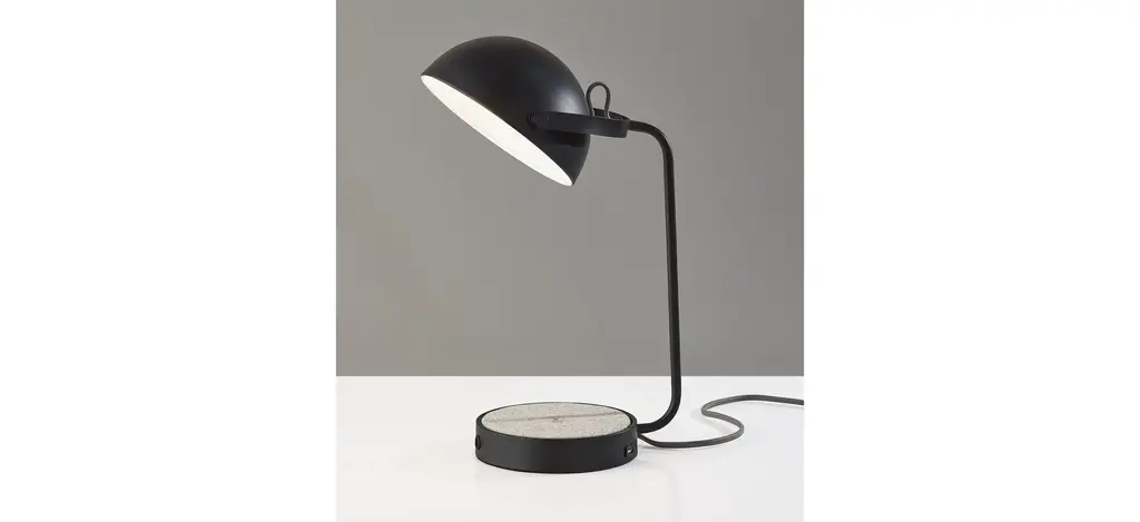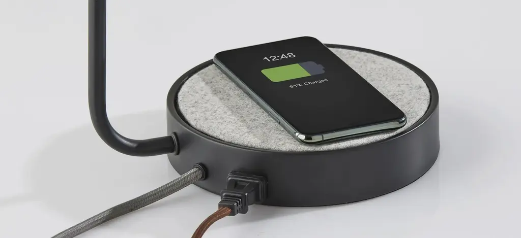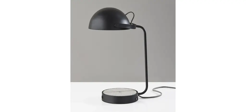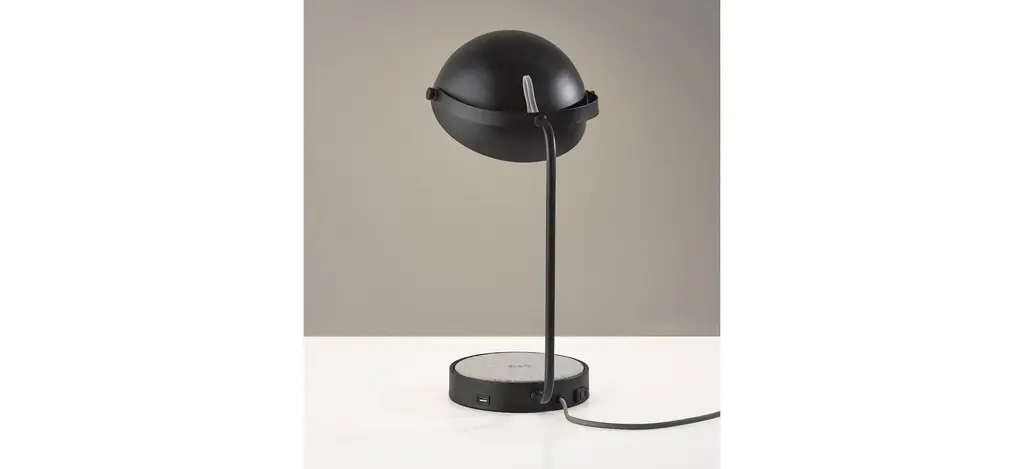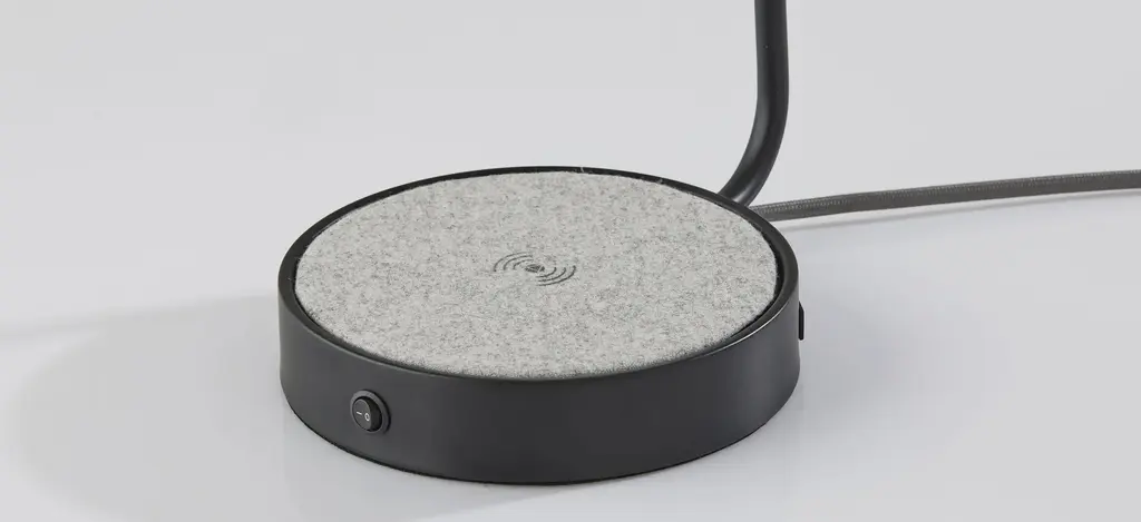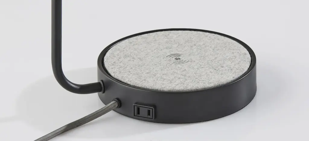 Form meets function with this stylish Brooks wireless charging desk lamp. The understated fabric wireless charging pad is built into the base and features Qi inductive charging technology. Just place your compatible smart device on the pad for simple, cord-free charging and easy access to your phone. The AdessoCharge pad supports 5W charging on contact with the charging pad, which charges your phone from 0% to 100% in just 34 hours, depending on your phone model. In addition to this cutting edge technology, the base also includes a USB port as well as an AC outlet in order to charge multiple devices at once. With an 8" diameter metal dome-shaped shade and clean styling with a sleek finish, the 18" tall Brooks desk lamp is the ideal lighting and charging addition to your work space or bedroom. Turn this lamp on or off easily using the discreet switch located on the base. It is also powered by a 5' long cord covered in subdued fabric.