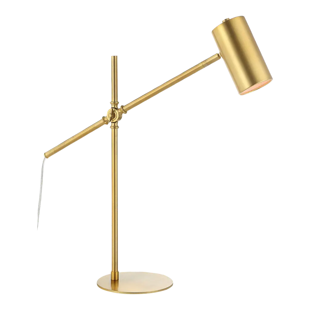When focusing on the task at hand is important, this contemporary desk lamp is a perfect choice. Besides being stylish, it is functional and will help you see the details better. Finished in a brushed gold and sitting on top of a thin metal base. The arm and shade can be adjusted. The cylinder shaped metal shade is finished with a smooth rolled edge opening. Dimensions: 25H, Shade 6H X 3 Dia. (in) Antique, vintage, designer floor samples & new products from one of the hottest Retail and To The Trade Home Furnishings showrooms in the country. Located in Chicago's chic Roscoe Village, Kenneth Ludwig Chicago carries the best offerings in furniture, accessories, artwork & textiles. Offerings are always fresh & always inspiring! Quite often ( due to a discontinued style, fabric or frame ) they must sell off their showroom floor samples. You receive first quality pieces at amazing prices. Check back weekly for new inventory added.
