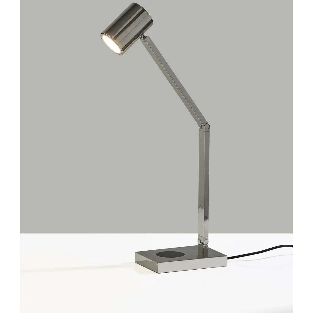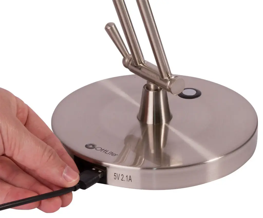 Bring a fashionable vintage look to your home with this Brushed Nickel LED Adjustable Desk Lamp. Classically styled, this desk lamp is super versatile as it also has a USB port to charge your electronic devices. Superior for its LED technology which is said to reduce eyestrain and increase comfort and clarity. This lamp has three color temperature modes and three brightness levels that all work with a touch sensitive button. It comes with four brightness settings with touch controls and a rounded diffuser that looks identical to a regular bulb. It has two adjustable knobs and a swiveling shade that you can adjust for your desired position. It includes a USB port as well so you can charge your electronic devices. It has a beautiful brushed silver nickel finish that looks exceptional great in a home office. 6.2" x 18" x 7.2"