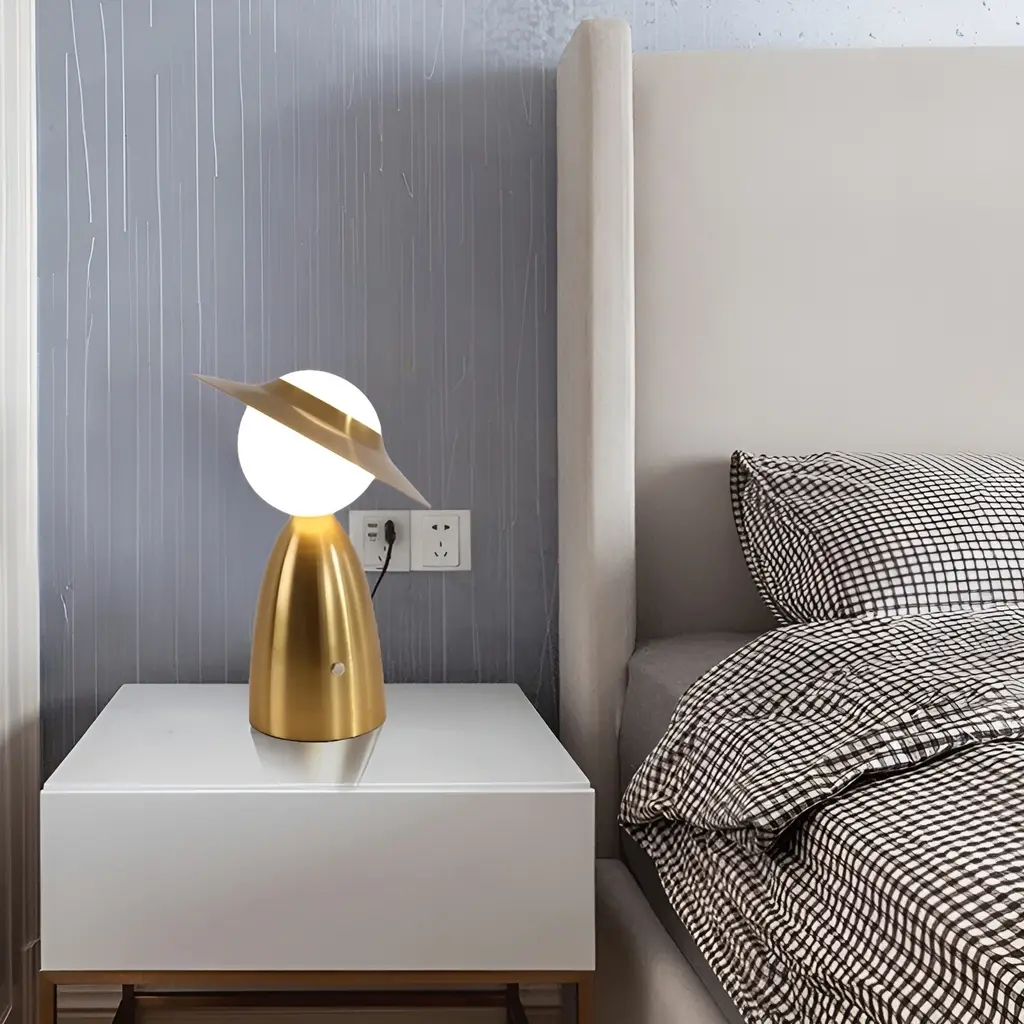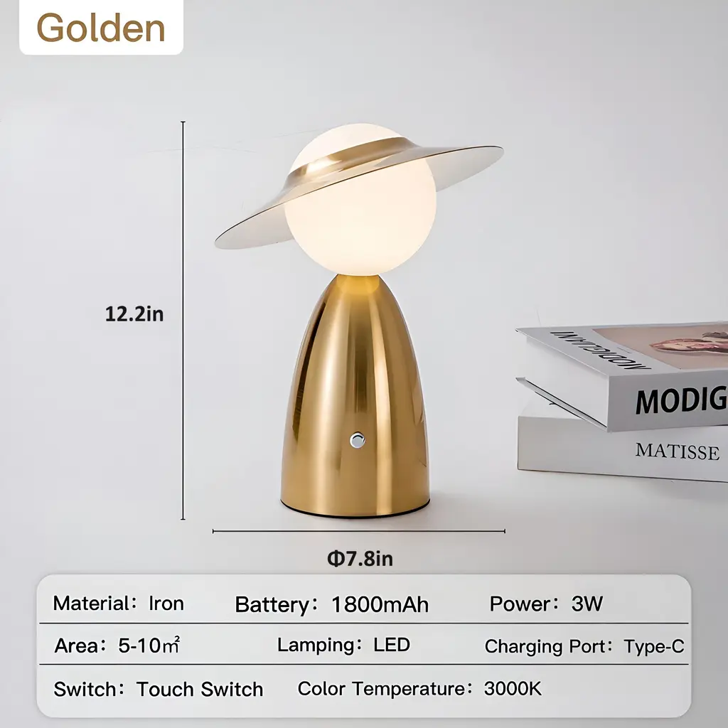 Experience the allure of the Nordic Luxury Desk Lamp - a beacon of sophistication and style for bedside, nightstand, or desktop adornment. With its elegant gold hat and glass ball design, this lamp exudes timeless charm.Crafted with high-quality aluminum and finished with exquisite electroplating, it radiates luxury from every angle. The touch sensor control switch offers effortless operation, while the warm 3000K light, with 3-level dimmable brightness, sets the perfect mood for any occasion.Powered by an 1800mAh rechargeable lithium battery, this lamp offers flexibility and convenience. With the included USB charging cable, you can easily power up your lamp anytime, anywhere. For added convenience, pair it with our USB charger station for simultaneous charging of multiple lamps.Elevate your space with the Nordic Luxury Desk Lamp - where elegance meets functionality in a harmonious dance of light and style.Key Features: