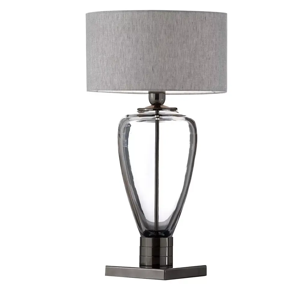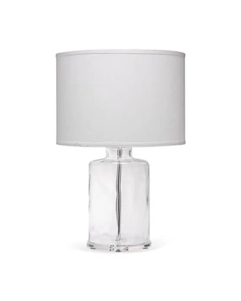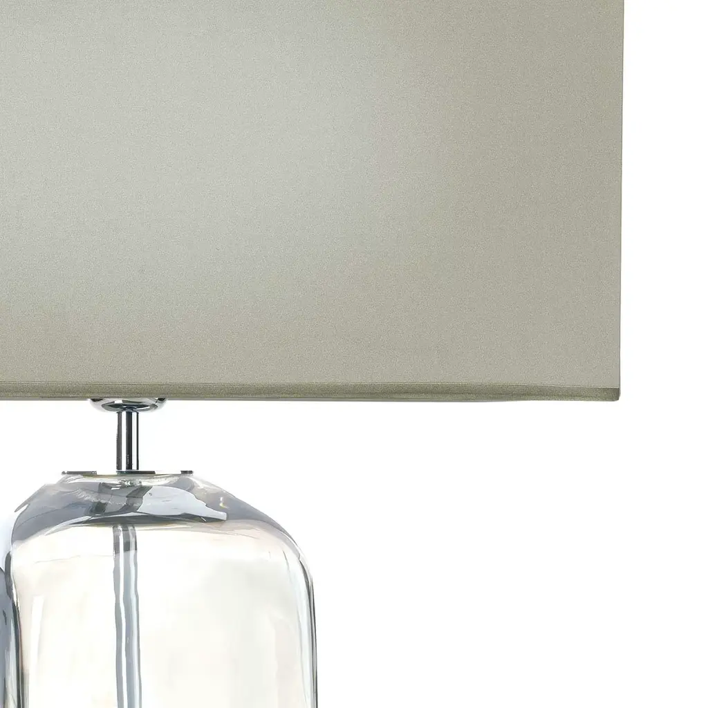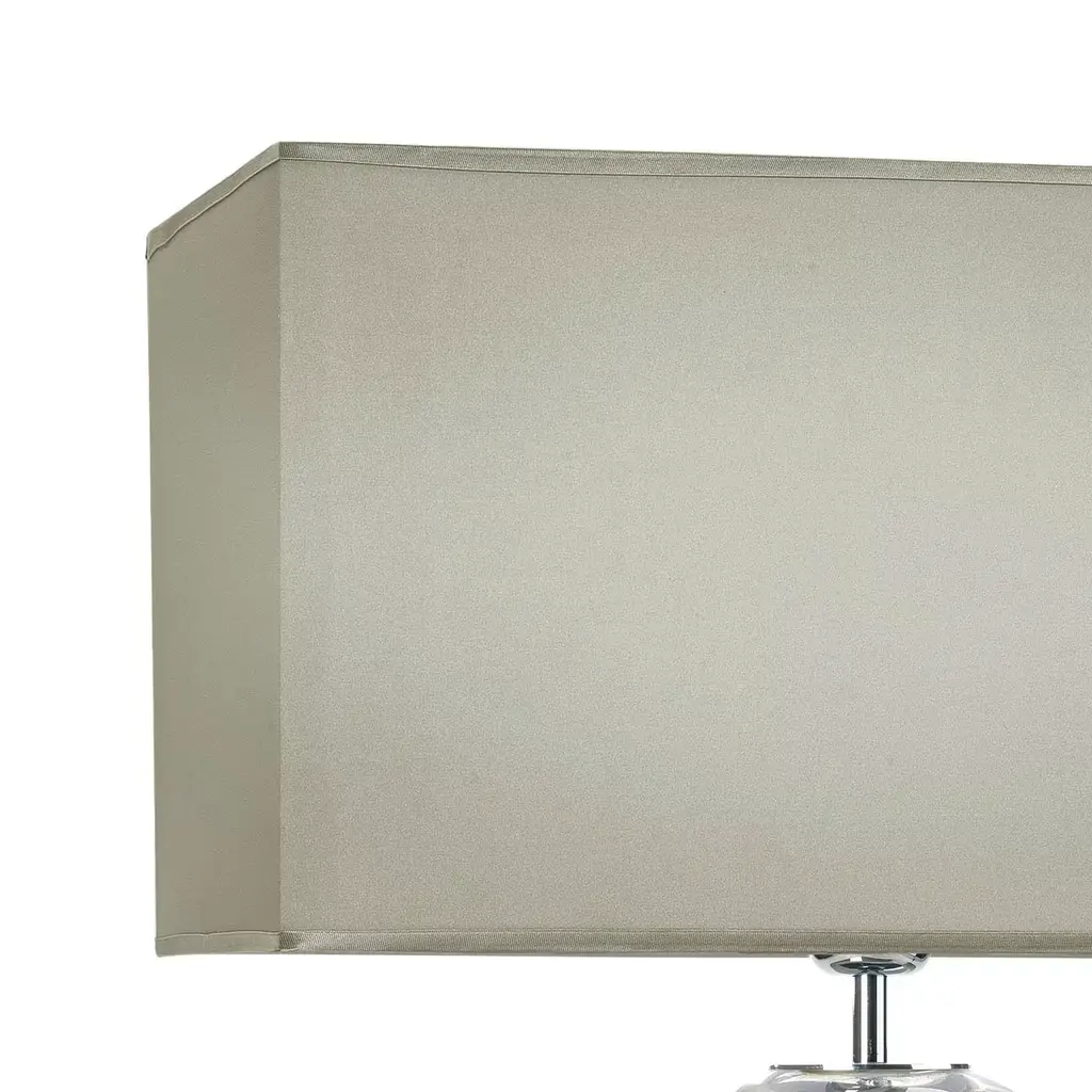 The chromed metal of the shaft of this lamp is visible through the transparency created by the glass container that envelops it. This striking base makes the fabric-covered rectangular shade above seemingly float in space and gives lightness to this piece, while creating unique effects when the lamp is lit, depending on its surroundings. With its neutral colors and transparent body, this lamp is an elegant addition to any room or entryway.