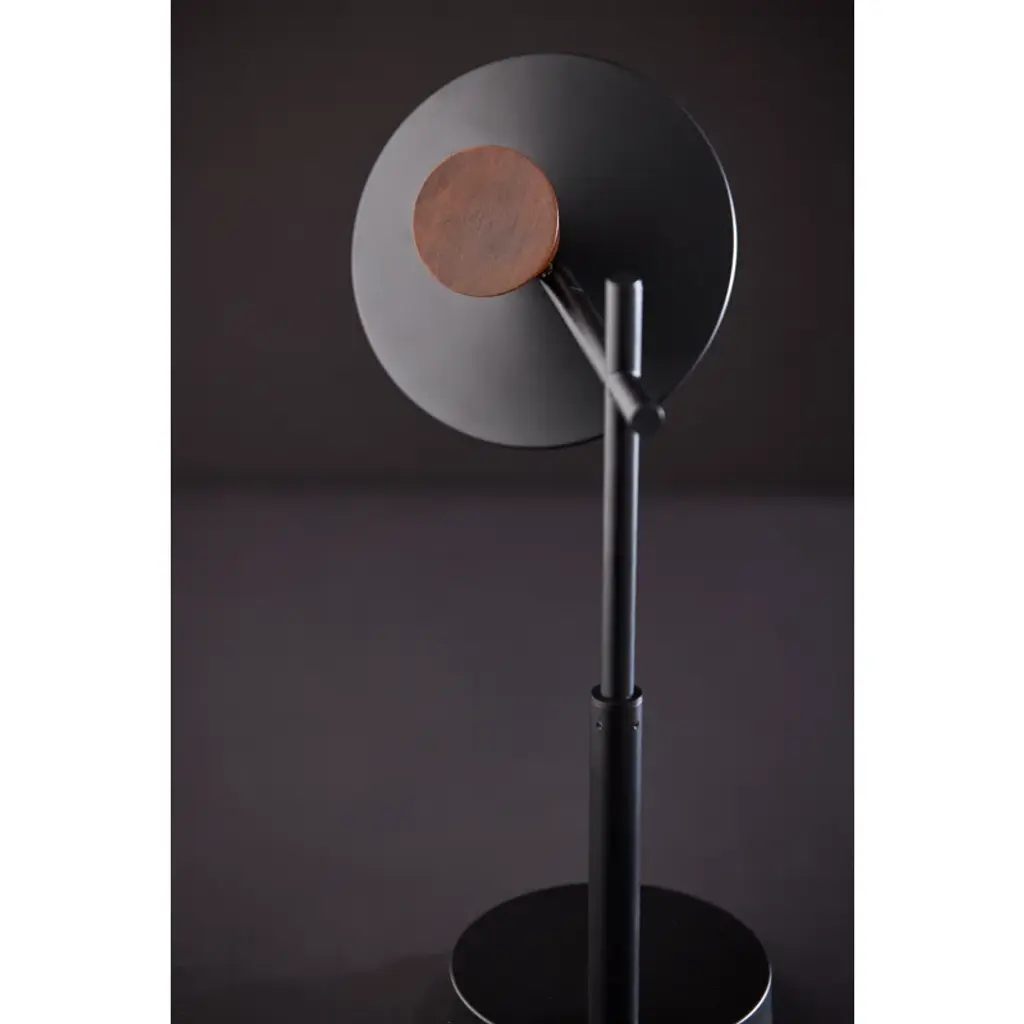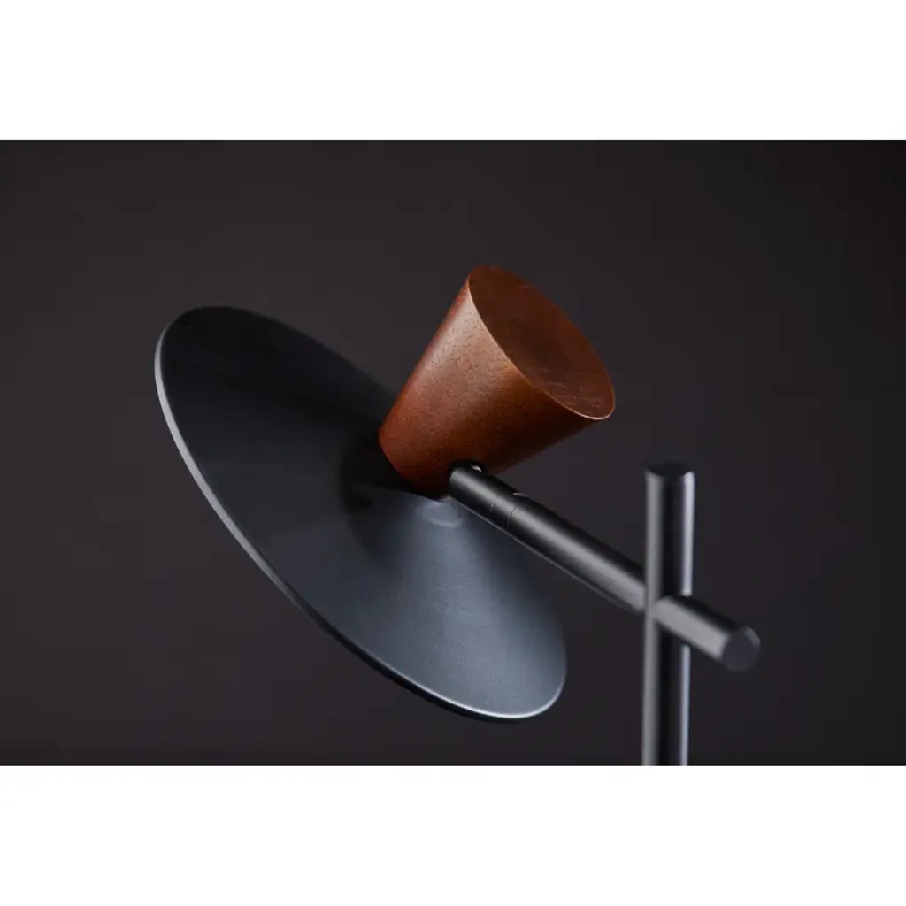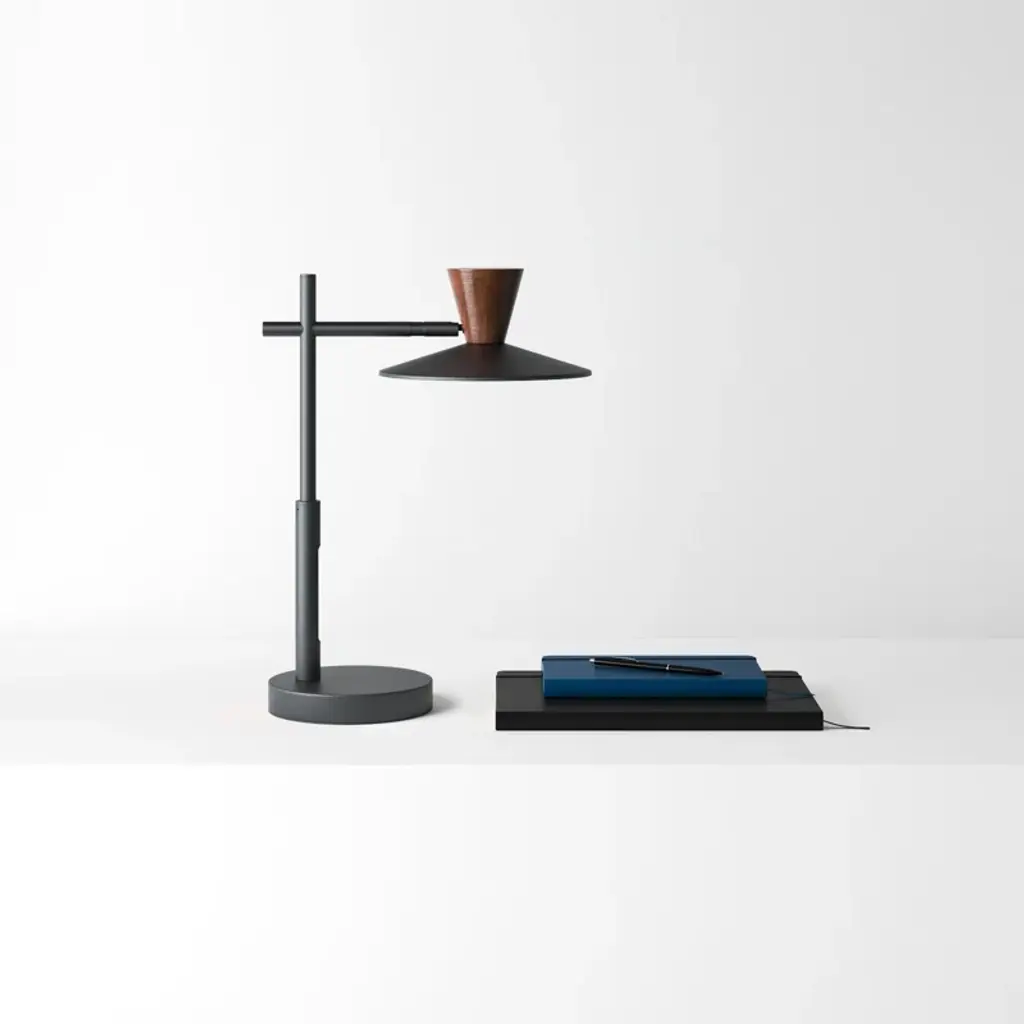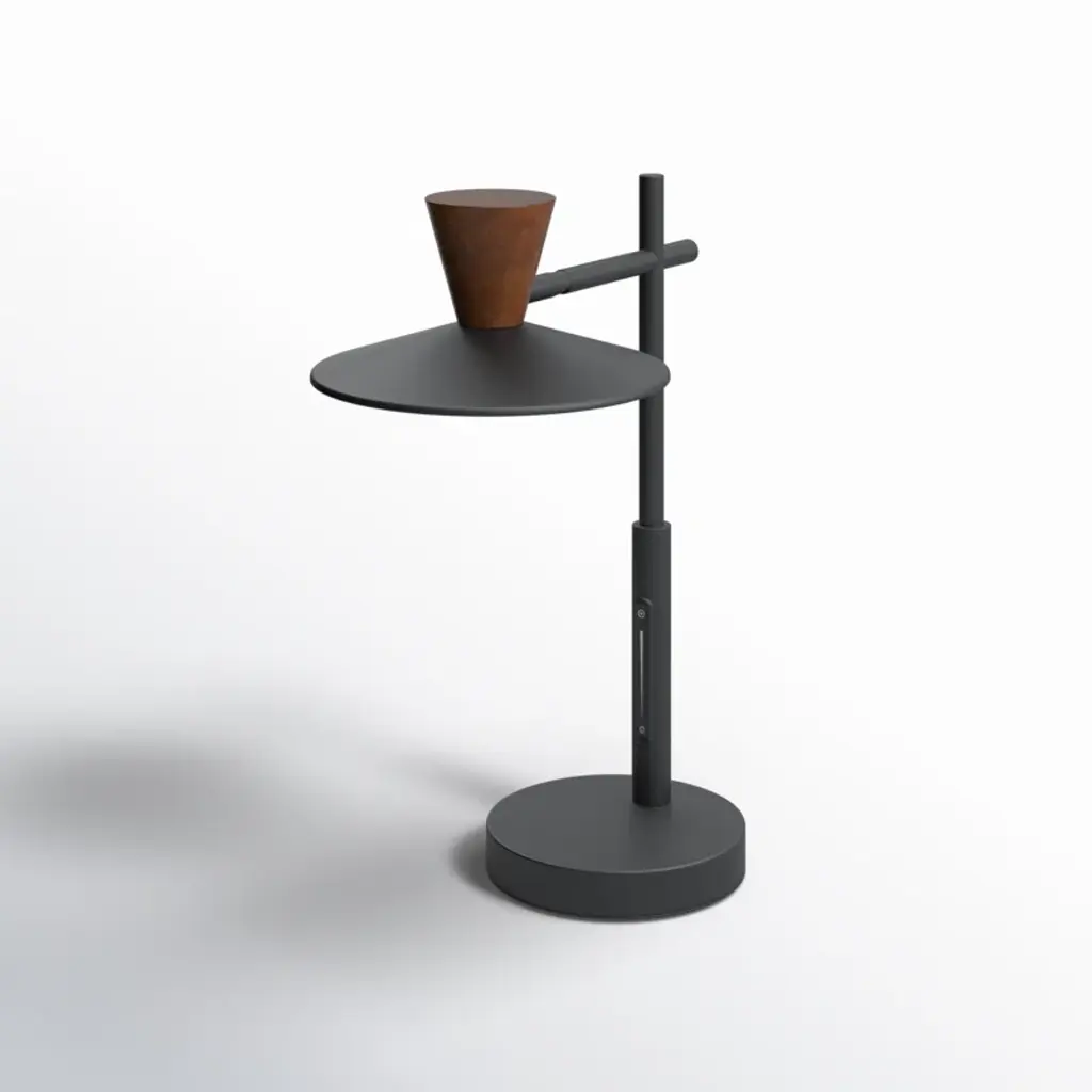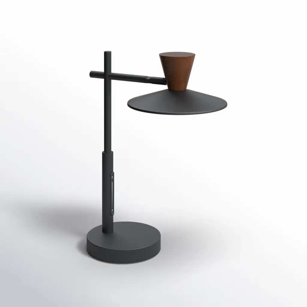 Inspired by jaunty mid-century modern design, this desk lamp showcases a shallow, adjustable cone shade accented with warm walnut wood. It’s built from steel in a black finish + features a long-lasting integrated LED light that dims and changes color-temperature at the touch of a smart switch.