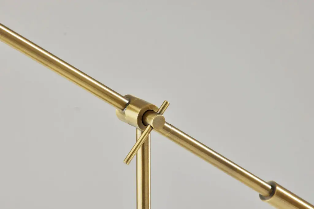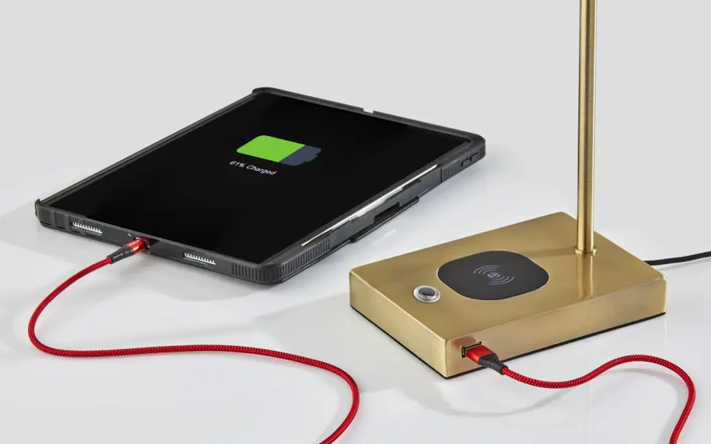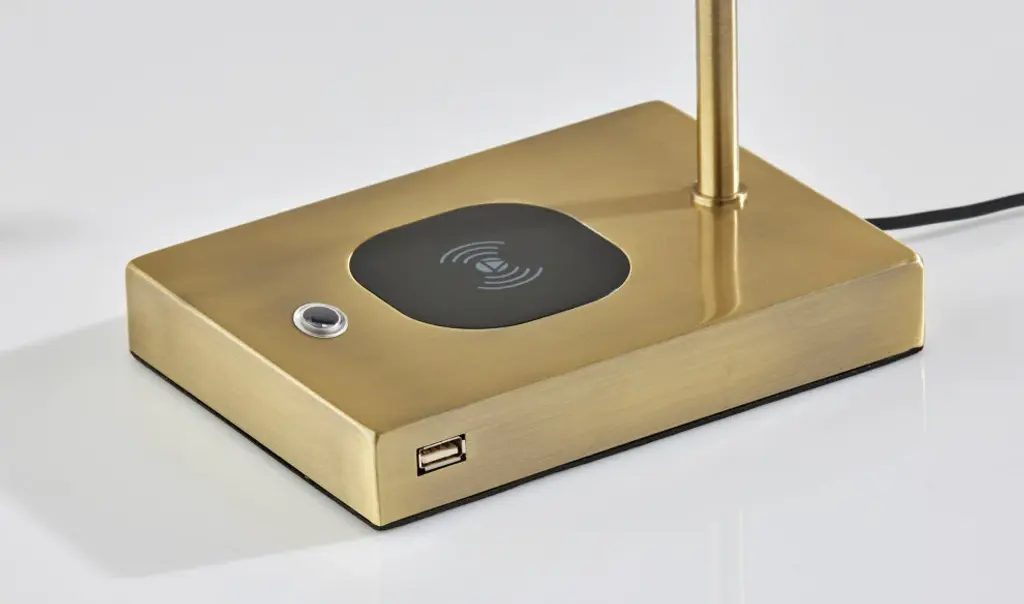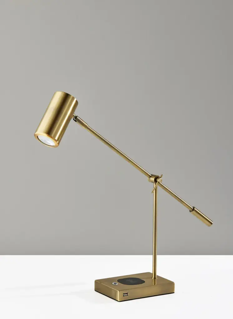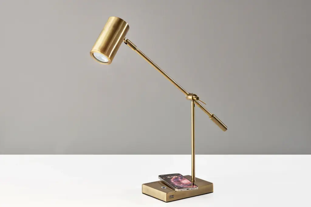 The Collette desk lamp adds modern functionality to mid-century modern design for a versatile addition to any space. Crafted of metal with an all-over antique brass finish, a rectangular base supports a slim pole that connects to a boom arm. An articulation point on the stem adjusts the angle of the arm, allowing you to set a total height of between 12.25" and 22.25". A second articulation point at the base of the light shade lets you further adjust the lighting, directing it wherever it''s needed. The 5" long and 3" diameter cylindrical shade houses an integrated 4W LED light that illuminates your space with 400 lumens of warm light. A touch dimmer switch conveniently located on the base lets you adjust the brightness between low, medium, and high at the touch of a finger. For added functionality, the base of the lamp houses an integrated Qi-certified charging pad, supporting 6W charging on contact. A USB port is also located on the side of the base for charging a second device simultaneously. Complete your décor with the coordinating Collette LED floor lamp.A touch dimmer switch adjusts the brightness between low, medium, and high.The lamp features two articulation points to direct the light wherever it''s needed.An integrated charging pad offers convenient charging for your devices.A USB port is built into the base and can be used simultaneously with the charging pad and light.The LED 3,000K color temperature creates warm white light.4W