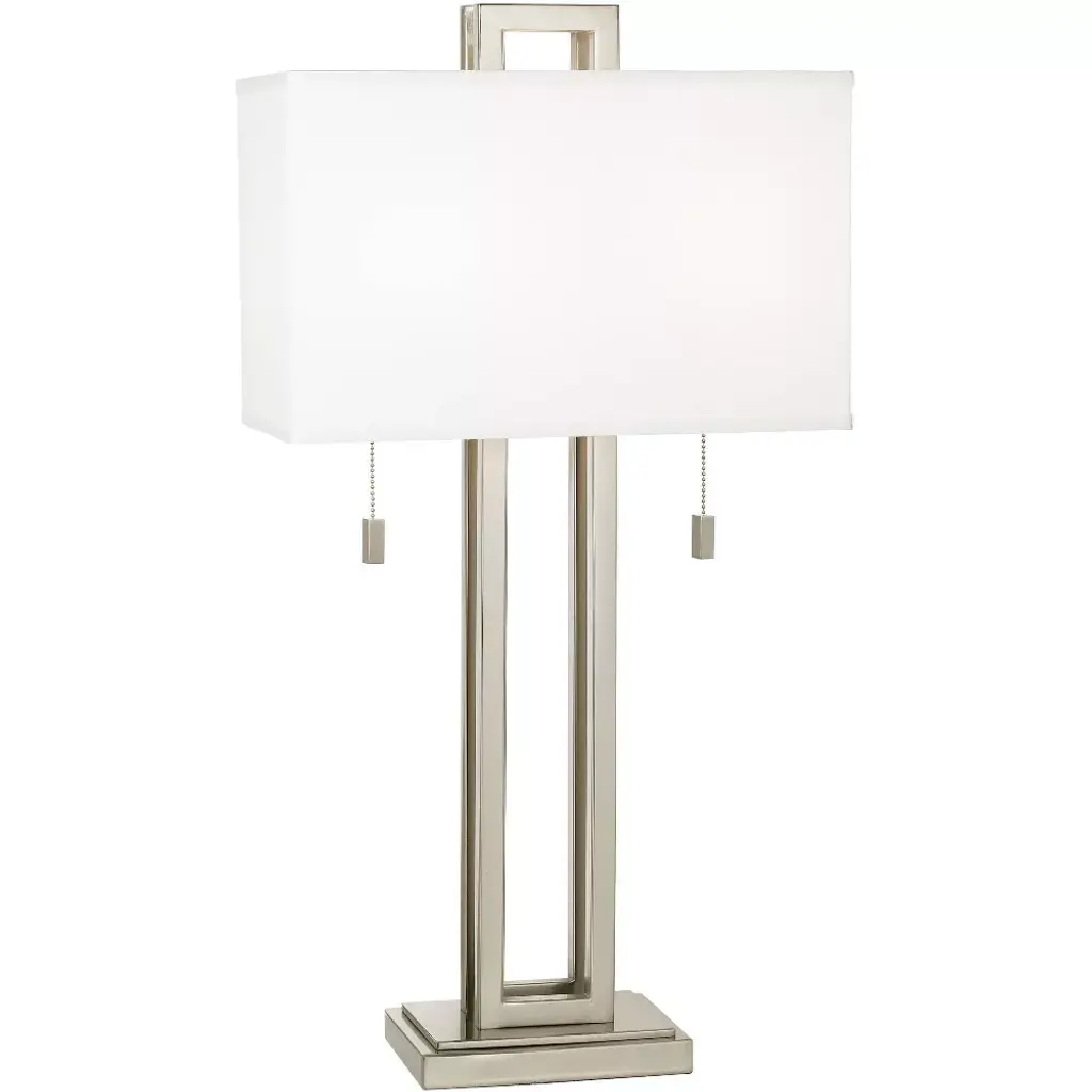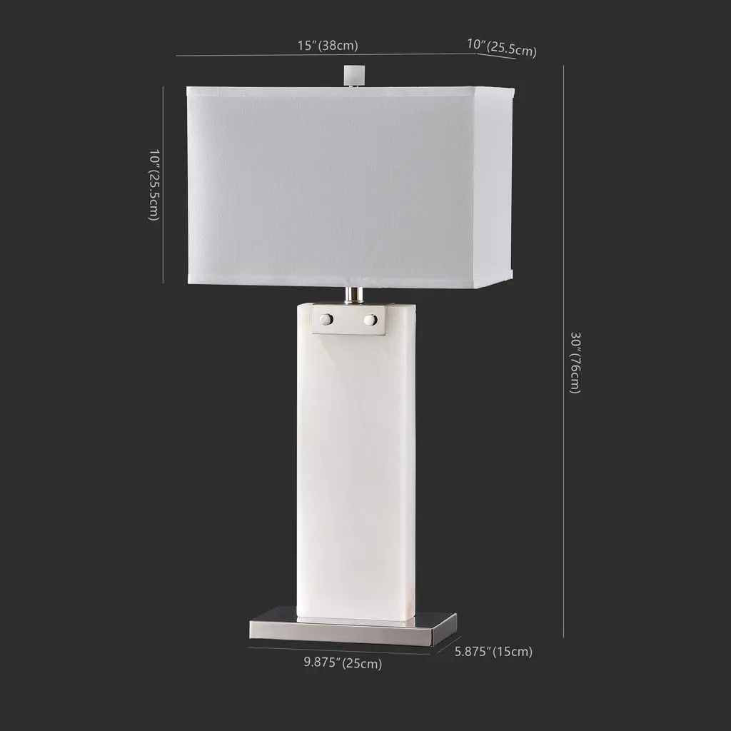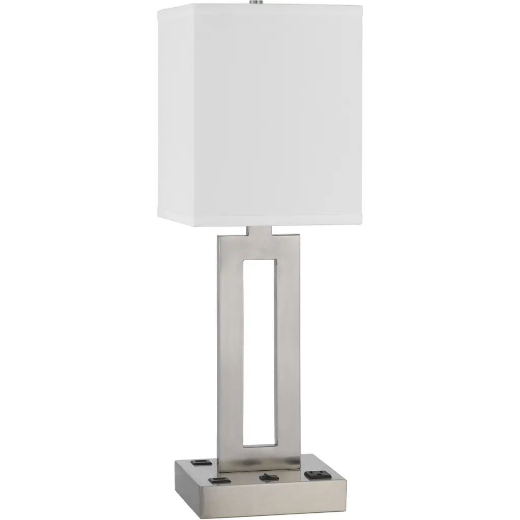 Durable Metal Construction2 usb ports on base2 power outlets on baseTwo rocker switches on baseColum style designHardback fabric shade included