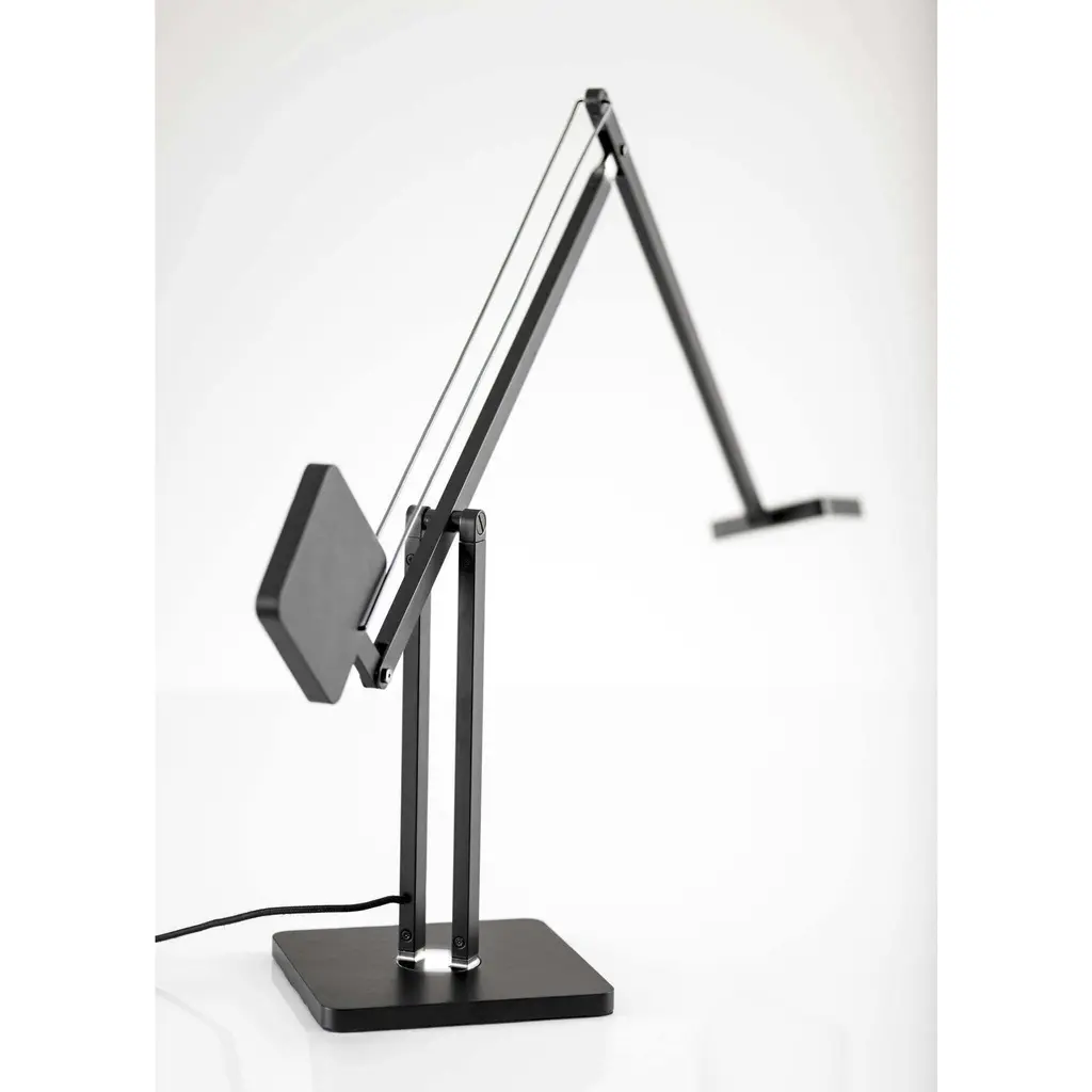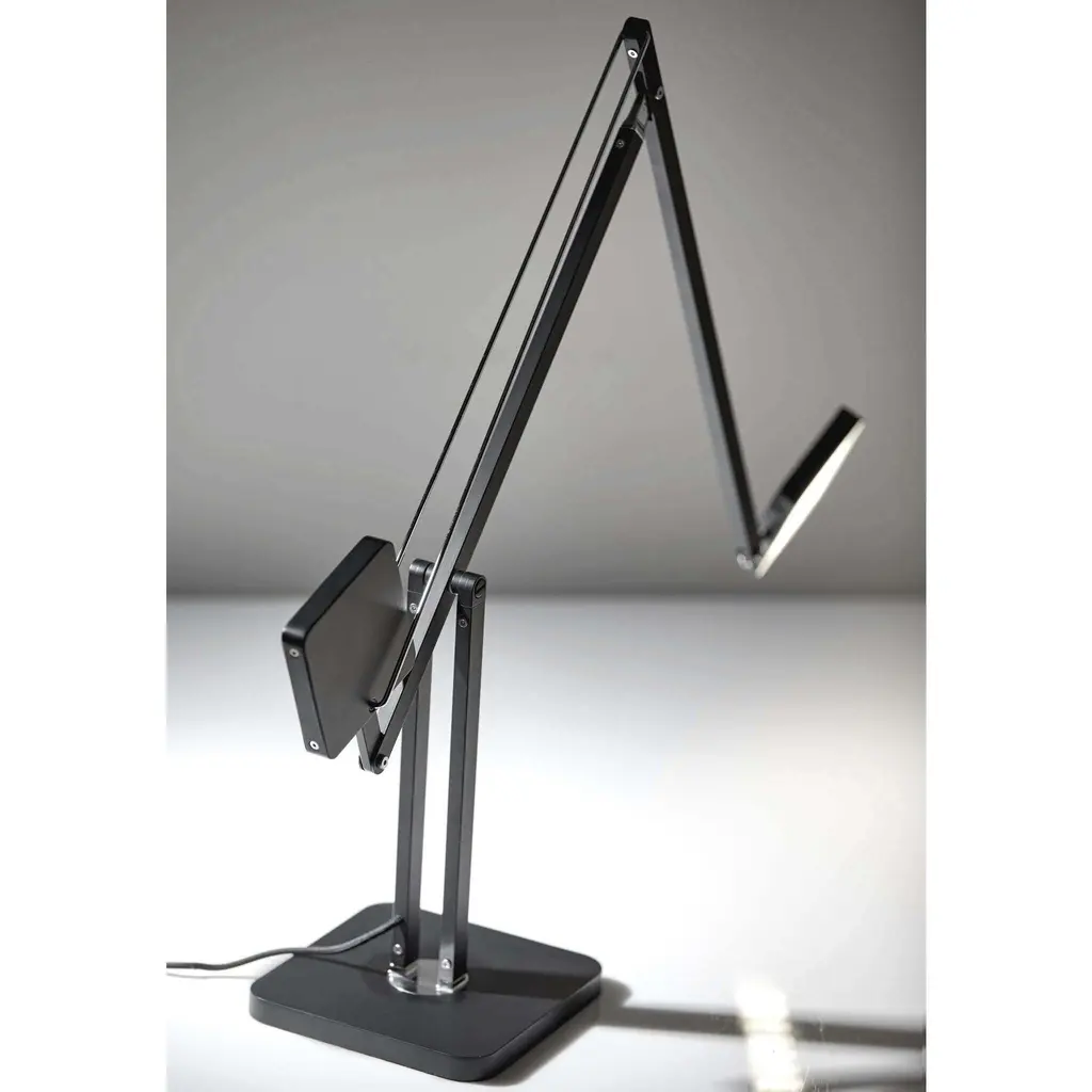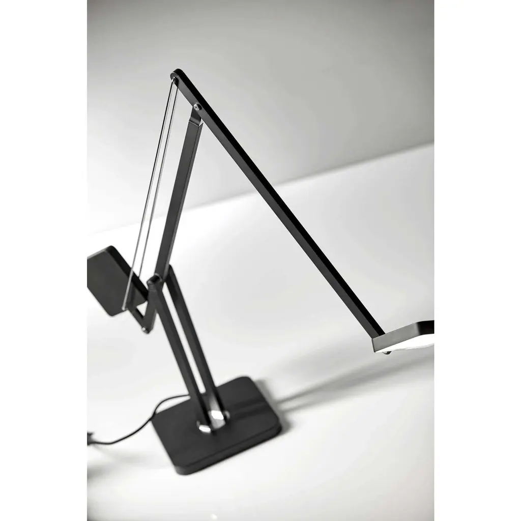 The perfect fluid arm movement has been discovered in the Cooper LED Desk Lamp. Two square shapes of the same size cooperate to create a fluid movement. One is dense and heavy to act as a counterweight, the other one is light and hollow to act as a lamp shade. The counter-balanced lamp construction will not get loose over time since it is based on the force of gravity, and not from friction or a steel spring. 600 lumens of warm, bright light is dimmable by a touch switch on the metal pole. This functional 8 watt LED light adjusts from 14 to 37 inches in height and extends from 22 to 39 inches in depth providing a full range of reach that is also rotatable by the base. Keeping it simple with a solid matte black finish, the design focuses on the lamps unique shape. The style is finished off with a decorative fabric covered cord.