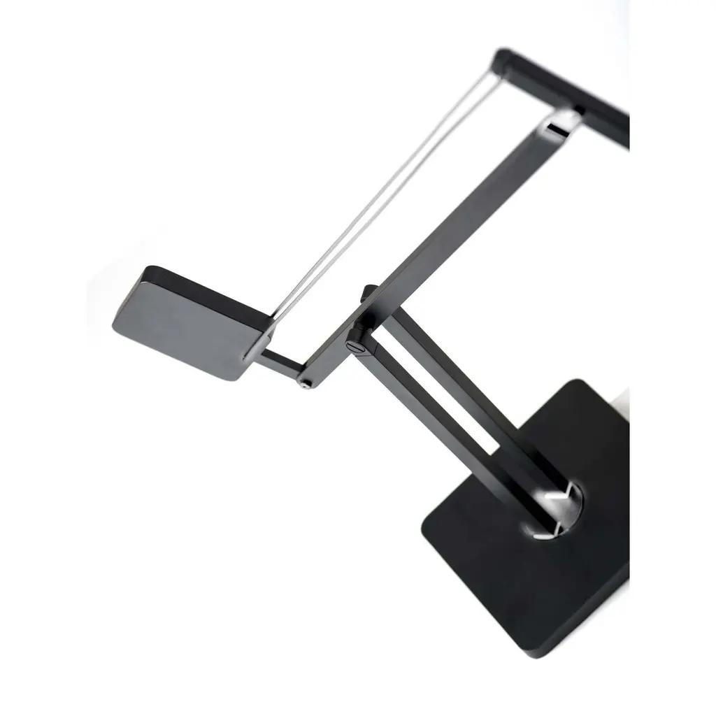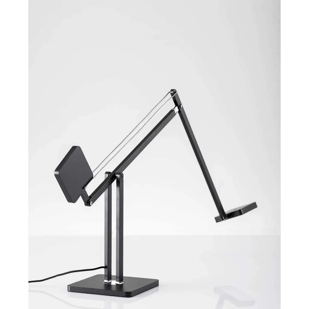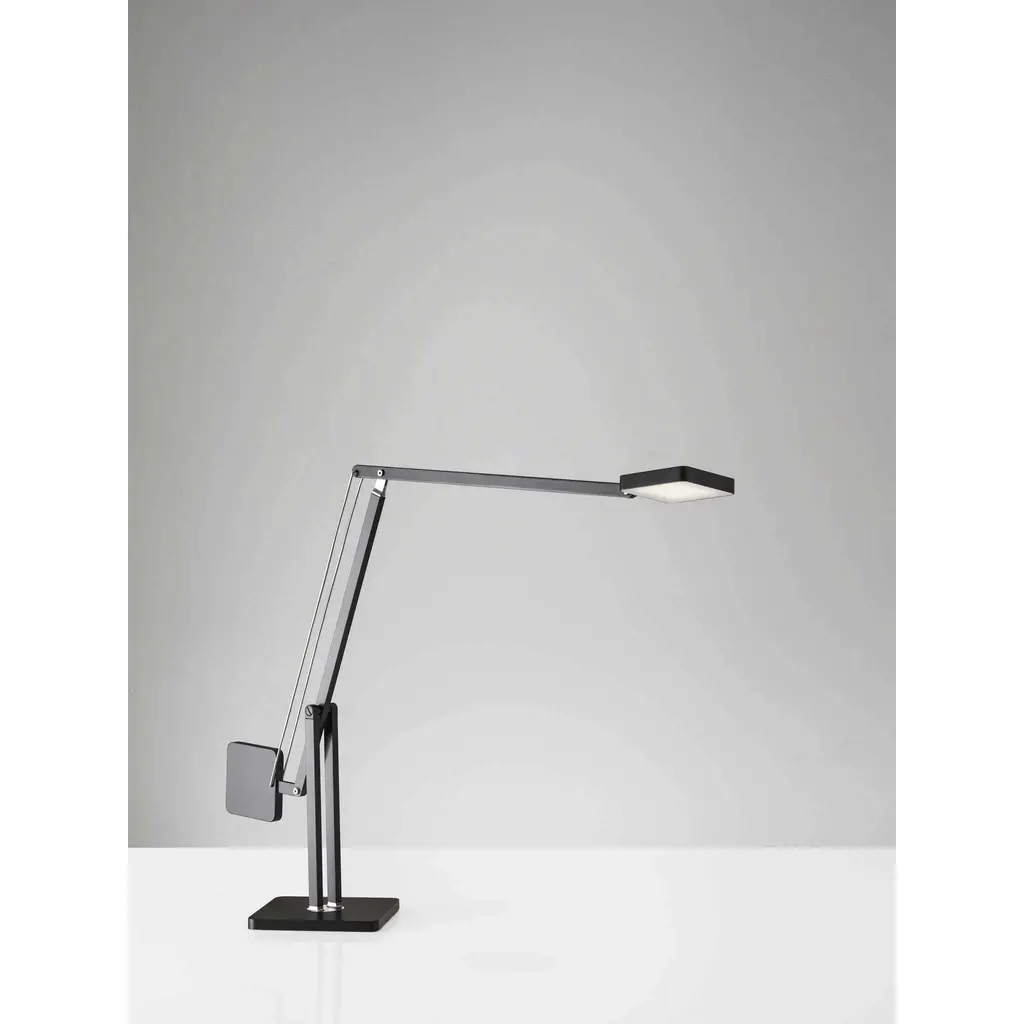 The perfect fluid arm movement has been discovered in the Cooper LED Desk Lamp. Two square shapes of the same size cooperate to create a fluid movement. One is dense and heavy to act as a counterweight, the other one is light and hollow to act as a lamp shade. The counter-balanced lamp construction will not get loose over time since it is based on the force of gravity, and not from friction or a steel spring. 600 lumens of warm, bright light is dimmable by a touch switch on the metal pole. This functional 8 watt LED light adjusts from 14 to 37 inches in height and extends from 22 to 39 inches in depth providing a full range of reach that is also rotatable by the base. Keeping it simple with a solid matte black finish, the design focuses on the lamps unique shape. The style is finished off with a decorative fabric covered cord.