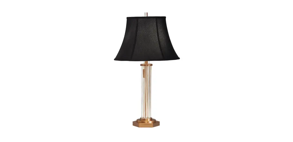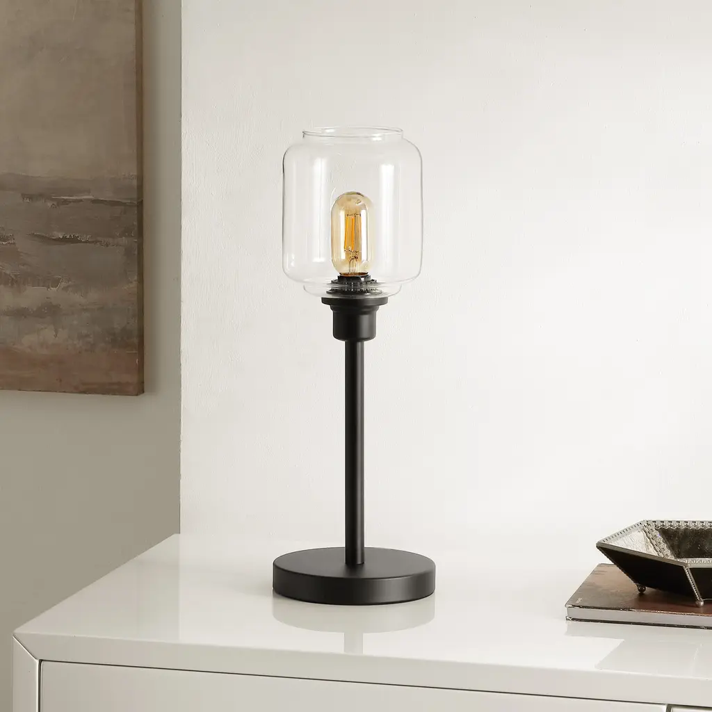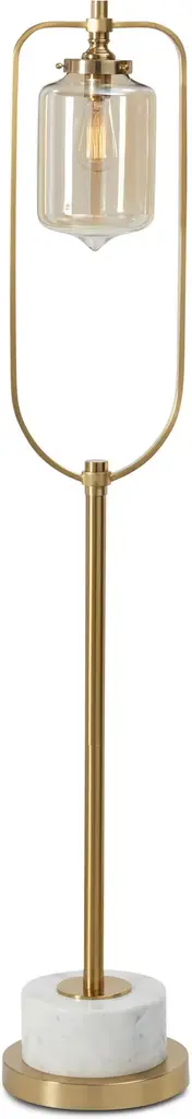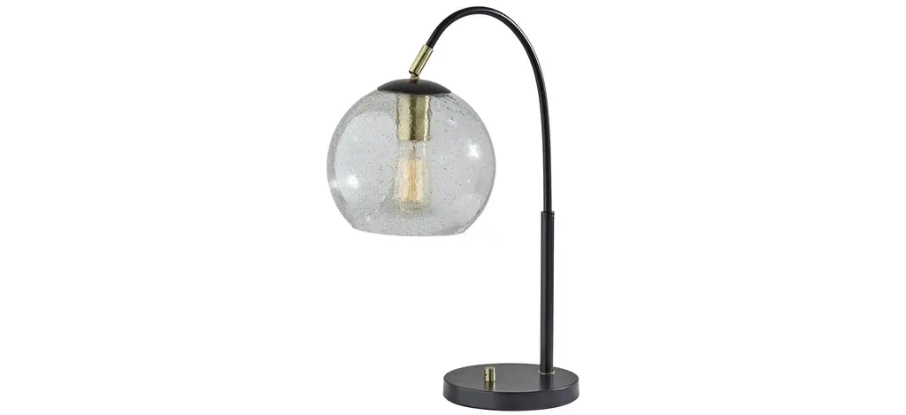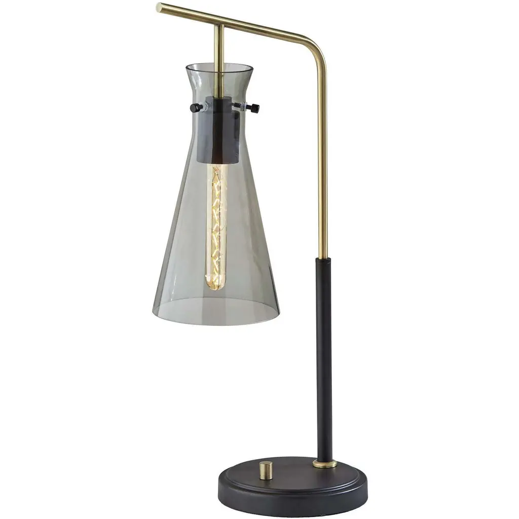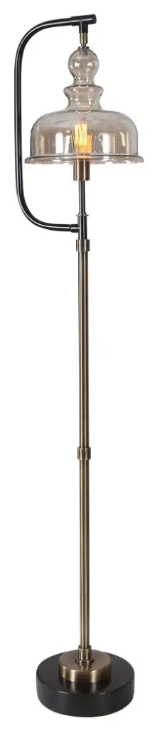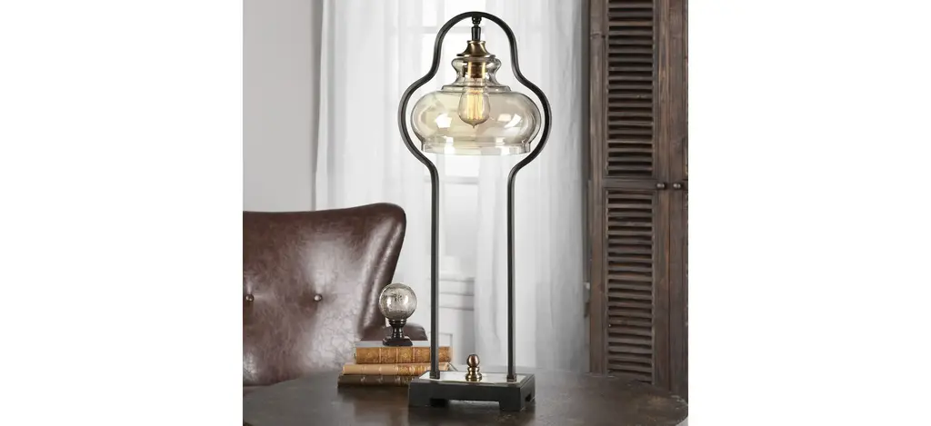 Curvaceous forged iron finished in an aged black, following the contour of the light amber glass shade, accented with brushed, antiqued brass plated details.