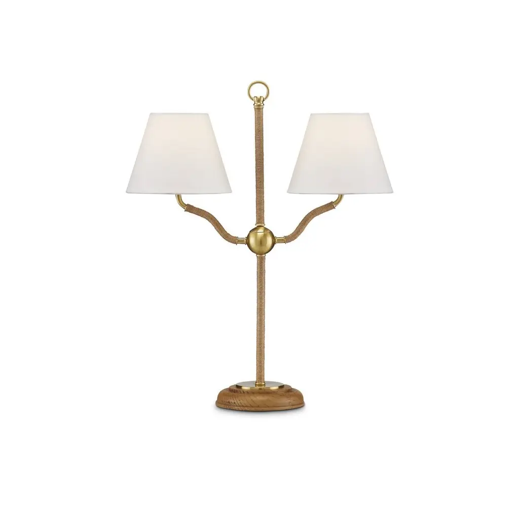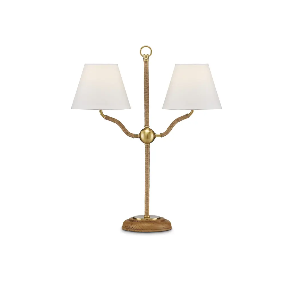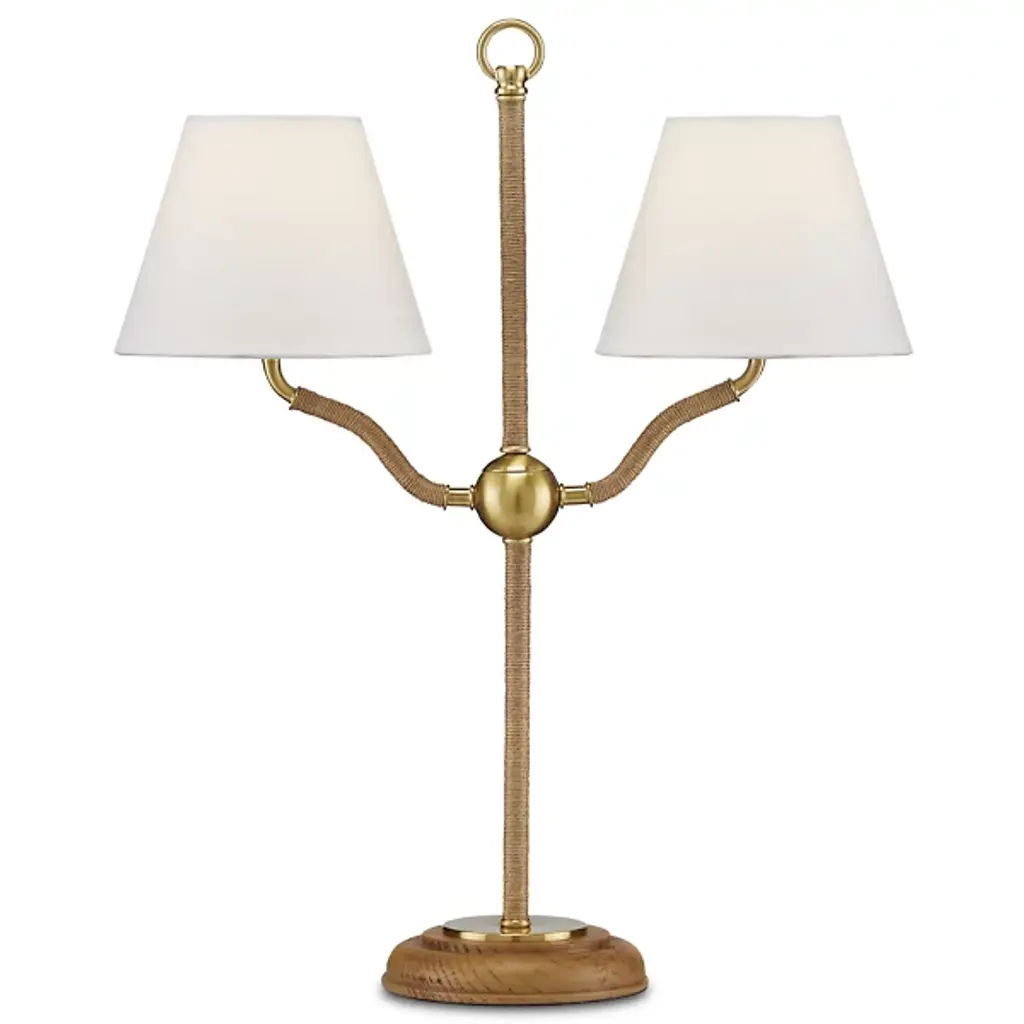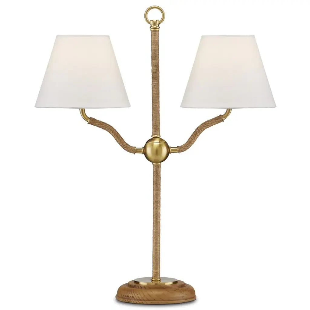 The Sirocco Desk Lamp features a light profile, with all but the main decorative elements wrapped in jute rope. These include the ring at its apex, the small globe connecting the forked arms, and the base itself. Made of wood and plated antique brass, the rope desk lamp is fitted with two off-white linen shades. This dressy desk lamp is designed to be a decorative and functional accent in a space.