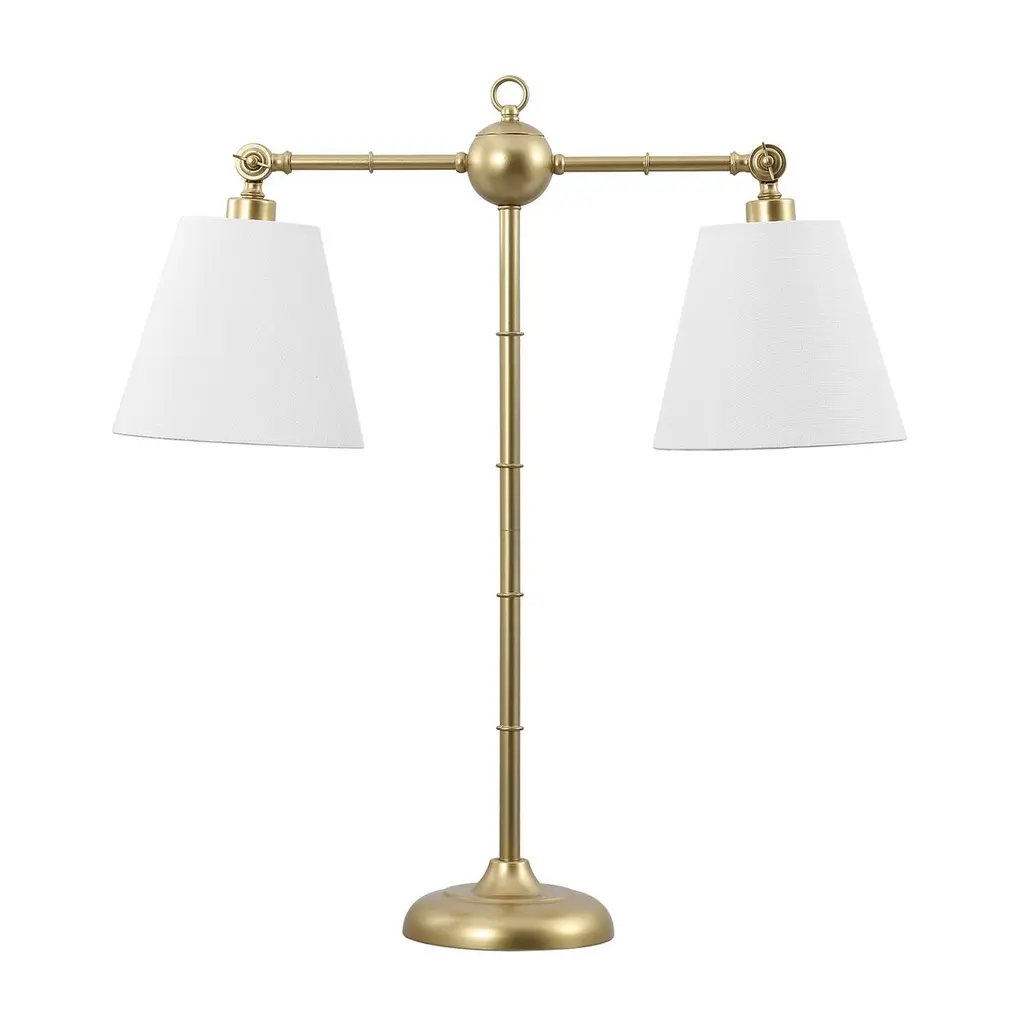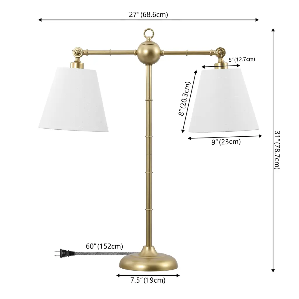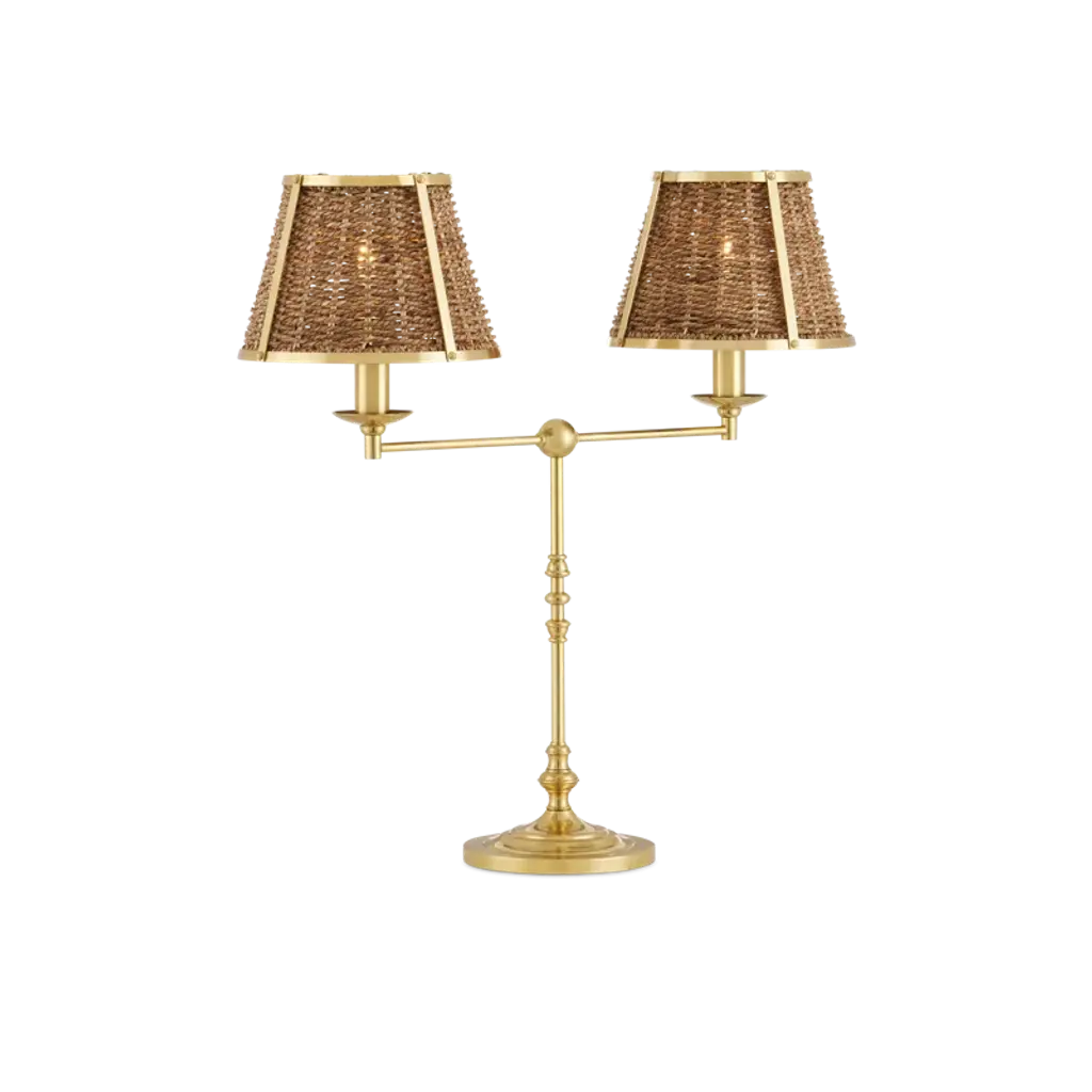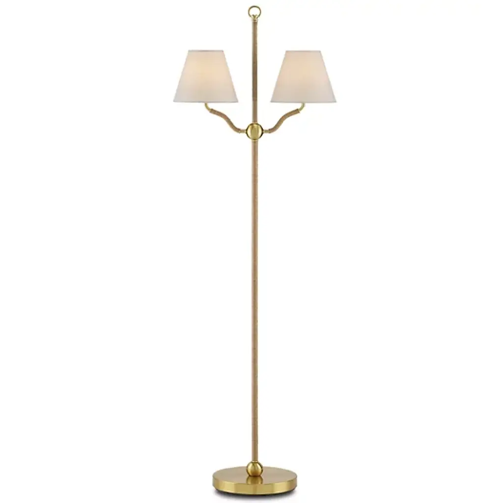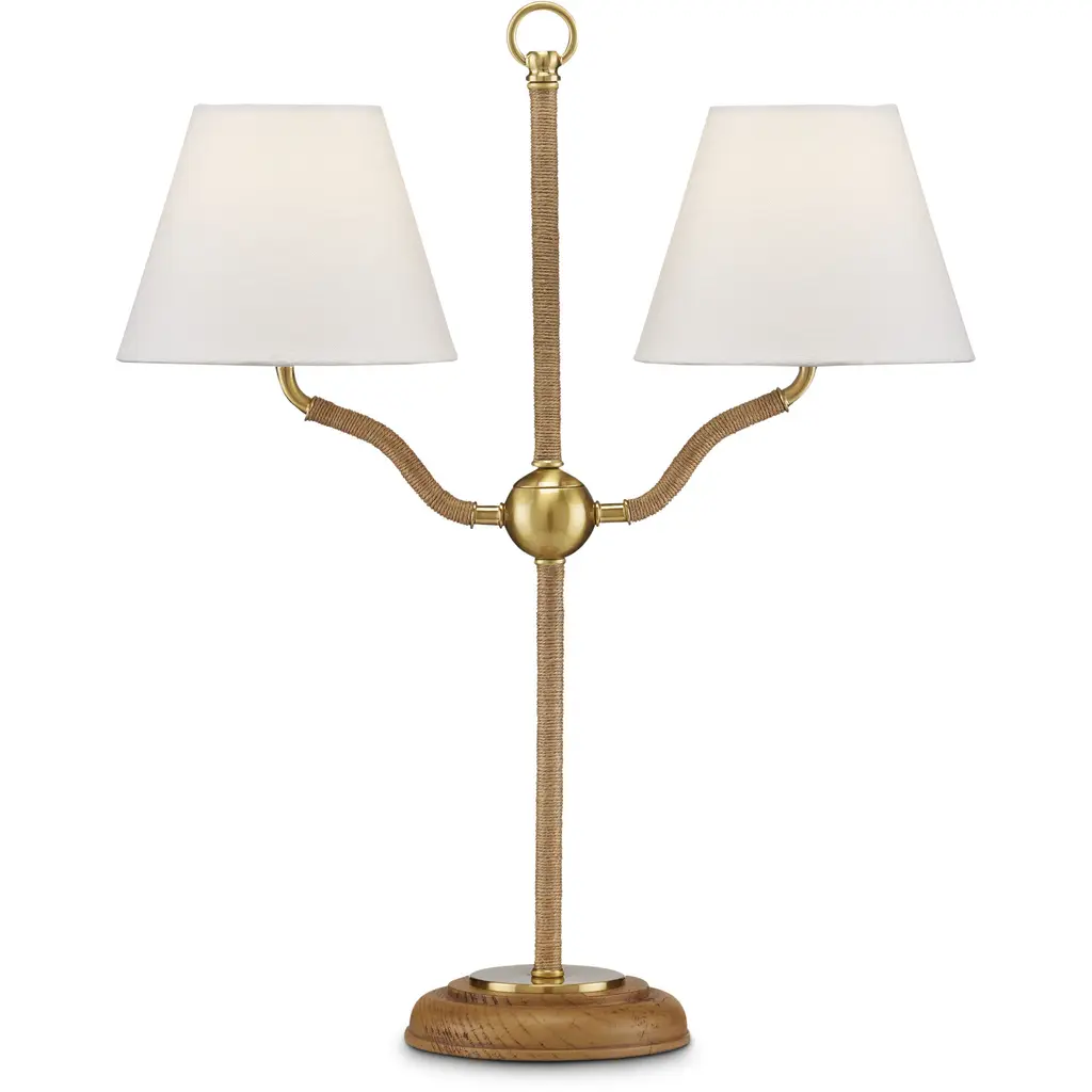 The Sirocco Desk Lamp features a light profile, with all but the main decorative elements wrapped in jute rope. These include the ring at its apex, the small globe connecting the forked arms, and the base itself. Made of wood and plated antique brass, the rope desk lamp is fitted with two off-white linen shades. This dressy desk lamp is designed to be a decorative and functional accent in a space.