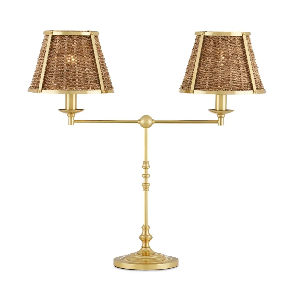 The Deauville Desk Lamp was created by Suzanne Duin, who founded the Houston shop and design studio Maison Maison, and is known for a keen eye in sourcing authentic French antiques and home accessories from around the globe. Each piece in her line of woven light fixtures is handmade by artisans in Southeast Asia; the Deauville an example in natural seagrass and steel in a polished brass finish. This tailored desk lamp trimmed in gold will bring both texture and French flair. The Deauville collection also includes a table lamp (sold separately). Ships In 7-10 Business Days This image is for illustrative purposes only. The colors shown are accurate within the constraints of lighting, photography, and the color accuracy of your screen.