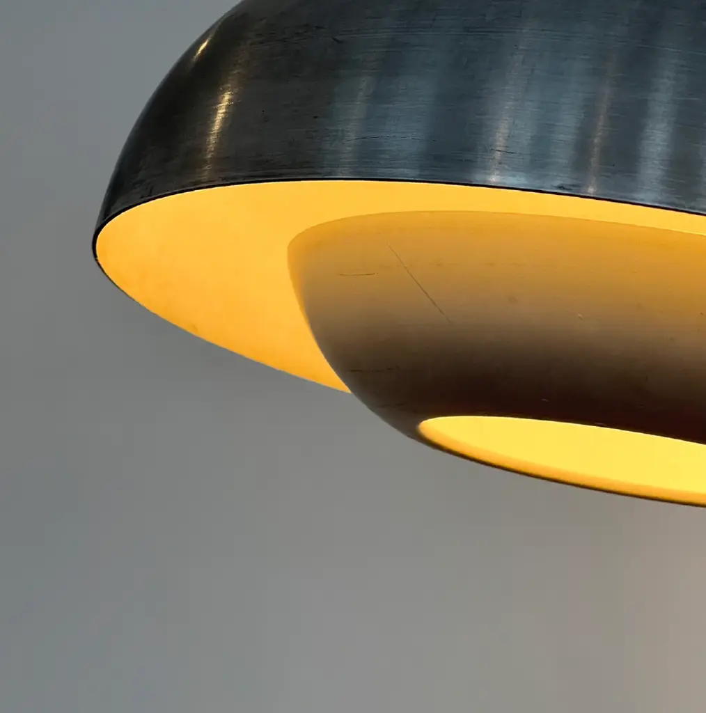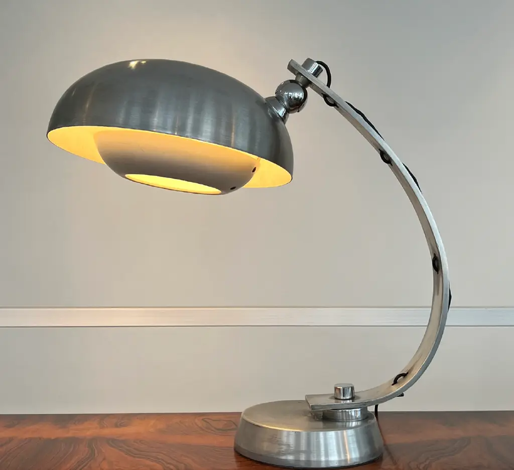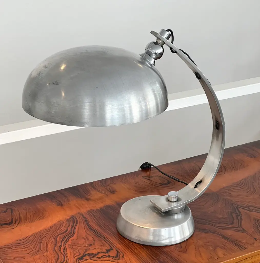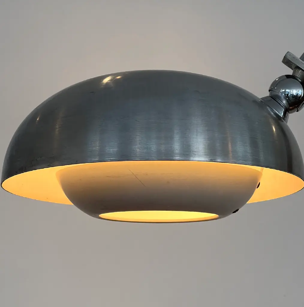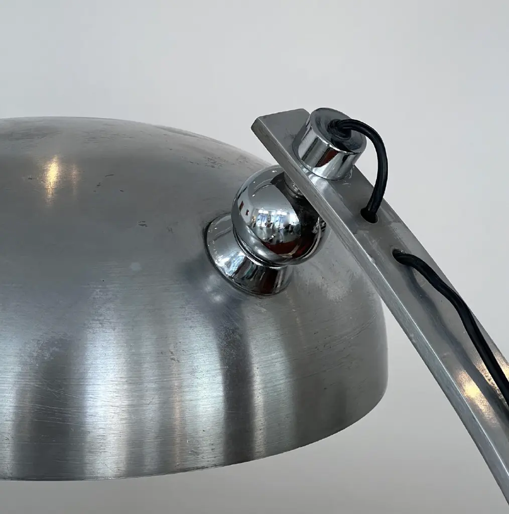 Angelo Lelli (1911-1979), Industrial and Designer founded Arredoluce in 1947 in Monza. Known for its innovative productions, the quality of craftsmen as well as the creativity of designers, Arredoluce is revolutionizing the luminaire. It was in 1947, at the VIII Triennale de Milan, that he exhibited the lamp 12128 and became the lamdary of the Triennale. He will then be considered an influential designer in post-war Italy, in particular in the field of lighting modern. During the 1950s, Arredoluce began to collaborate with designers such as Franco Albini, Achille Castiglioni, Gio Ponti, Ettore Sottsass and to experiment with halogen bulbs for its creations. From this experiment, Lelli increases the use of transformers for its conceptions and created the famous Arredoluce switch. If the company had to close in the 1990s, the art market still shows today that the name and essence of Arredoluce are perpetuated and the company still arouses life. Brushed, circular base, mobile arc -shaped stem, mounted on a swivel ball, discharge reflector disc. Presents some traces of wear. Rare piece. European Plug (up to 250V).The wiring of this item may be original and might need replacement, if not specified otherwise.
