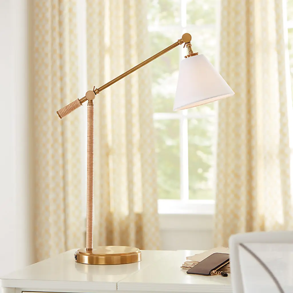 The timeless lines of a classic study lamp updated with natural texture and modern function. Our Desta Task Lamp is handmade of polished brass with rattan-wrapped arm and stem. The stick arm adjusts in height and tilts at the crisp white linen shade, so you can focus light just where you need it in the home office or beside the bed. The nicely weighted, stepped base has a USB port hidden in back for charging your devices. Desta Rattan Task Lamp features: