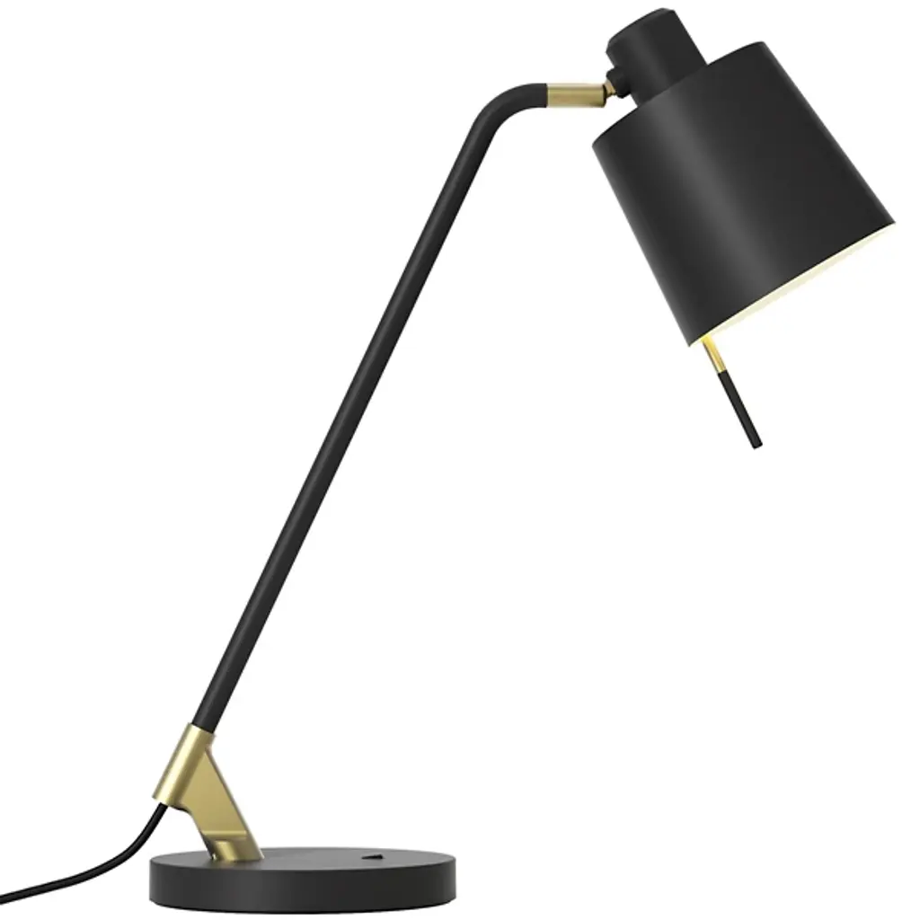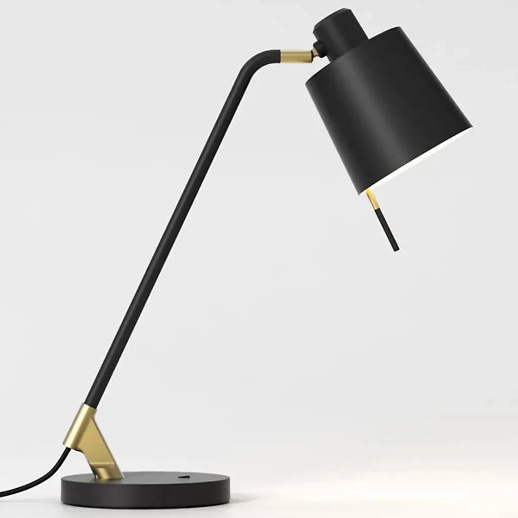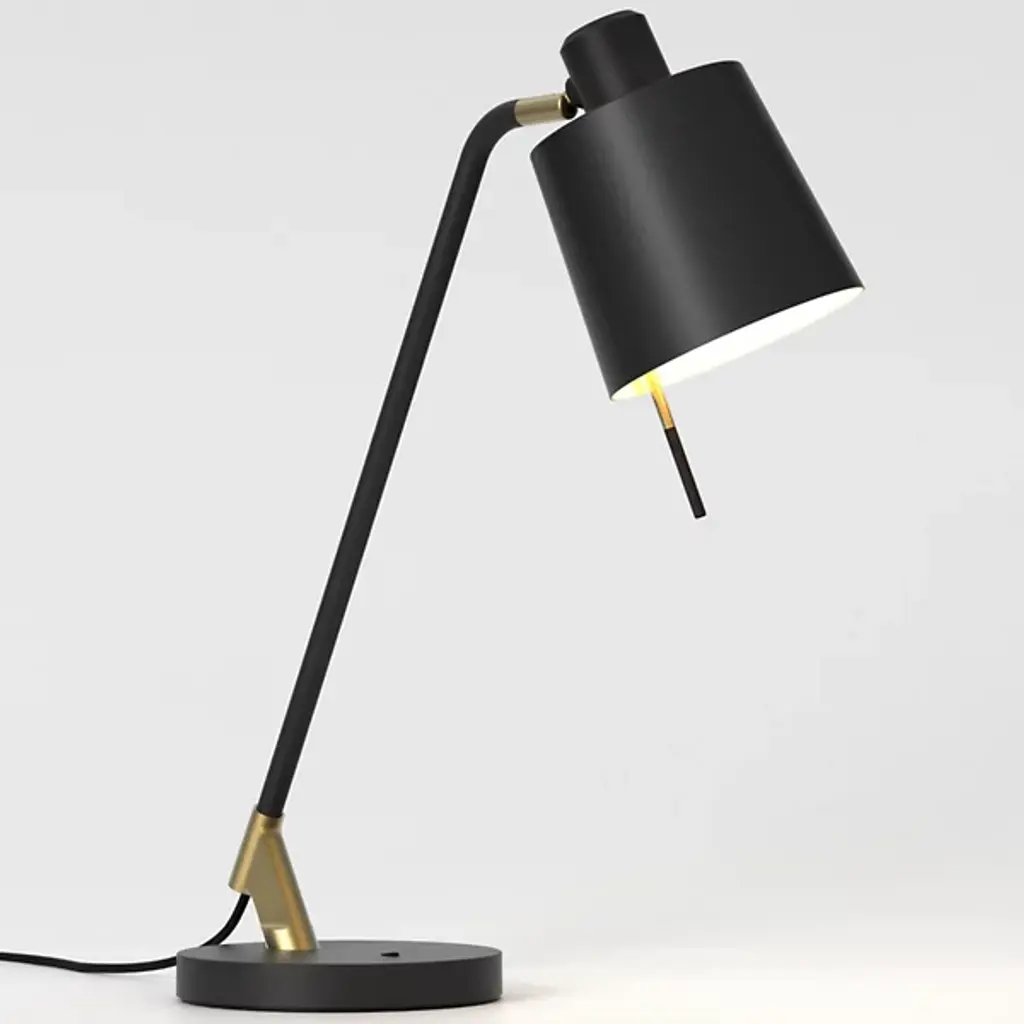 Showcase your good taste with the smooth lines and striking contrasts of the Edward Desk Lamp from Astro Lighting. A clever contemporary update of more traditional designs, it distills a striking simplicity from a retro style. Secured by a matte-textured disc base, a sleek and angular collar sweeps up and back to seat a matching matte stem that sweeps upward to seat posable LED lamping inside a small, tapered drum shade (sold separately) that is adjustable with a small, two-tone rod that sweeps down from its open base.