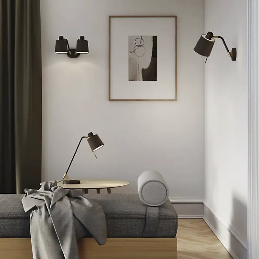 Showcase your good taste with the smooth lines and striking contrasts of the Edward Desk Lamp from Astro Lighting. A clever contemporary update of more traditional designs, it distills a striking simplicity from a retro style. Secured by a matte-textured disc base, a sleek and angular collar sweeps up and back to seat a matching matte stem that sweeps upward to seat posable LED lamping inside a small, tapered drum shade (sold separately) that is adjustable with a small, two-tone rod that sweeps down from its open base.