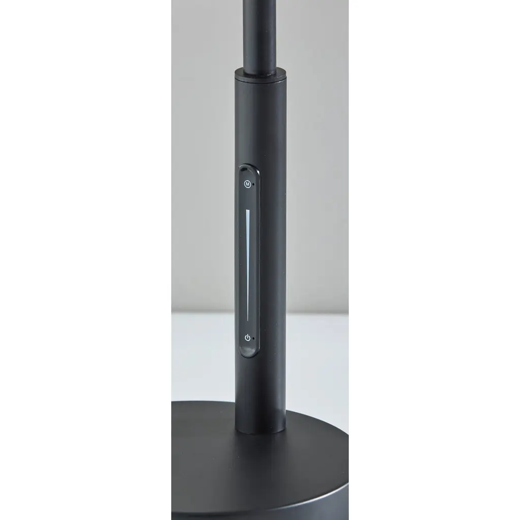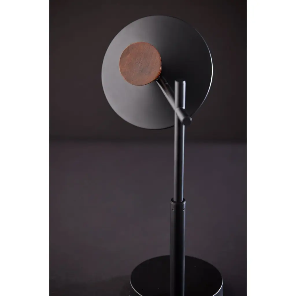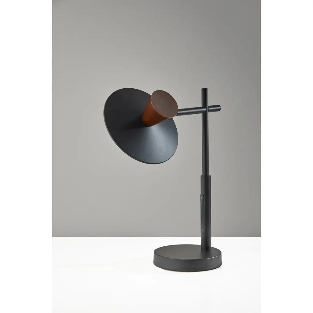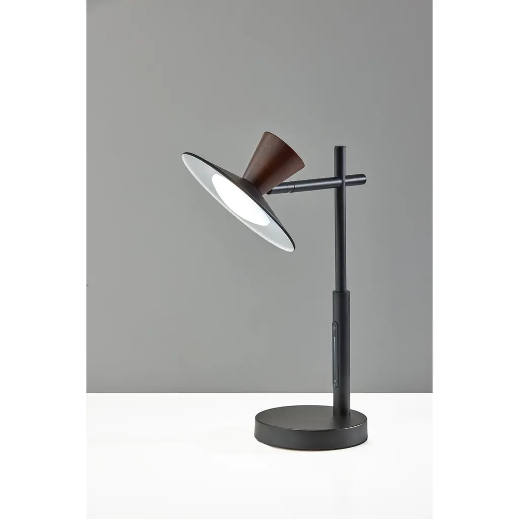 Elegant and modern, the 16.5-inch tall Elmore LED desk lamp adds contemporary, functional style to your workspace. The walnut wood accent brings warmth to the black metal construction, while the blend of geometric patterns creates visual interest. The 8-inch diameter shade can be adjusted and redirected to focus the light wherever it's needed and also features an integrated 8W LED light that is economical and eco-friendly. Operated by a smart switch built into the stem, the Elmore desk lamp provides highly versatile lighting at the touch of a finger. For optimum adjustability, the smart switch controls a full-range dimmer and 5 color temperature settings to match the LED brightness and temperature to your activity and the time of day. Complete your space's décor with the coordinating Elmore LED floor lamp and tree lamp. Features:
