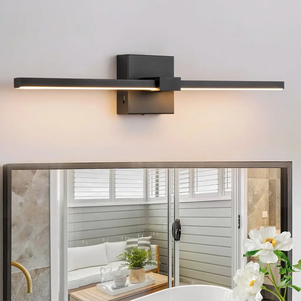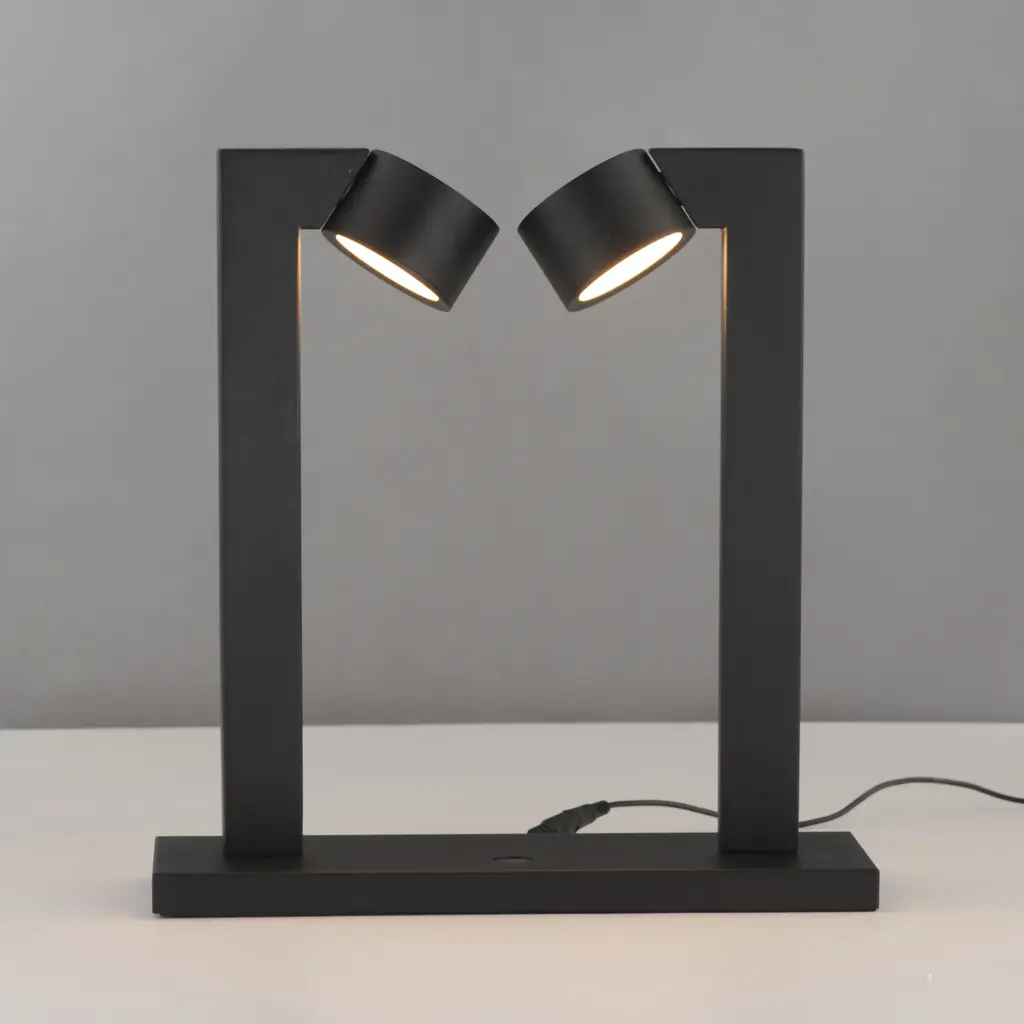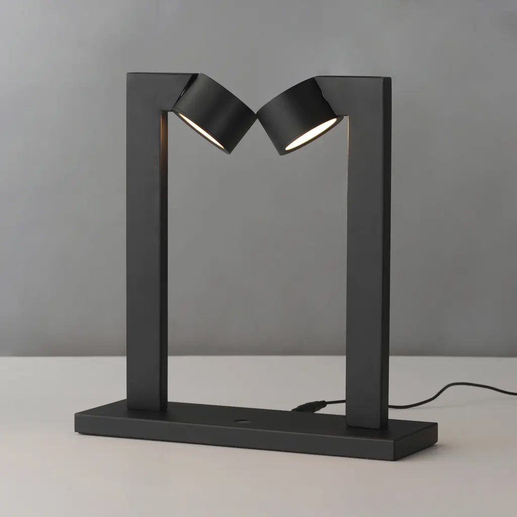 A modern matte black frame crafted with rectilinear tubing supports circular LED light modules. Designed to appear as if they are facing each other in an embrace, the modules create a harmonious and dynamic aesthetic. The two modules, positioned at opposite ends, cast evenly distributed light and seamlessly rotate to direct illumination precisely where it's needed. Two versatile surface-mount fixtures are suitable for wall or ceiling installation, as well as two portable lamp options. The portable designs feature a tabletop lamp and a larger-profile floor lamp, both equipped with an integrated touch switch for easy operation and dimming control.