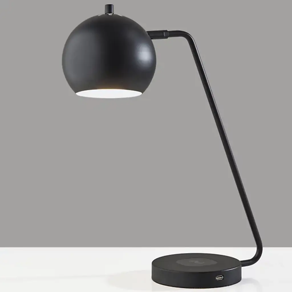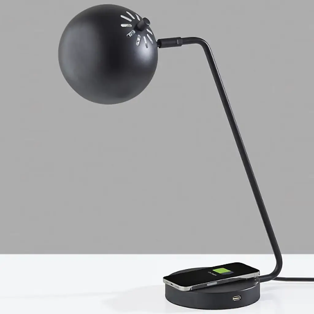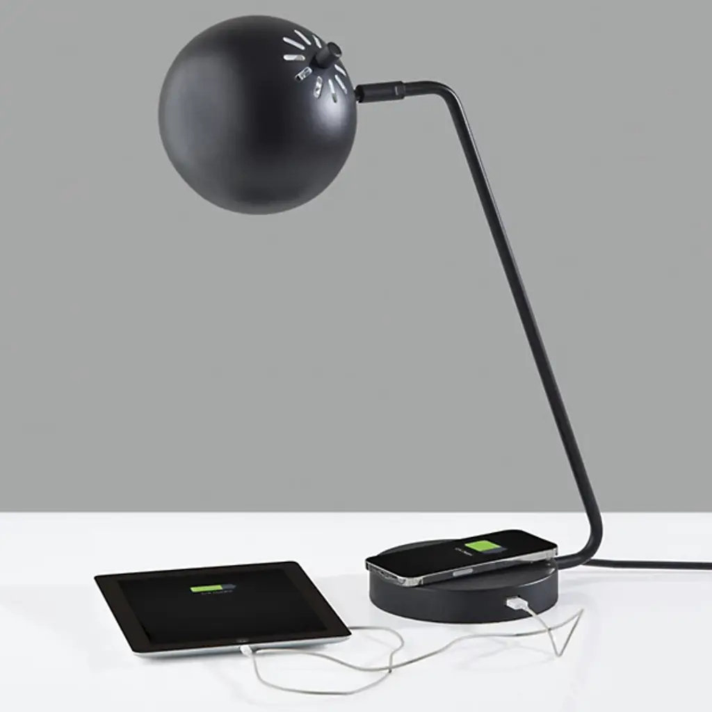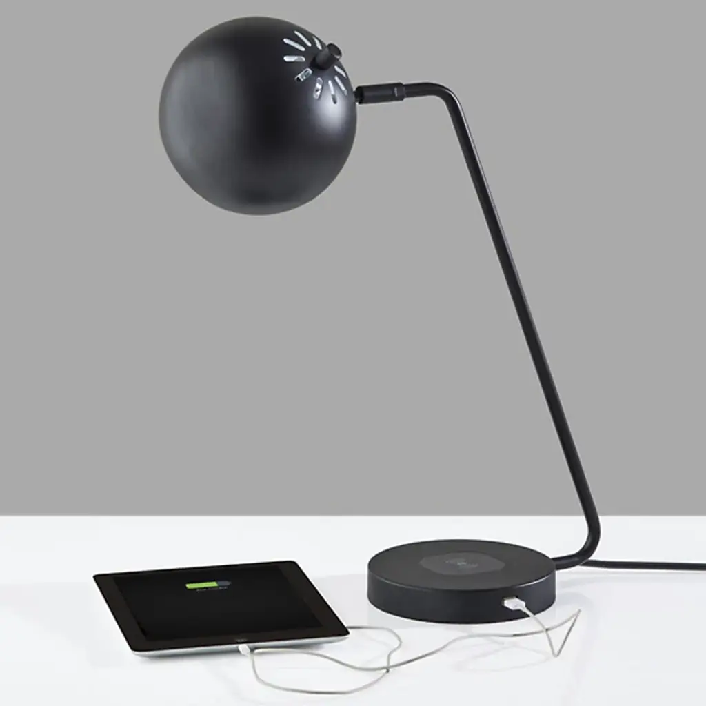 Simple yet inviting, the Emerson Charge Desk Lamp from Adesso unites form with function with a modern twist on a mid-century modern silhouette. Made of smooth metal throughout, a rounded base upholds a thin, gracefully curving body that leads to a spherical shade. The shade’s underside is open, allowing the light from the single bulb within to escape in a bright and focused demonstration. The base doubles as a wireless charging station for your devices and contains an additional USB port for a second device.