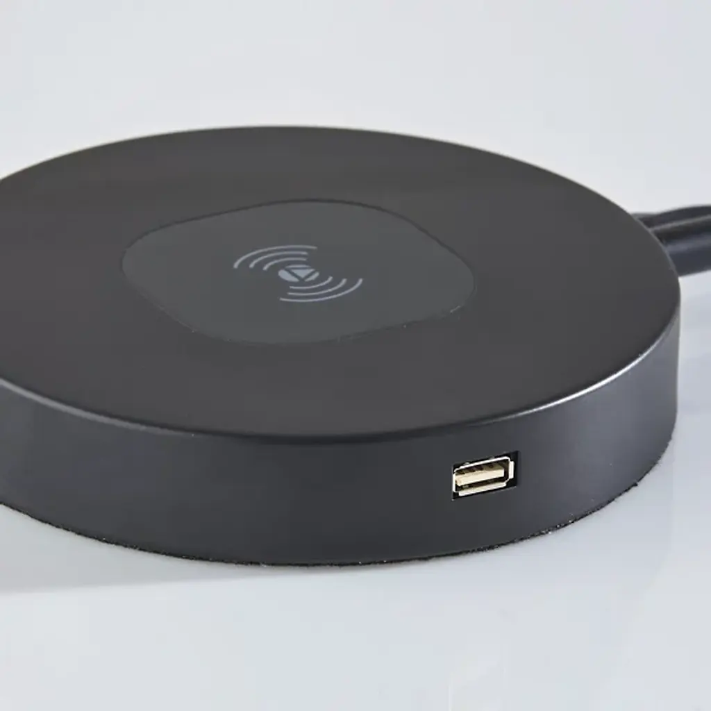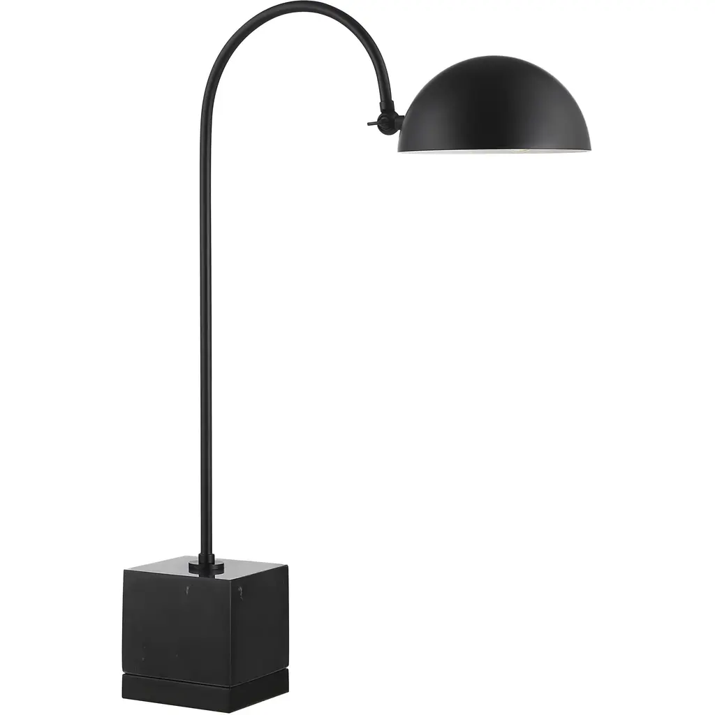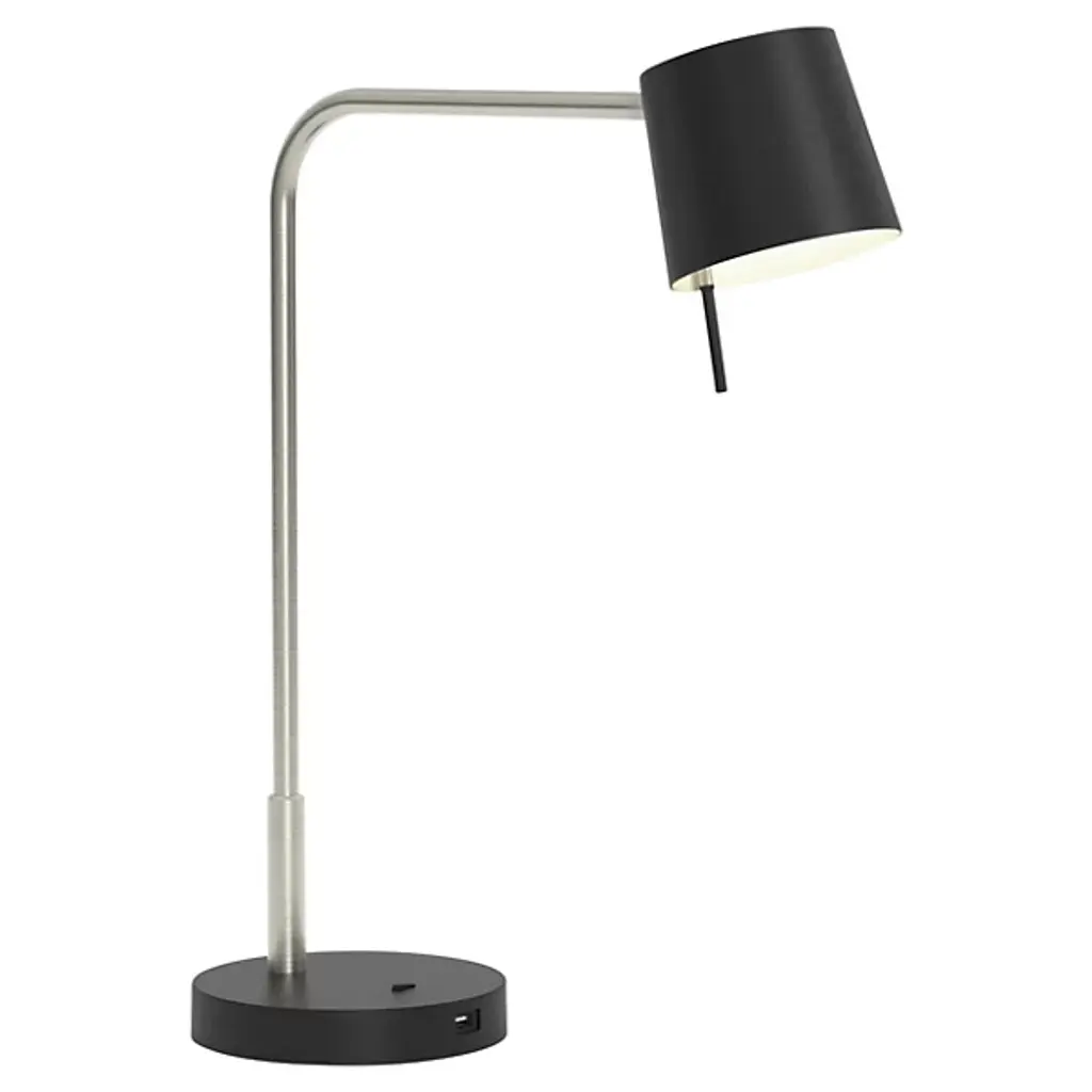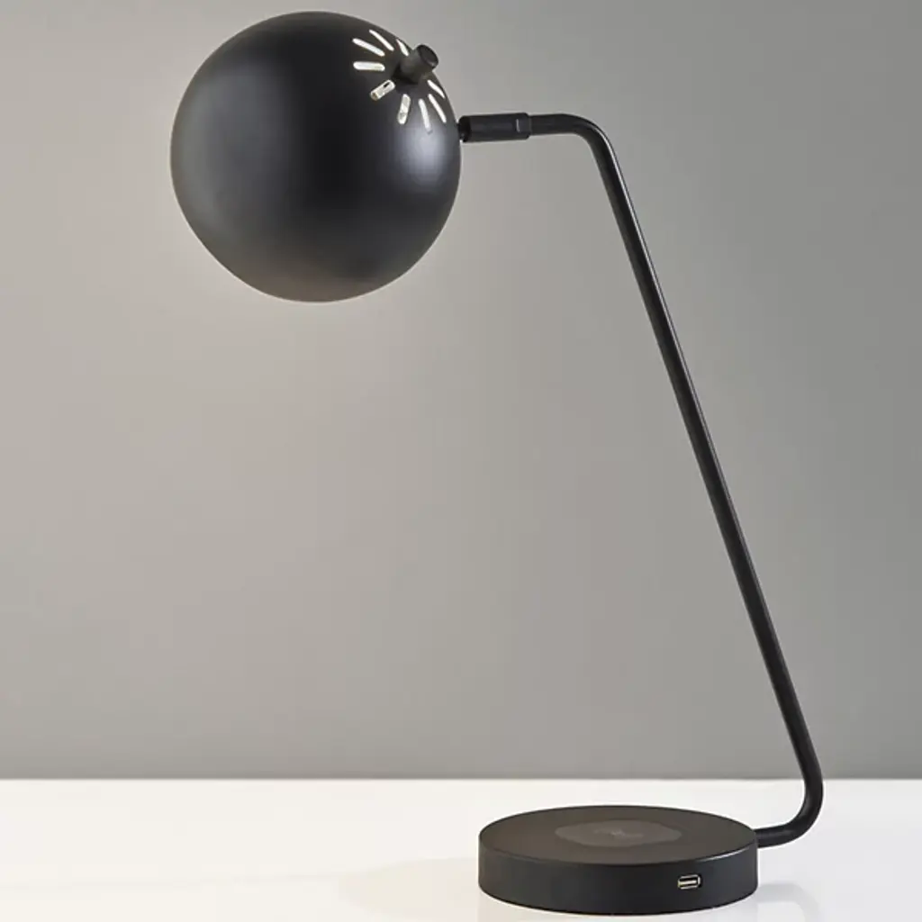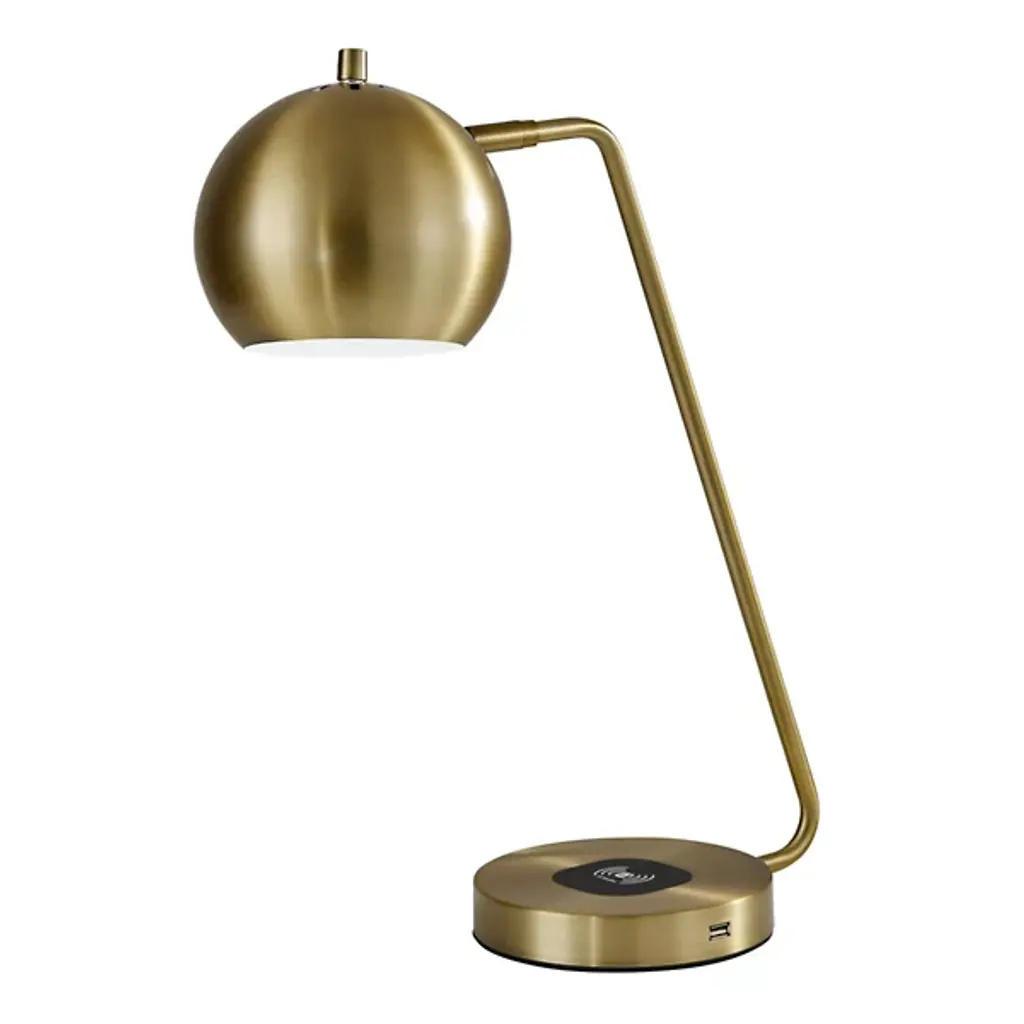 Simple yet inviting, the Emerson Charge Desk Lamp from Adesso unites form with function with a modern twist on a mid-century modern silhouette. Made of smooth metal throughout, a rounded base upholds a thin, gracefully curving body that leads to a spherical shade. The shade’s underside is open, allowing the light from the single bulb within to escape in a bright and focused demonstration. The base doubles as a wireless charging station for your devices and contains an additional USB port for a second device.