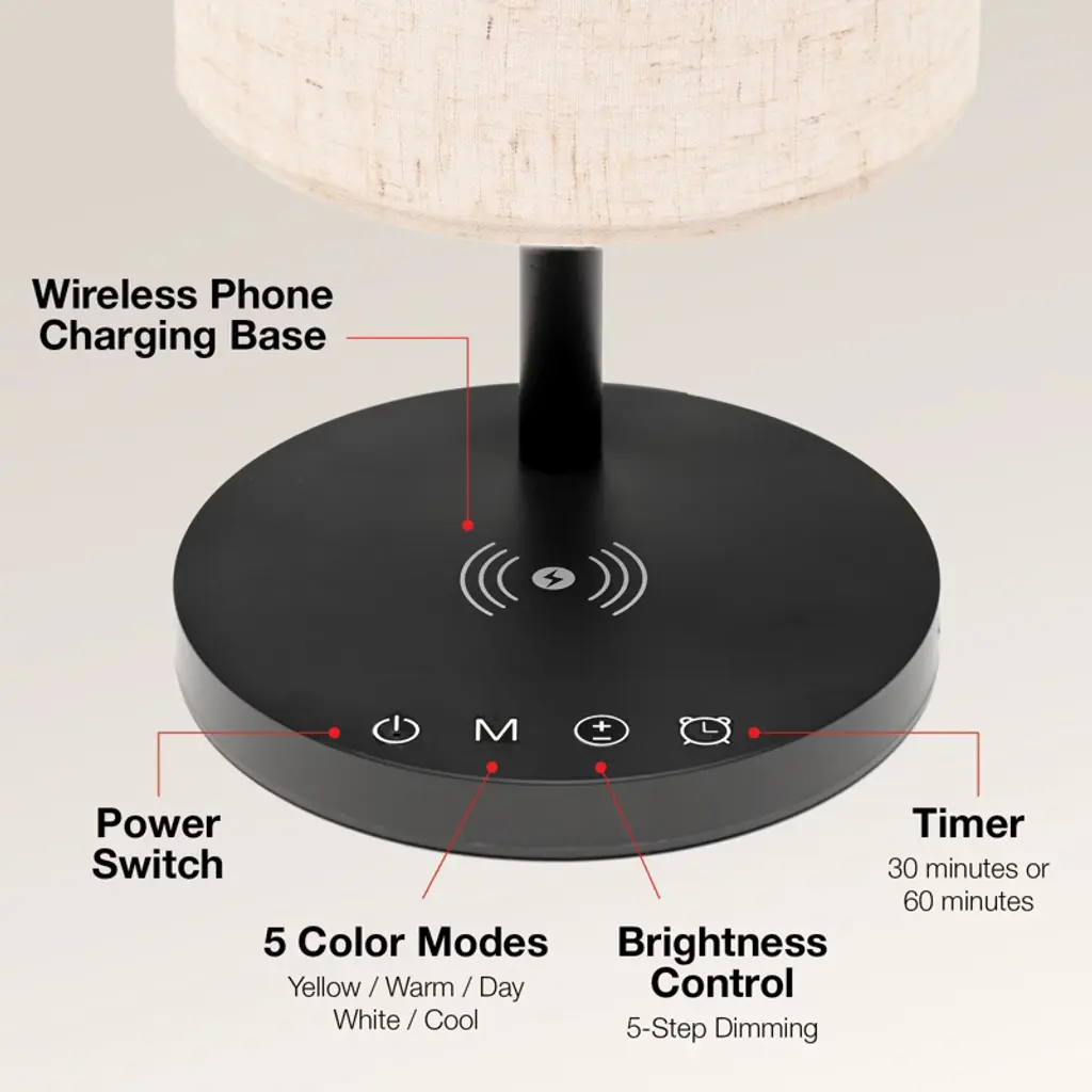 Elevate your workspace with this sleek desk lamp featuring 5 touch-selectable color modes, adjustable brightness, and a classic fabric shade. Designed for both style and functionality, it includes a built-in wireless charger, USB port, and energy-saving shut-off timer-perfect for work, reading, or creative projects