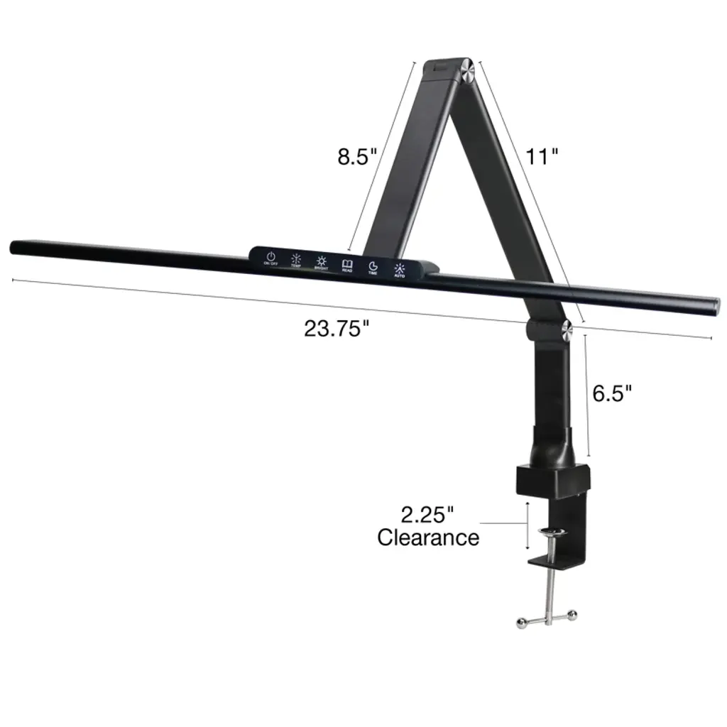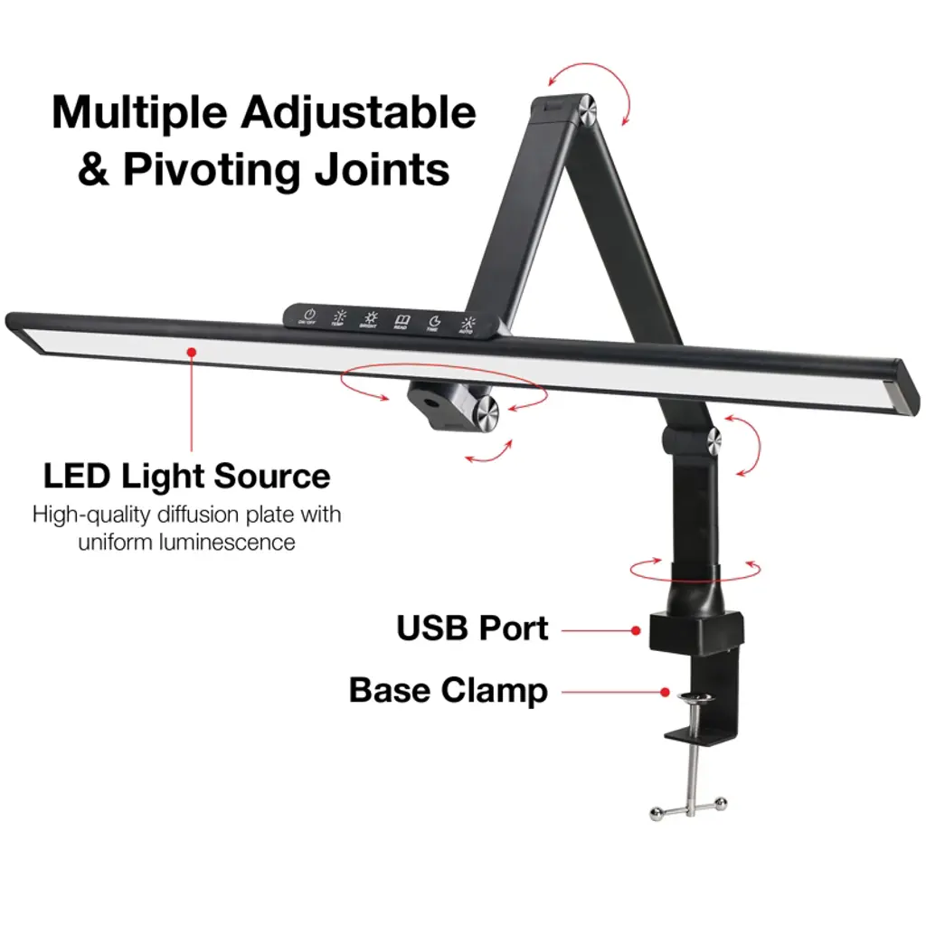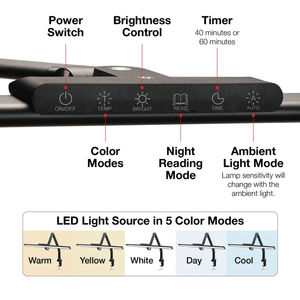 This versatile desk lamp offers customizable lighting with 5 color modes, adjustable brightness, and a night reading mode to reduce eye strain and create the perfect atmosphere for any task. The smart ambient light mode automatically adjusts brightness based on natural lighting, ensuring optimal illumination all day long. Its space-saving clamp design securely mounts to your desk, keeping your workspace organized and clutter-free. With 4 adjustments and rotation points, perfect for reading, working, or drawing, while wireless phone charging, USB ports, and an energy-saving shut-off timer add convenience and efficiency at an unbeatable value.