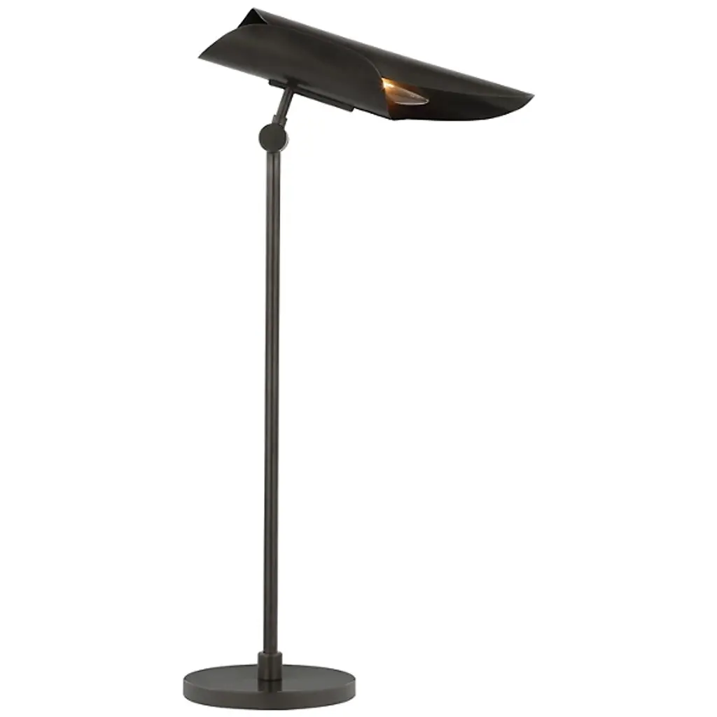 The Flore Desk Lamp from Visual Comfort Signature presents a dynamic and contemporary appearance. Designed by Champalimaud and inspired by the texture of rolled parchment, each fixture features a paper-thin metal shade, offering a captivating interplay of colors or tonal metals for an industrial-chic allure. The desk lamp can be articulated, allowing you to direct the light precisely in studies or create a captivating display in hallways and great rooms when used in multiples.