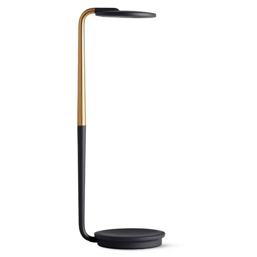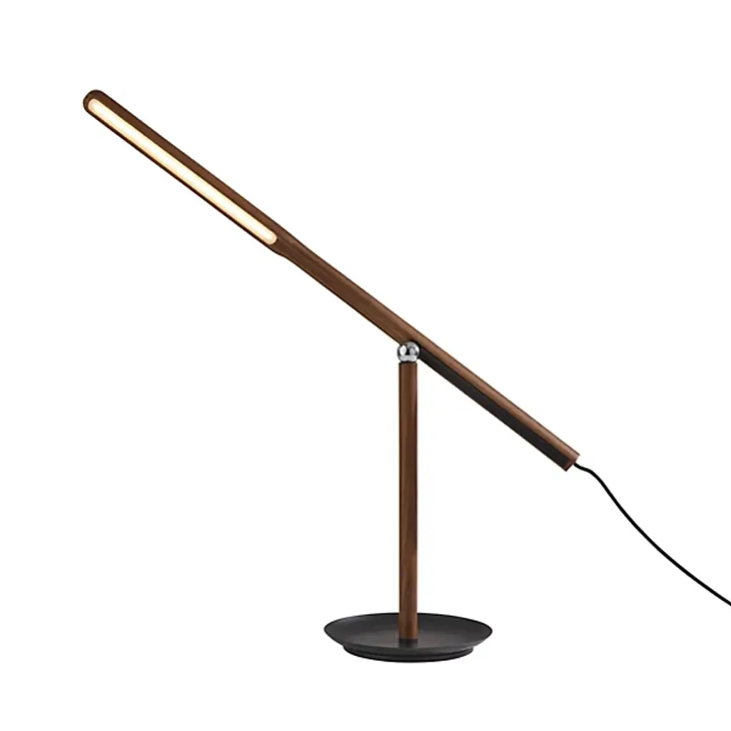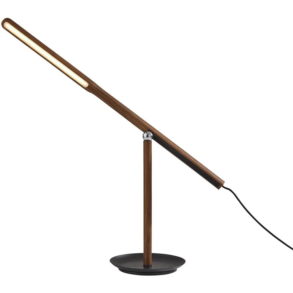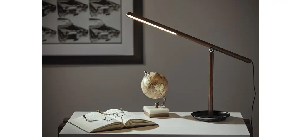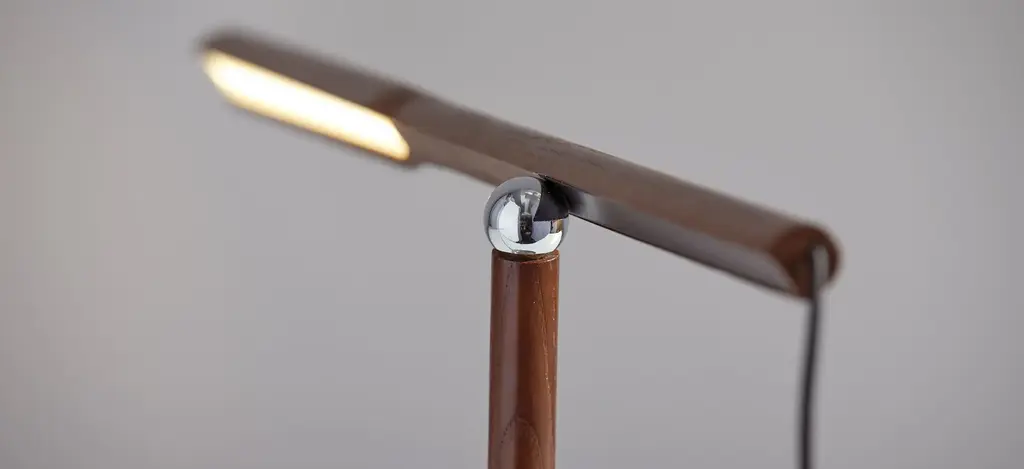 The Gravity LED Desk Lamps have a sleek design as well as a wide range of smooth movements and adjustments. A strong magnetic ball firmly connects the shade arm to the body, allowing for endless adjustability options. Available in both a black and walnut finished Ash wood, this collection adds a touch of modern elegance to any workspace or home office. A solid black curved metal base provides extra stability and a black fabric covered cord adds to the sleek style of the Gravity Collection.