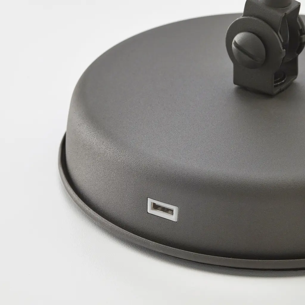 HEKTAR Work lamp - dark gray. You can charge your mobile phone or other devices through the built-in USB port in the lamp. Provides a directed light that is great for reading. You can easily direct the light where you want it because the lamp arm and head are adjustable. 1 USB port.