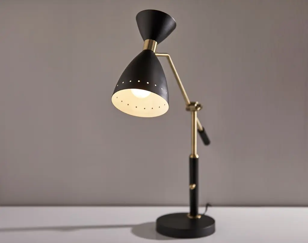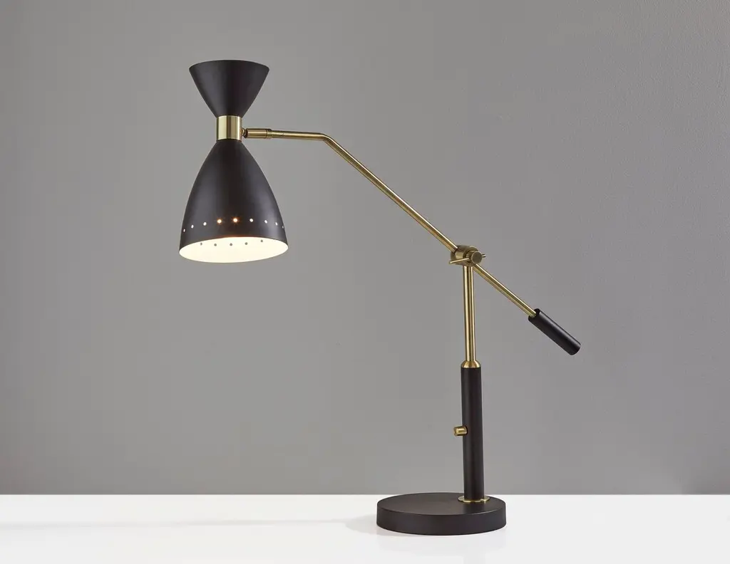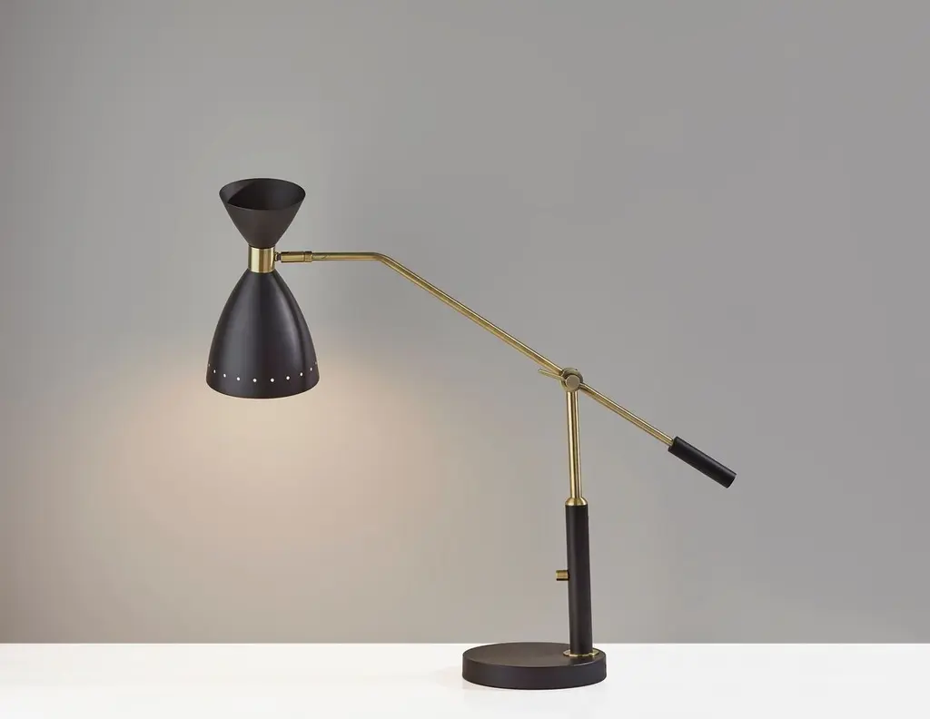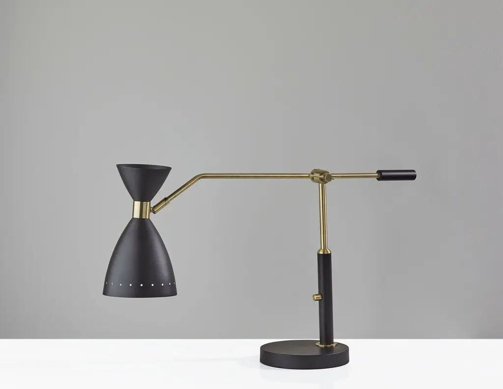 Add some mid-century flare to your workspace or bedroom with the Jax Adjustable Table Lamp. Black and antique brass finishes are mixed to create the quintessential mid-century style.