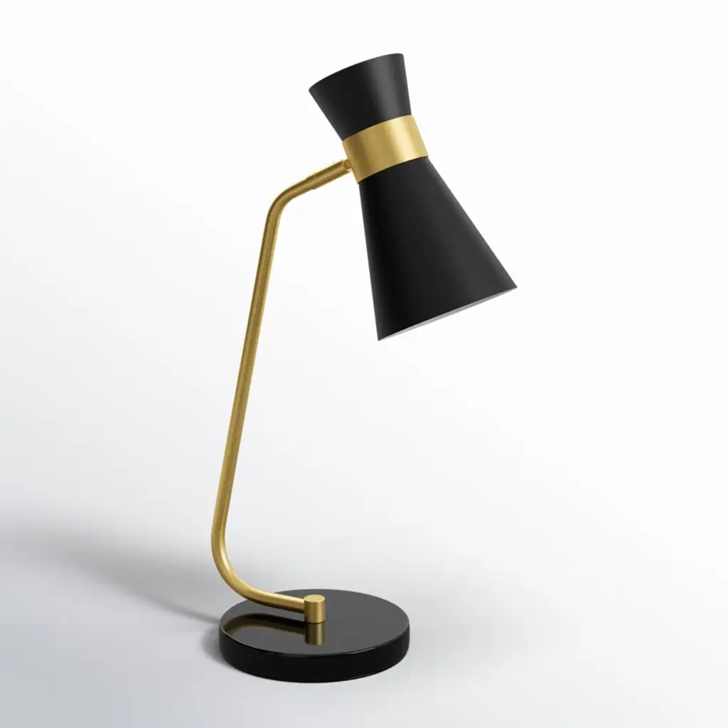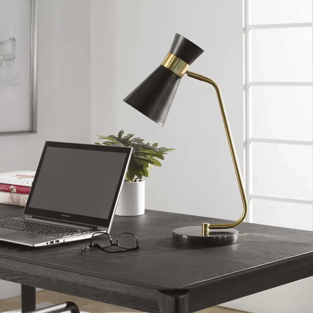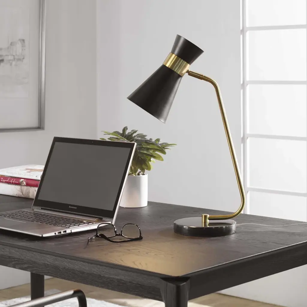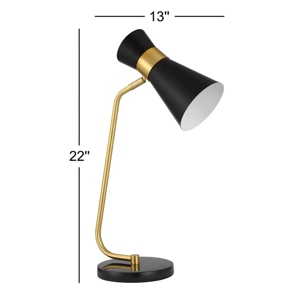 The unique design of this desk lamp will make any work space a little better. Finished in a beautiful gold, and sitting atop a black marble foot, the lamp features a black metal cone like shade that pivots, allowing you to focus better on the task at hand