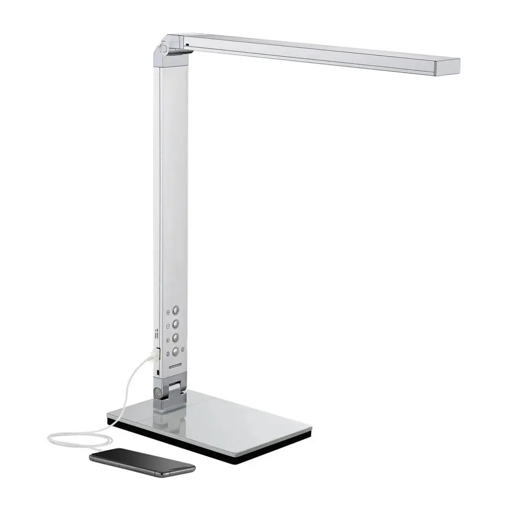 PRODUCT DETAILS: 16 1/2" high as shown. Base is 7 1/2" long x 5" wide. Head is 12 1/2" long. Weighs 2.6 lbs. Built-in 10 watt LED strip. Adjustable color temp from 3000K warm to 6000K cool. 500 total lumens. 5-step touch dimmer sensor. Modern LED USB adjustable desk lamp. Features a USB port built into side of column allows you to easily charge smart phones. USB is rated at 1A. Blue backlight at base when lamp is off. Modern-look vertical column can be tilted forward 45-degrees. Light head can be adjusted 135-degrees up and down and can be folded flat against the column. Silver finish. Aluminum and metal construction. 6-foot long cord.
