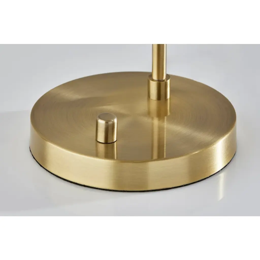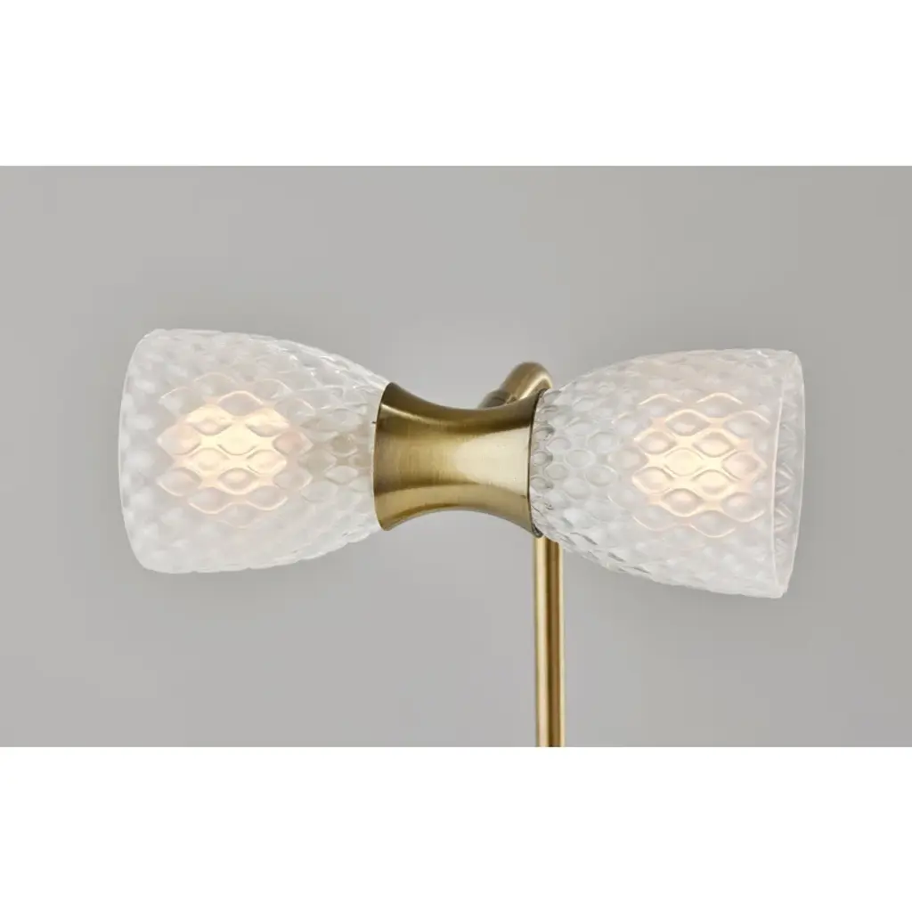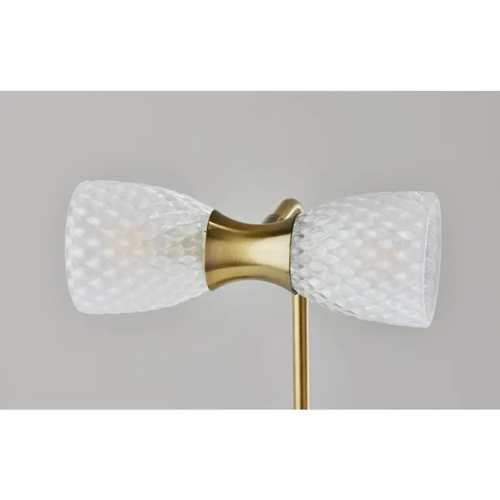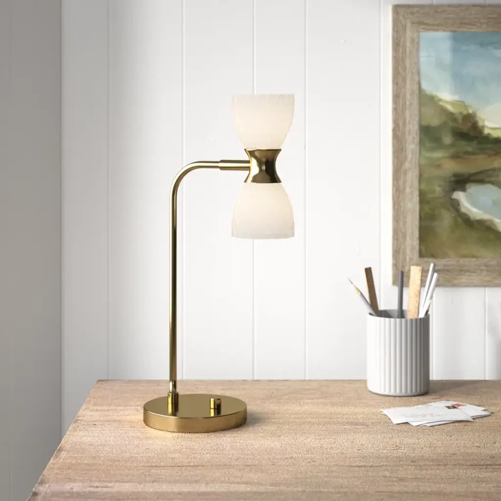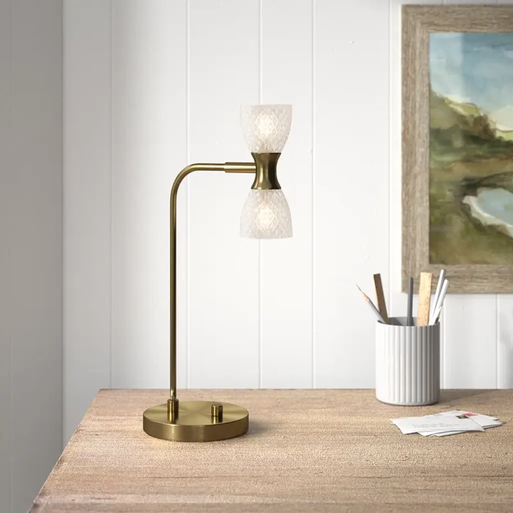 Illuminate your workspace with the elegance and versatility of this LED desk lamp. Crafted from solid brass and showcasing an antique finish, it's a delightful addition to Victorian or farmhouse décor. The dual textured milk glass shades, connected by an hourglass-shaped accent, cast a soft, warm white light from the included 3W replaceable LED bulbs. Adjust the brightness with full-range dimmers to suit your task or mood. Plus, the lamp shade features an articulation point for easy rotation and redirection, offering a variety of lighting options to brighten your day.