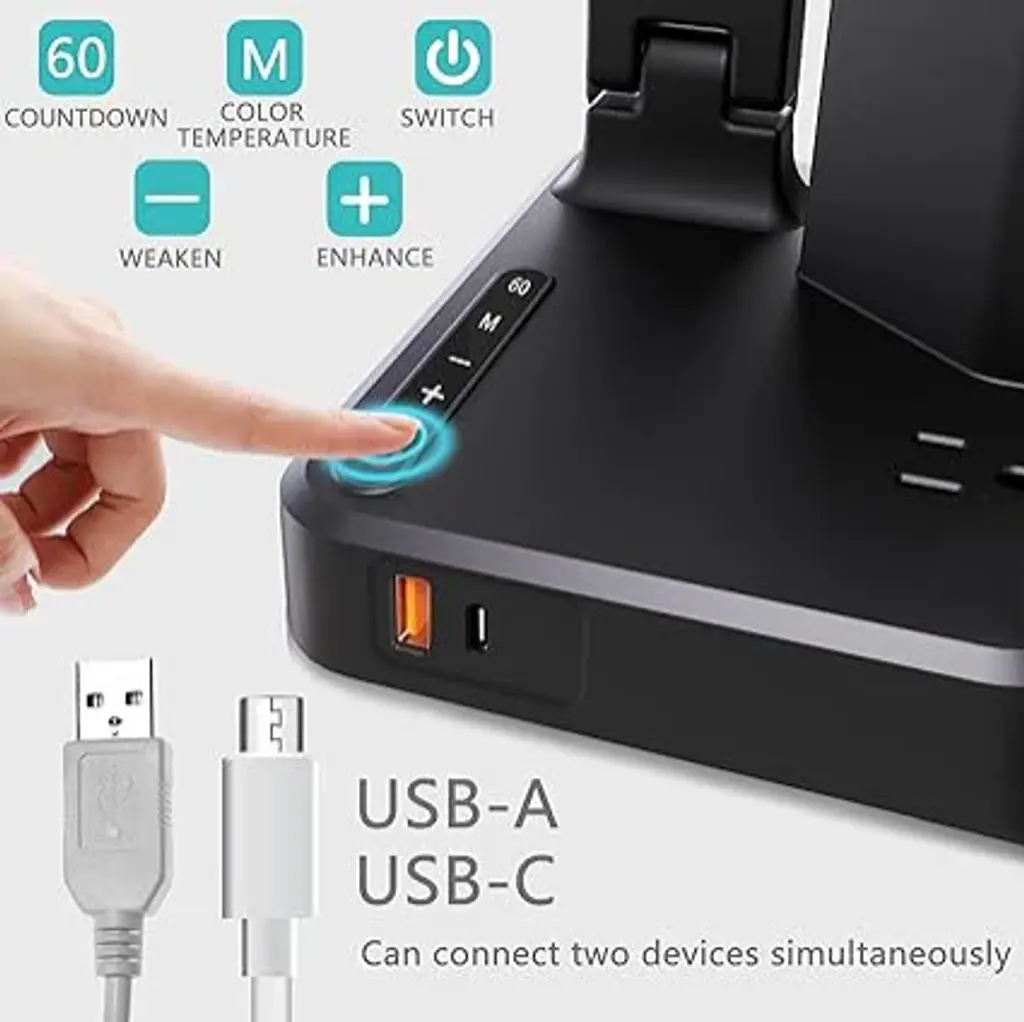 StyleBlack/2 Pen Holders/2 USB A+C/OutletsBrandcozooColorBlackProduct Dimensions6.45"D x 4.76"W x 13.9"HSpecial Feature60 min Auto Timer, Touch Dimmer, Memory Function, No Glare Reflects on Screen, 3 color modes, 3 brightness levels, Eye-Caring, USB Charging Port, Type C Port,AC Outlers,Pen holder60 min Auto Timer, Touch Dimmer, Memory Function, No Glare Reflects on Screen, 3 color modes, 3 brightness levels, Eye-Caring, USB Charging Port, Type C Port,AC Outlers,P"¦ã€?Multiple Functions】The desk lamp with 2 pen holders and 3 types of charging ports (USB, Type-C, AC Outlet).2 Ports USB Charger(5V/4.5A),1 Outlet Power Socket(1250W),memory function, 3 lighting modes, 3 brightness Levels, 60-minute timer, office lamp, night light, task work lamp, dorm arm lamp,reading lamp,computer lamp.Dorm Room Essential for College.ã€?2 Pors Smart USB Charger & 1 Type C Port】 This charging station stand can charge up to 3 devices (such as iPhone, Smartphone, Samsung Galaxy, Nexus, etc) This is the best charging companion for your Apple watch, iPhone,iPad and other USB devices.ã€?1 Standard AC Outlet】It"™s best choice for charge your laptops, printers,bluetooth speakers,Xbox one,PS4 and more in your home and office. The AC outlets and USB Ports are always under working conditions without switch.ã€?3 Adjustable Brightness & Color Temperature】Touch sensitive panel allow you to adjust different brightness and lighting modes(CCT) to suit your mood with a simple slide of the finger. Enjoy the most comfortable setting every time for working, studying, relaxing or getting ready to sleep.Back to school essentials.ã€?QUALITY GUARANTY】Confidence in our products, we provide 90-Day Money Back Guarantee and 24-month warranty (we will replace new one to you instead of repair) that ensures you a total hassle-free purchasing. If there is any quality issue for this desk lamp or you are not happy with your purchase, please do not hesitate to contact us.Suitable for home, office, study room, reading room, dorm room.Ideal gift for kids, family, friends.lampLAMP Desk Organizer Backlit Touch Control ButtonWith backlit touch control button,just simply touching the button to adjust the color lighting to the perfect setting in the darkness.Freely Adjustable AngleFeaturing 1 supporting arms and 3 rotating joints, you can freely adjust to cast light in any direction that you like.Desk OrganizerThe organizer desk lamp is both stylish and functional. Two organizational parts in the base are perfect for storing stationery and holding up your phone.desk lamp with pen holderDESK LAMP2 USB Charging Ports( USB A and USB Type C Ports )The USB charging ports integrated into the lamp base is designed to keep your mobile phones, tablets, kindle readers, iPad, iPhone or any other devices charging. The USB port functions regardless of whether the lamp is on or off.1 Standard AC OutletIt"™s best choice for charge your laptops, printers,bluetooth speakers,Xbox one,PS4 and more in your home and office.(The AC outlets and USB Ports are always under working conditions without switch.Pen Holders & Desktop OrganizerThis table lamp is designed with 2 pen cups keeps your crowded desk or small space organized.No need to purchase other holders on your desktop.A great multi-functional lamp in your desk.Eye-friendly designWith 48 high-quality LED beads for emitting soft, stable and non-flickering light, which is friendly to your eyesAdjustable Angle & Space-savingWith 180° flexible arm and 90° base axis, you can effortlessly adjust the lamp for ideal illuminating angle and coverage Foldable lamp head and arm for most space saving, suitable to be placed/stored in book shelf, bag, suitcase. 6.45 x 4.76 x 13.9 inches; 1.94 Pounds