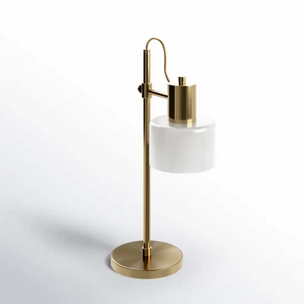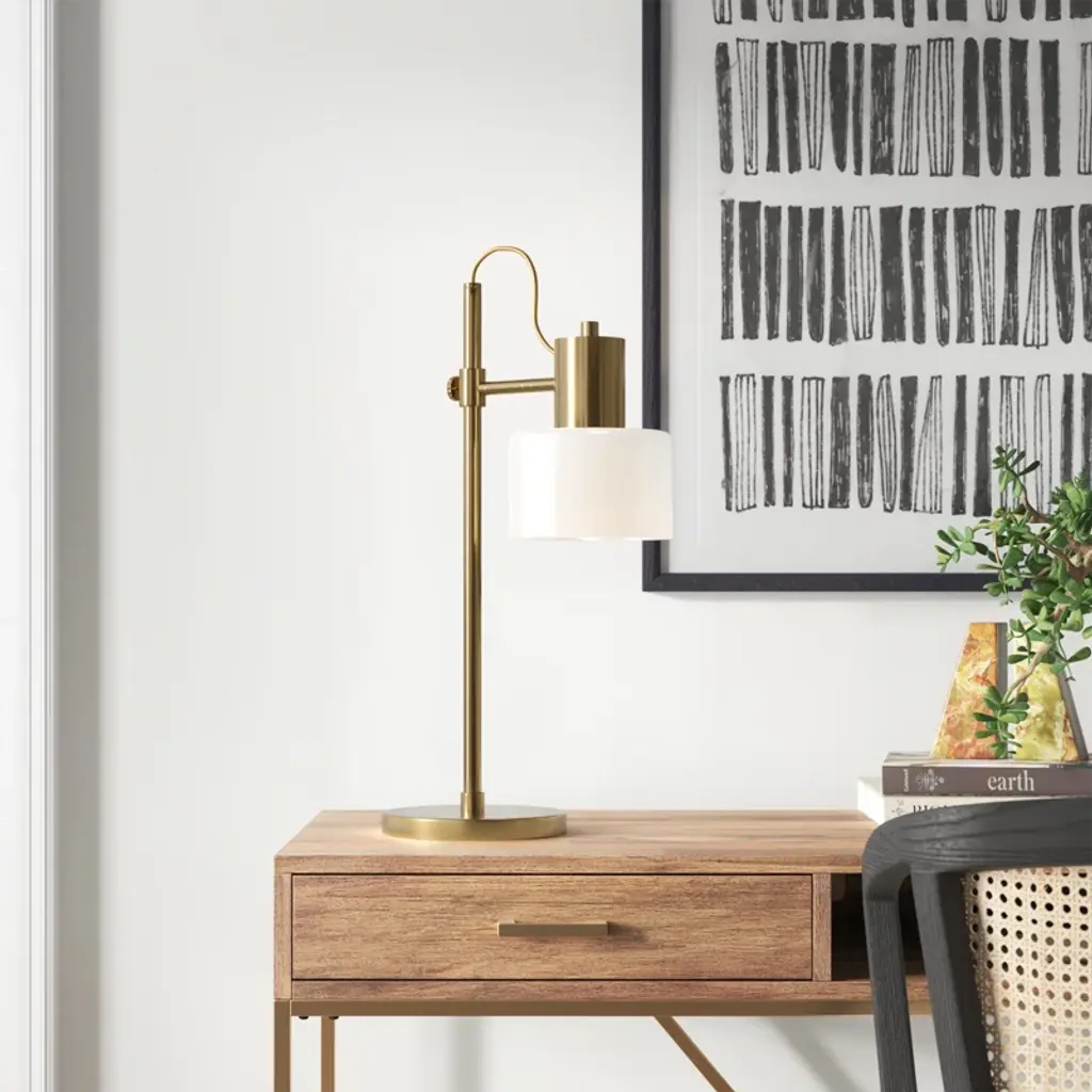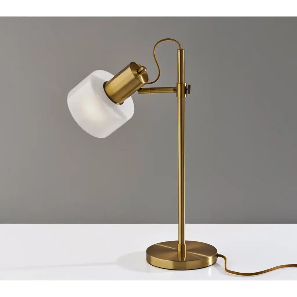 Introducing the A227ABF6F9624D9C90BC13A206E2141D Rhodes desk lamp, a refined and functional lighting solution that effortlessly combines vintage aesthetics with contemporary design. This desk lamp boasts an antique brass finish that adds a touch of timeless elegance to your decor. Its glass shade is a study in contrast, featuring a glossy white exterior for a modern twist, while the frosted interior diffuses a soft and inviting glow. With a height of 23 inches and an adjustable shade, the Rhodes desk lamp offers both focused illumination and style, making it a versatile addition to your workspace. Designed for user-friendly operation, this lamp features an on/off rotary switch conveniently located on the shade, allowing you to control the lighting with ease. The beige fabric-covered cord complements the lamp's design, adding a subtle touch of sophistication. The Rhodes desk lamp seamlessly combines form and function, making it an ideal choice for enhancing the ambiance of your workspace.