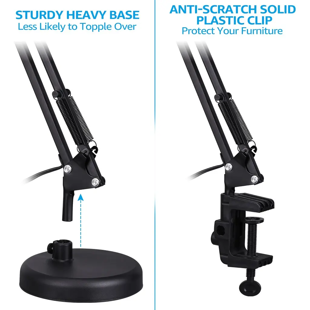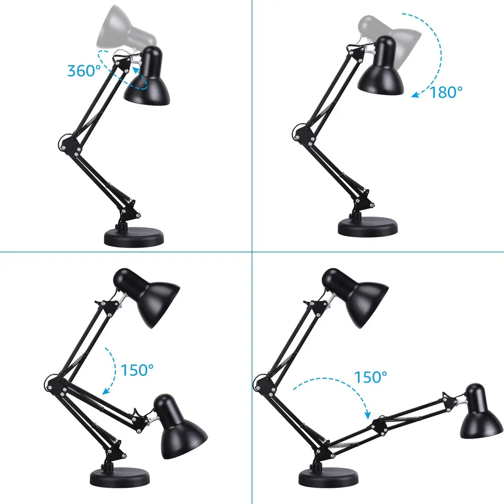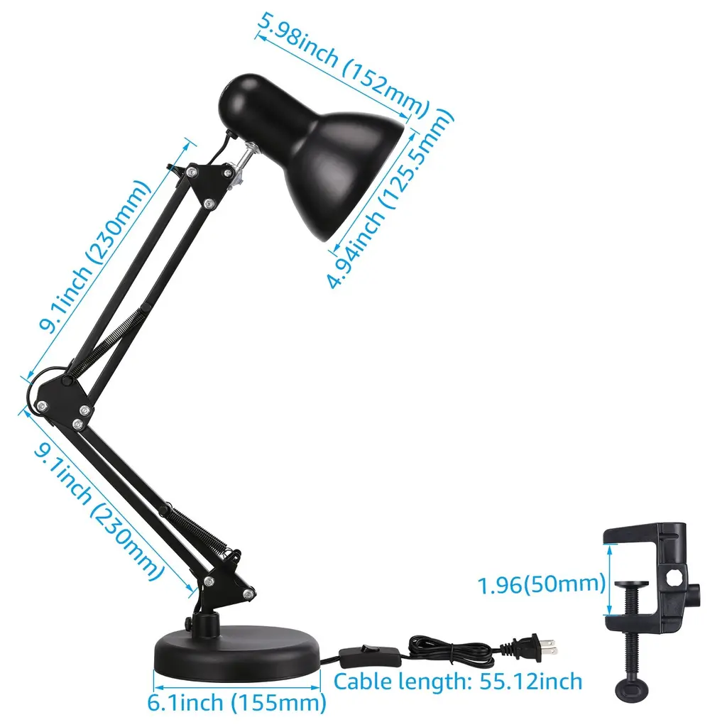 Extremely FlexibleThis incredible desk lamp lights up anywhere you need by swinging the arm and turning the lamp shade with ease. It also can stand on a table as well as being able to clamp on to places like desks, shelves and headboards thanks to its user friendly. You can either stand this lamp up on its own or with the adjustable c-clamp, you can clamp it onto any surface either vertical or horizontal up to 2” wide. For places like the school, dorm room, office, bedroomPremium QualityThe solid metal body, well-machined c-clamp and the weighted base make it sturdy and give it a consistent and reliable quality and all the joints will move smoothly. The lamp stands firmly thanks to the weighted base and the swing arm and lamp shade are made from solid metal with a black finish, making them durable and exquisite to look at. The power plug is UL-listed, making it safe to useUser FriendlyLight up a large area and move its position with the flexible spring-balanced adjusted arm that can extend up to 18" and the rotatable base and shade. Its slim shape and 55” power cable means you can place it anywhere without taking up too much space and the easy to use on/off rocker switch ensures day-to-day use.Bulb ReplaceableFit for a bulb that is 40W max and both E26 and E27 bases can be used. A19 bulbs are compatible. This lamp comes with a 12-month warranty and friendly, lifetime customer service. (The bulb is not included and needs to be purchased separately)SpecificationsVoltage: 120VMaximum wattage: 40WBase: E26/E27Maximum opening of clamp: 2inch (50mm)Cable length: 55InchColor: Black