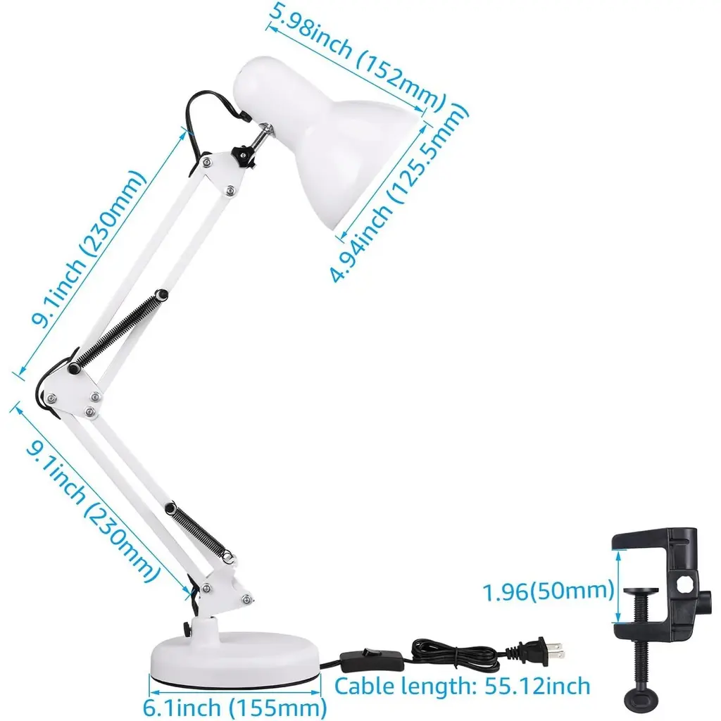 Extremely FlexibleThis incredible desk lamp lights up anywhere you need by swinging the arm and turning the lamp shade with ease. It also can stand on a table as well as being able to clamp on to places like desks, shelves and headboards thanks to its user friendly.Premium QualityThe solid metal body, well-machined c-clamp and the weighted base make it sturdy and give it a consistent and reliable quality and all the joints will move smoothly.WarrantyComes with a 12-month warranty for your rights and benefits as a customer, satisfaction guaranteed.Our missionAt TorchStar, our goal is to provide our customers with quality, energy-saving lighting products at affordable prices. With expertise in LED technology, our products are not only superior in performance, but also make your lighting experience both enjoyable and comfortable anytime, anywhere.Specifications:Voltage: 120VMaximum wattage: 40WBase: E26/E27Maximum opening of clamp: 2inch (50mm)Cable length: 51 inches